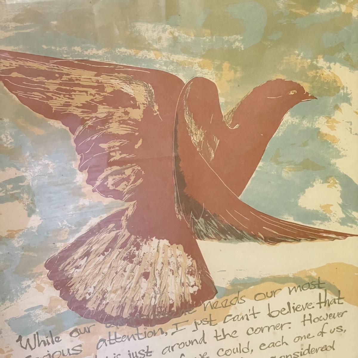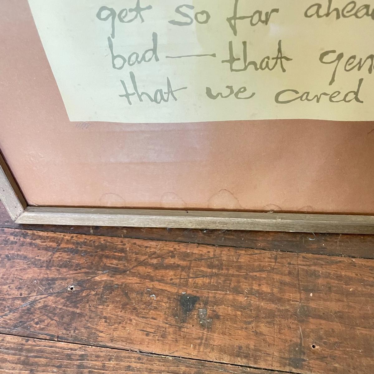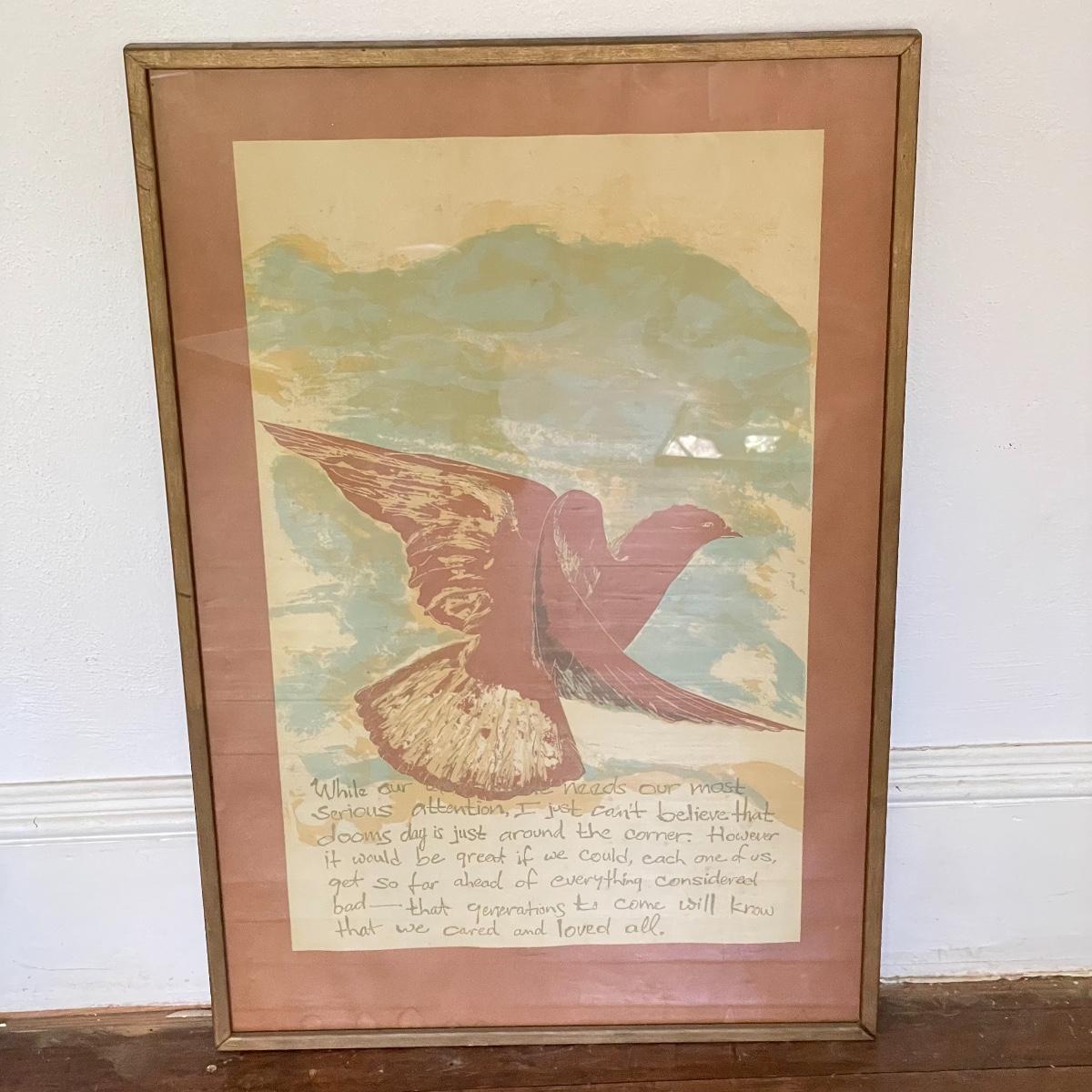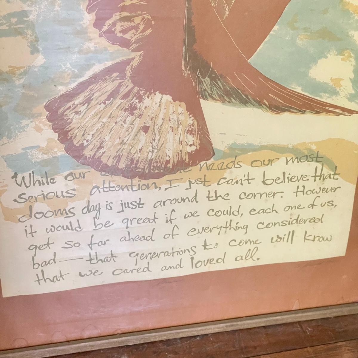 “Peace” pencil signed and numbered 11/18. The large wood frame measures 24” x 36” and has a loose bottom right corner. Art shows water spots near the bottom, see images. Shipping available. Please call UPS with dimensions at 828-252-6930 for a shipping quote prior to bidding.