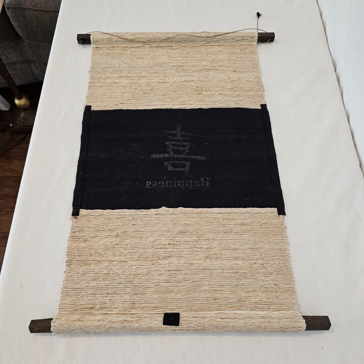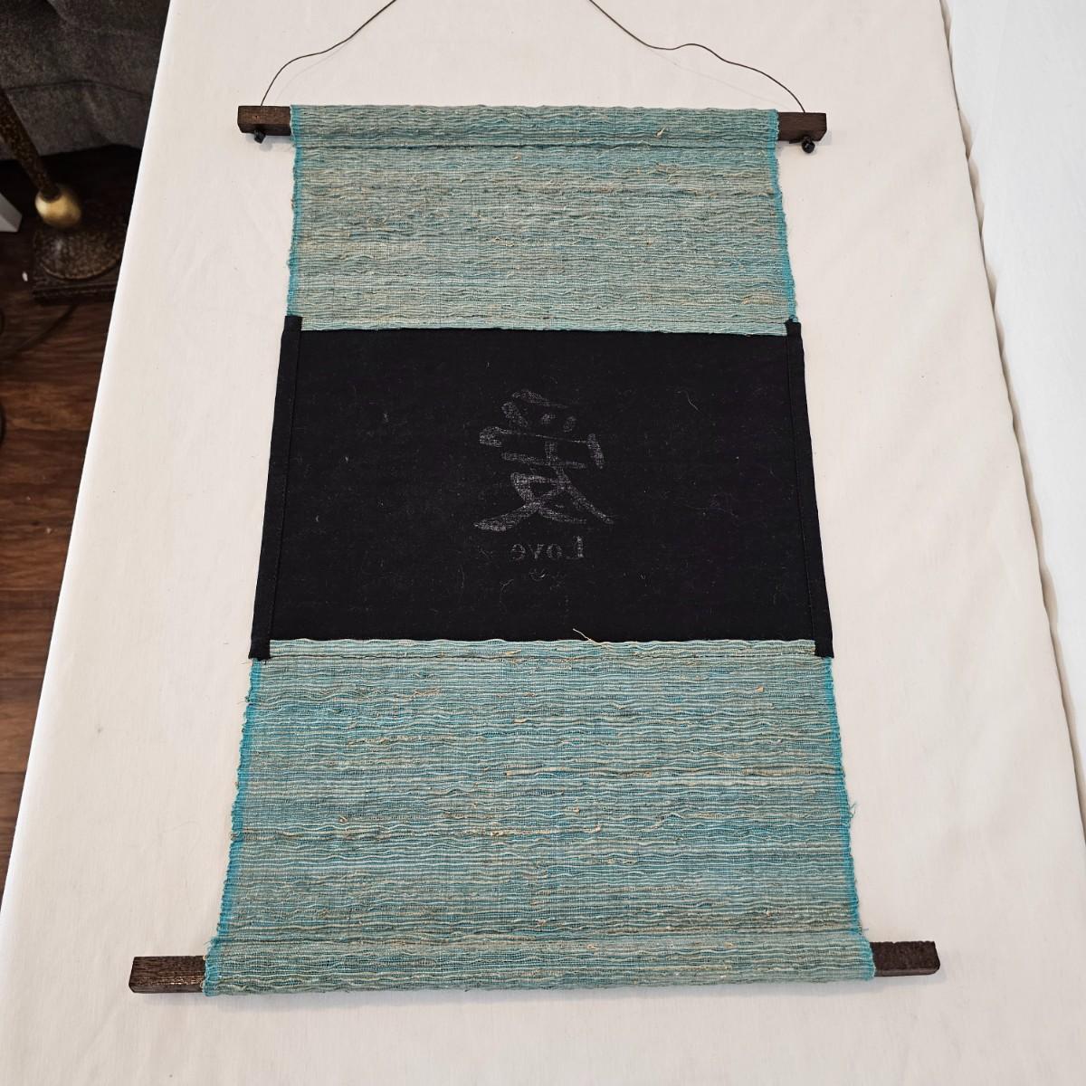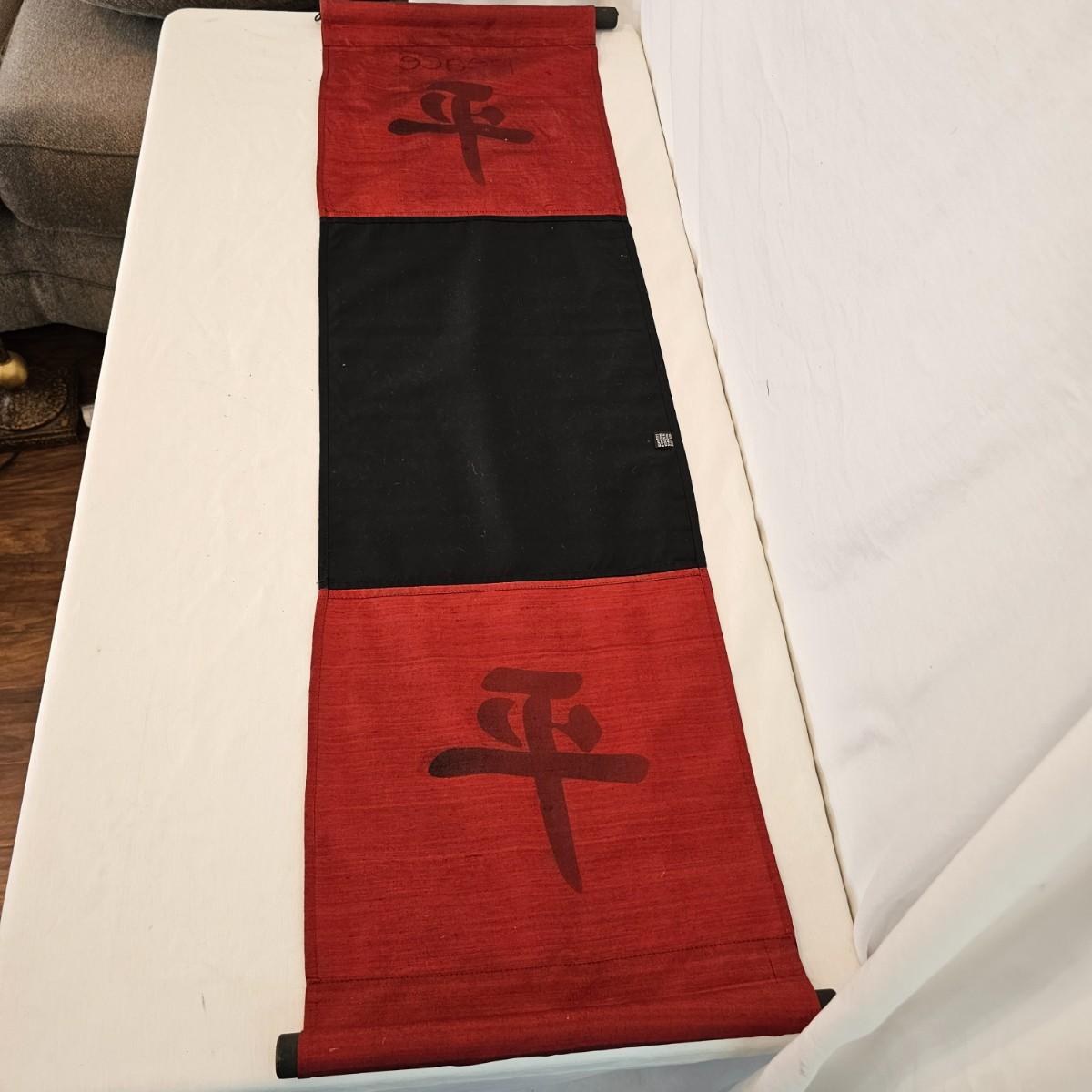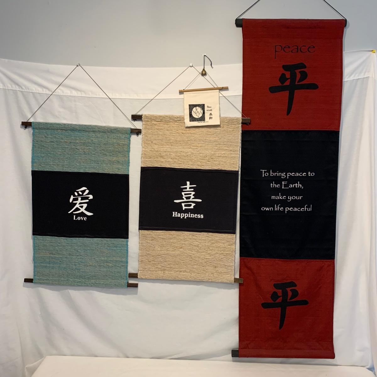 Four wall hangings with the theme of peace, love, and happiness. They are all fabric on wooden rods and hang with string. The large red Peace hanging is 13.5” x 48”H. Love and Happiness are 14” x 23”H. These measurements do not include the string or the rods. The small Peace on Earth hanging has a little bell.