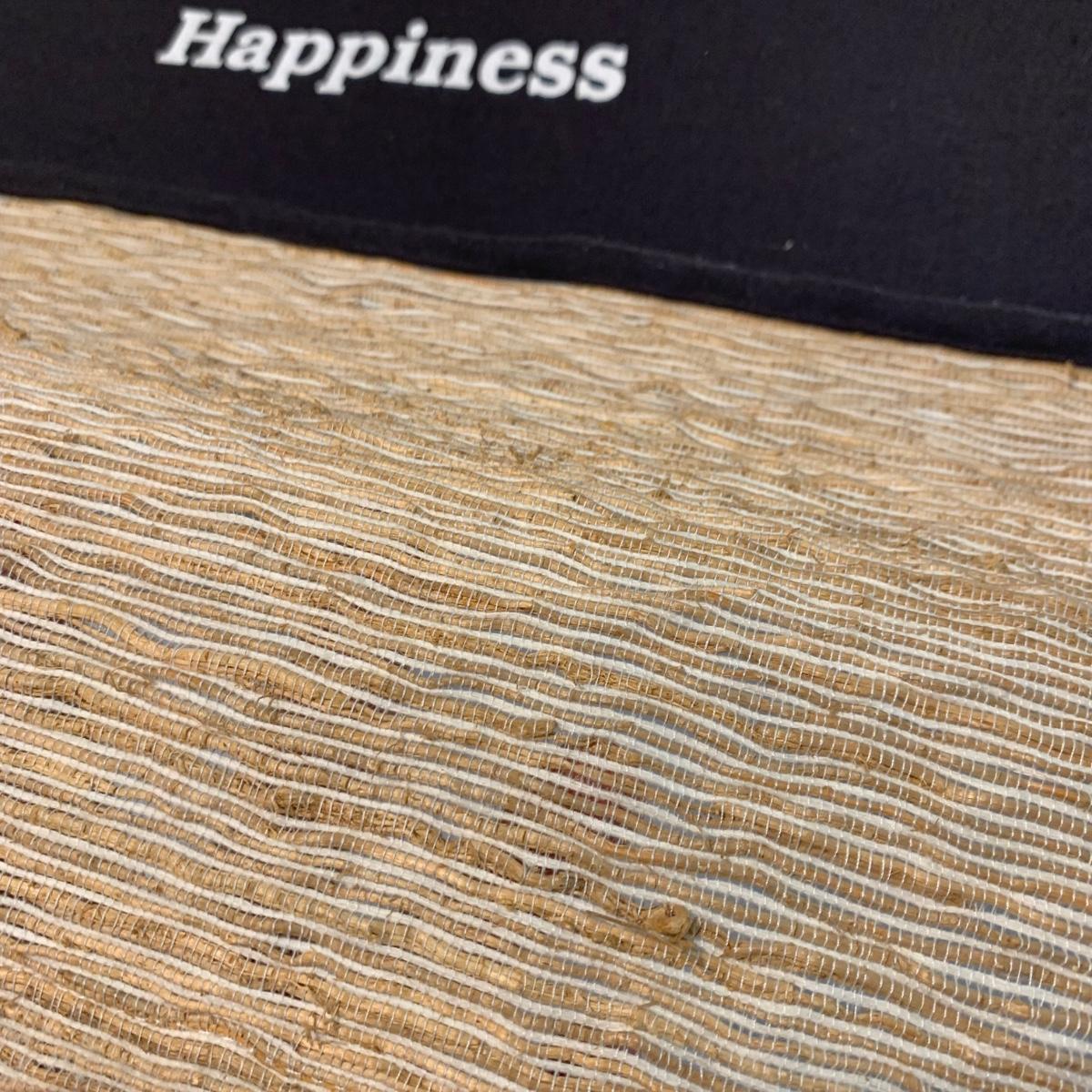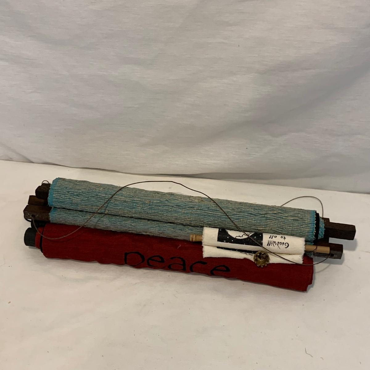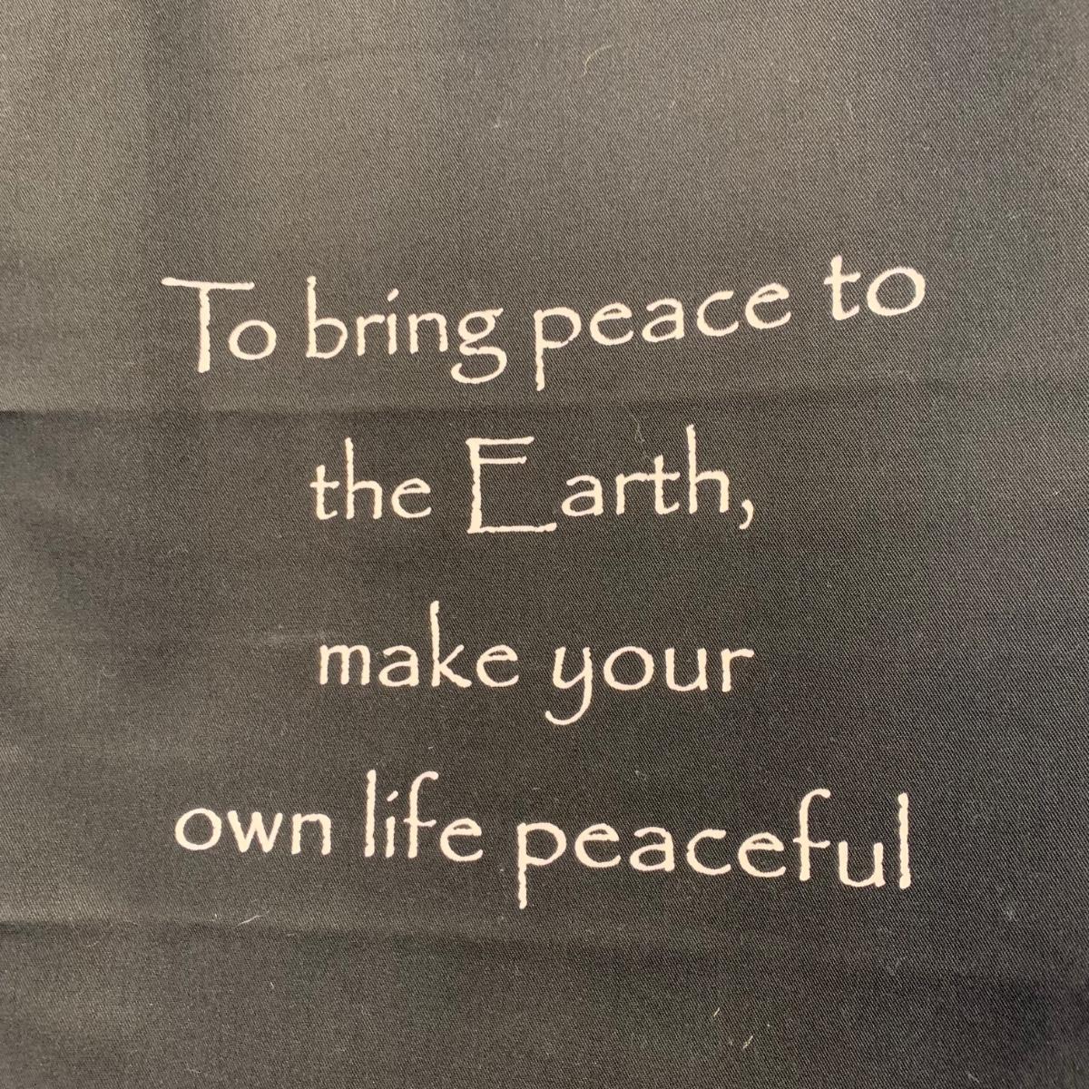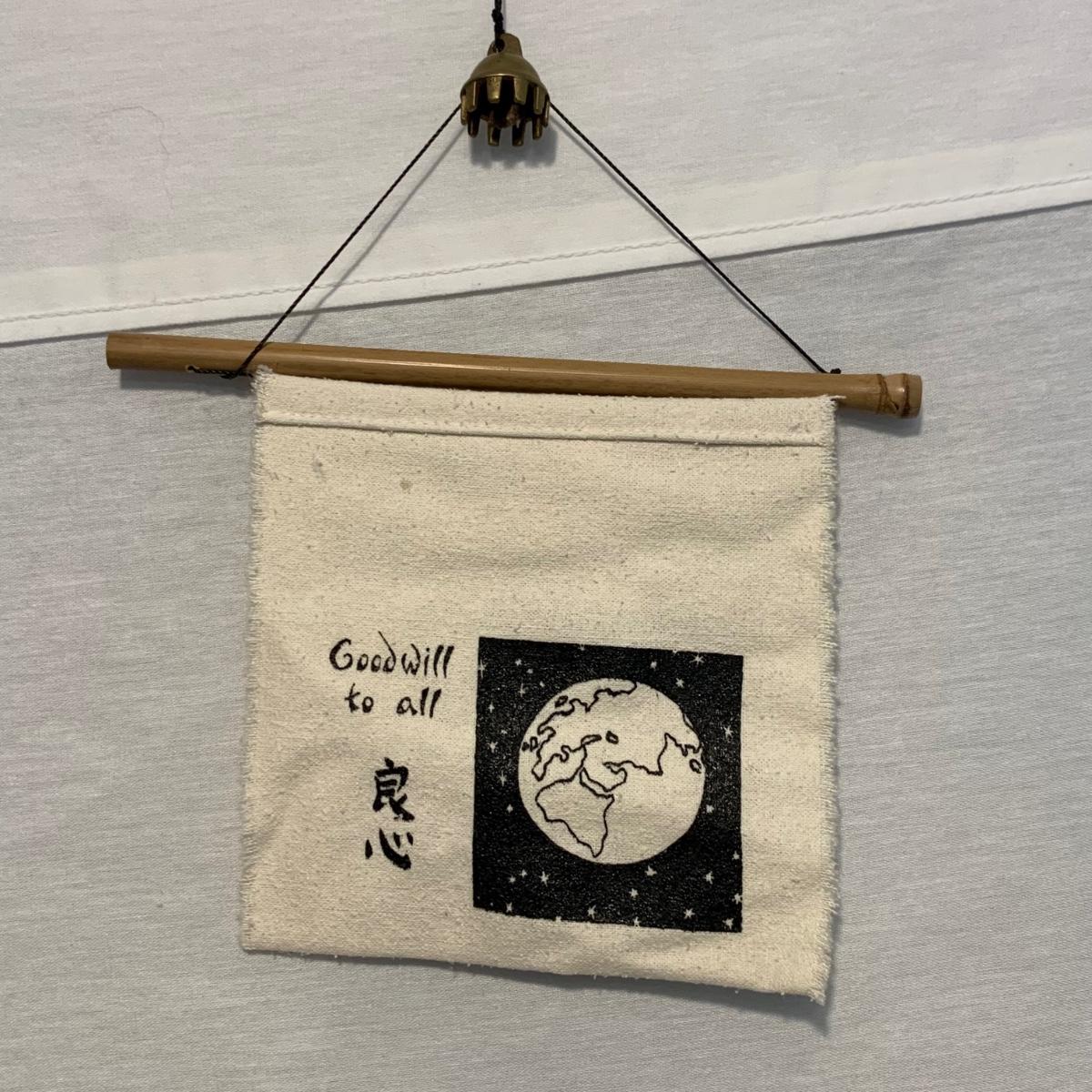 Four wall hangings with the theme of peace, love, and happiness. They are all fabric on wooden rods and hang with string. The large red Peace hanging is 13.5” x 48”H. Love and Happiness are 14” x 23”H. These measurements do not include the string or the rods. The small Peace on Earth hanging has a little bell.