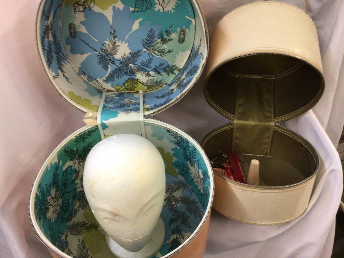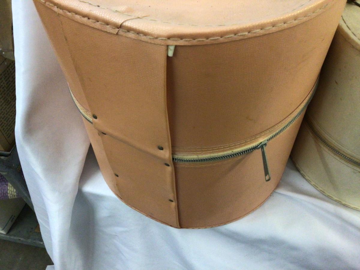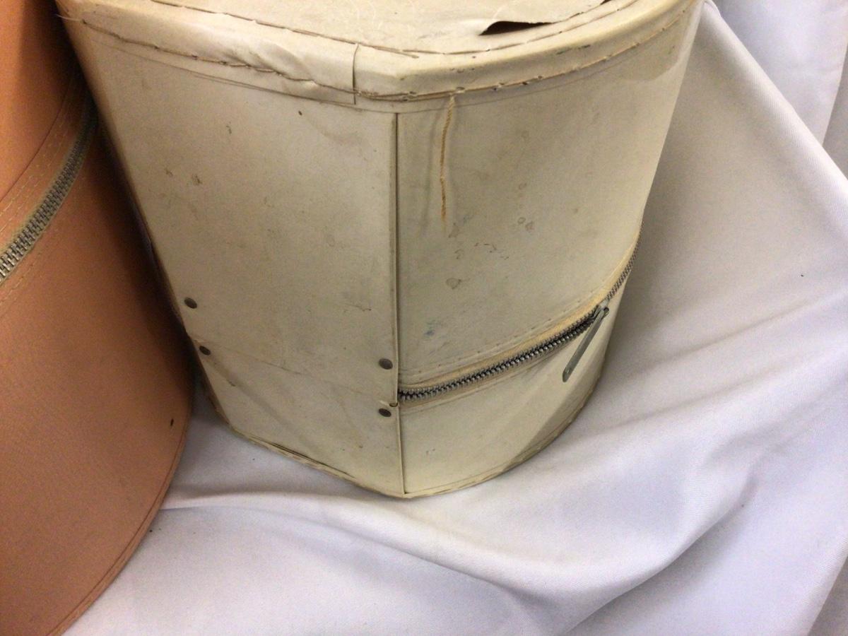You get a large peach color hat box with a styrofoam head inside. They both are open zippered, which work nice and smooth. They need a little cleaning but otherwise in really good condition.