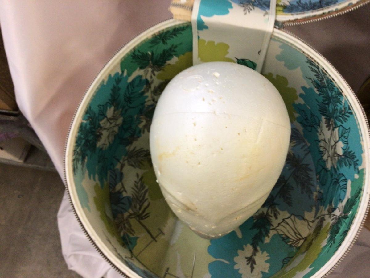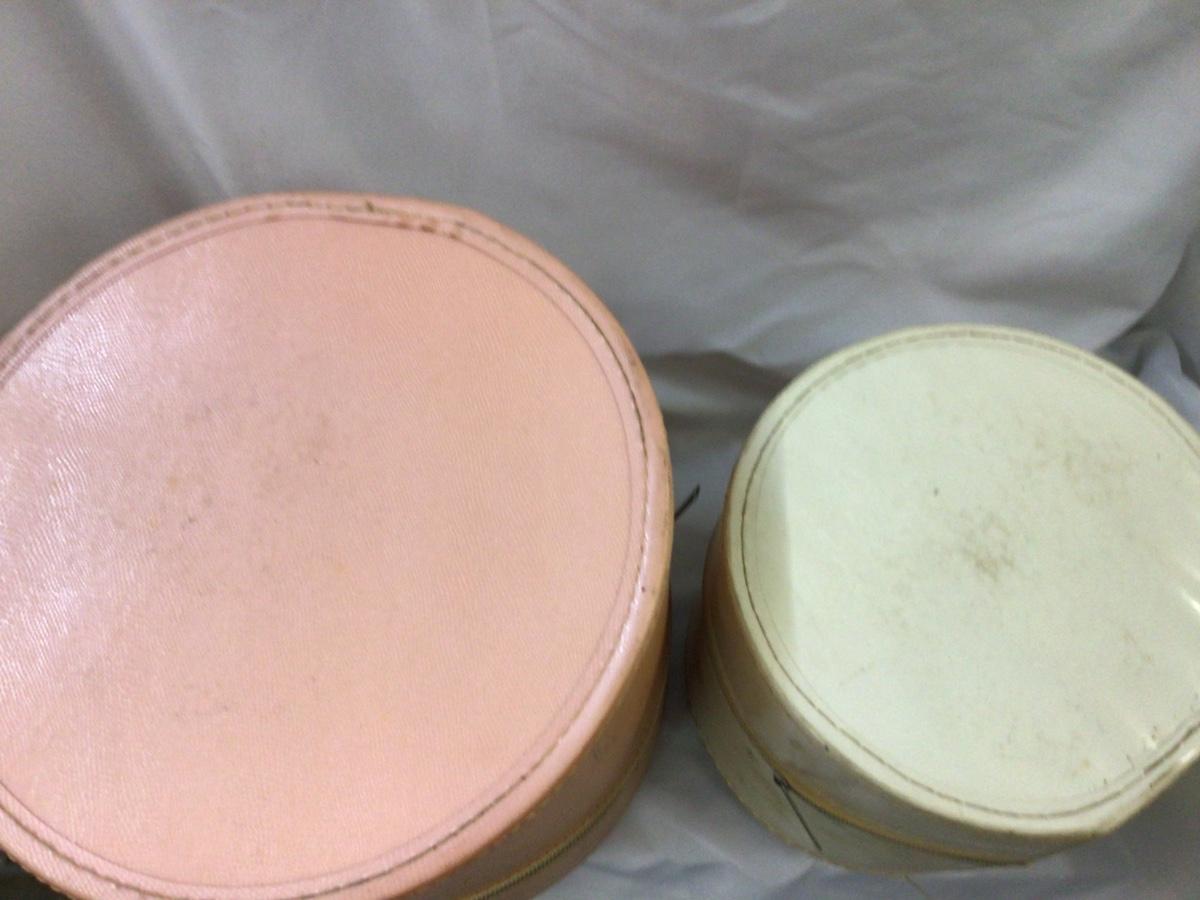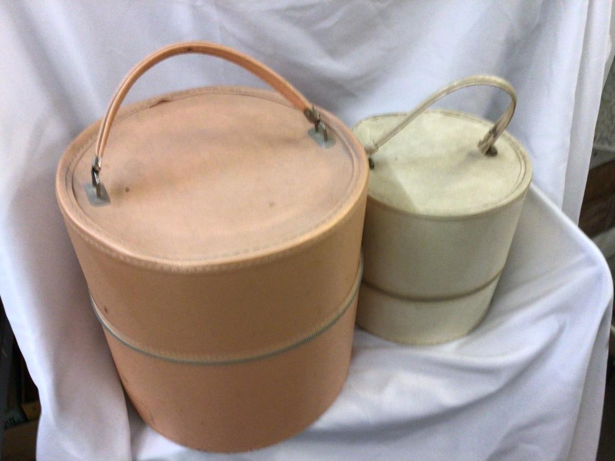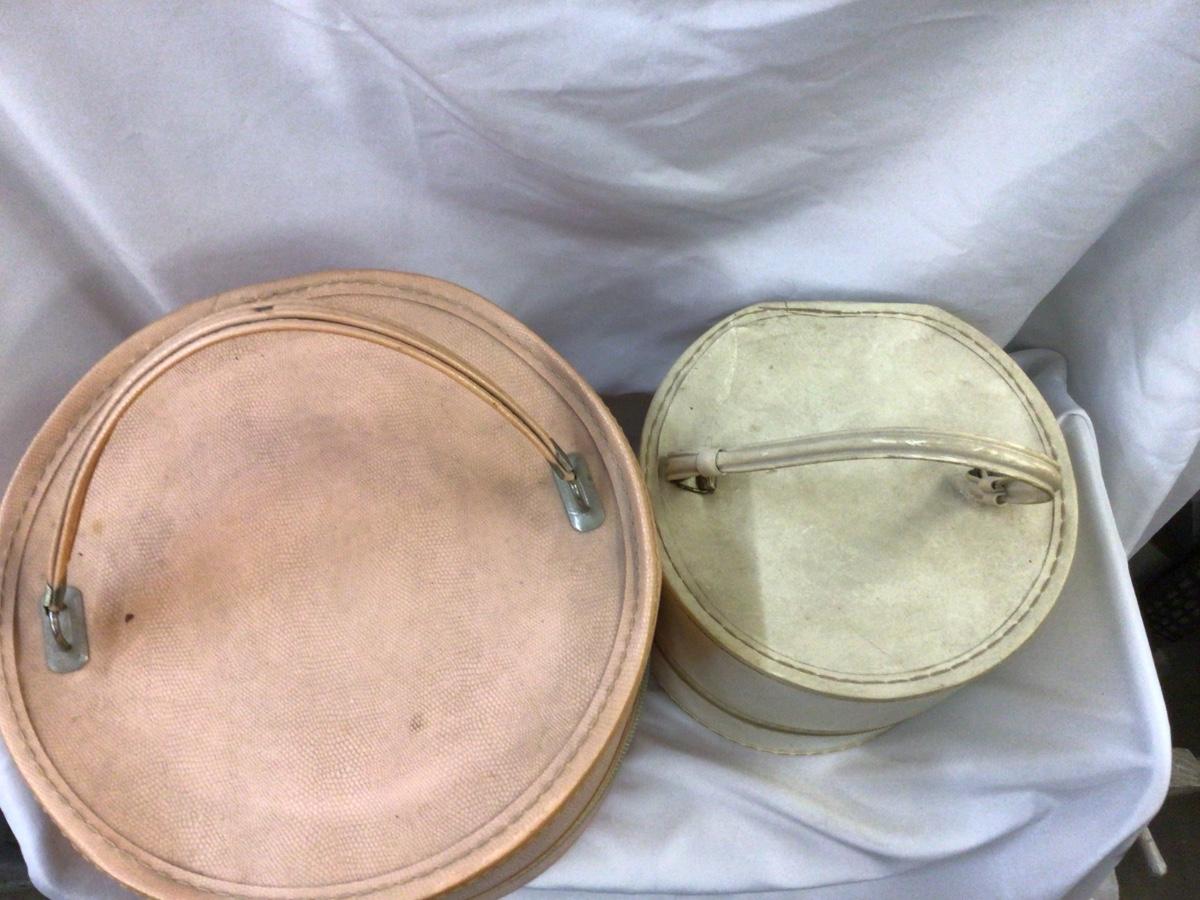 You get a large peach color hat box with a styrofoam head inside. They both are open zippered, which work nice and smooth. They need a little cleaning but otherwise in really good condition.