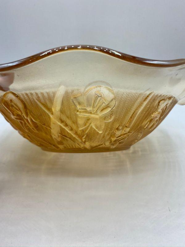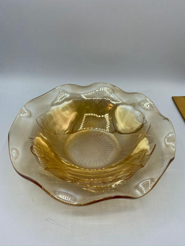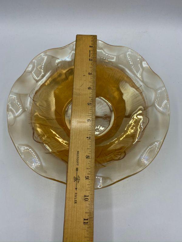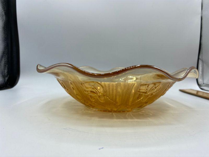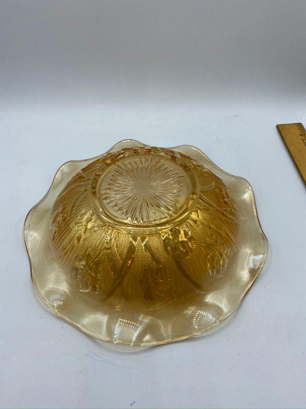Peach luster ruffled edge bowl. Great fruit bowl. About 10" wide. Flower pattern sides. Good Condition.