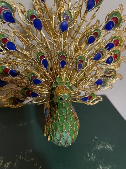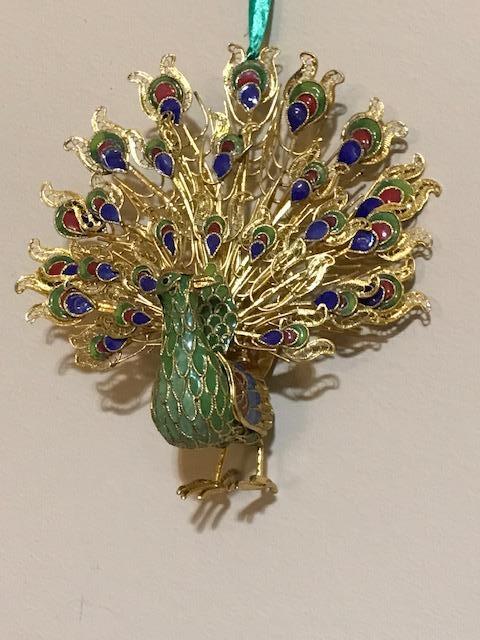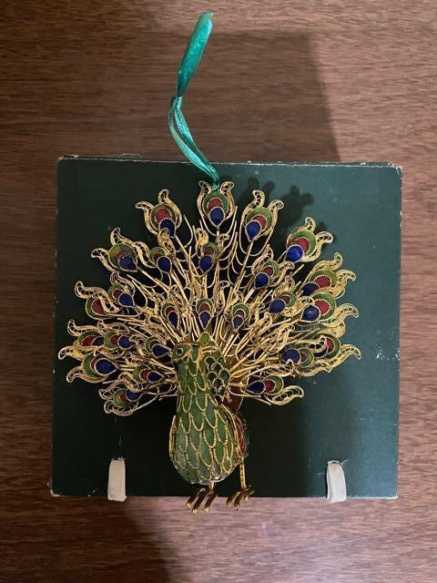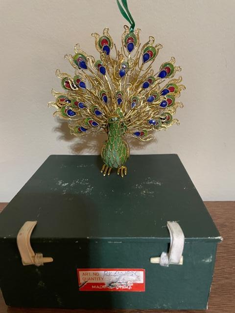 Peacock Enameled Ornament plus presentation box. Ornament is 5"W x 2.5"D x 5.24"H