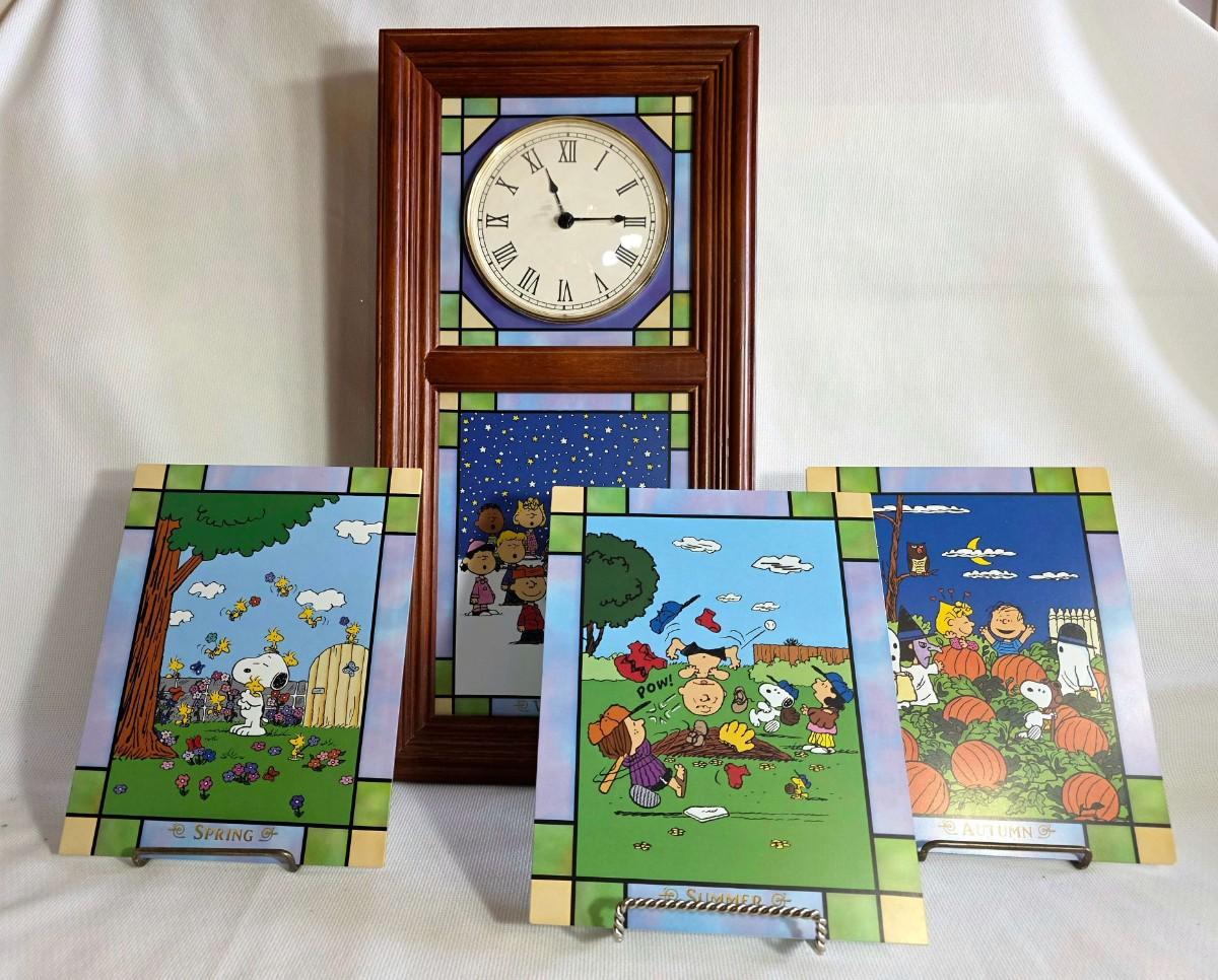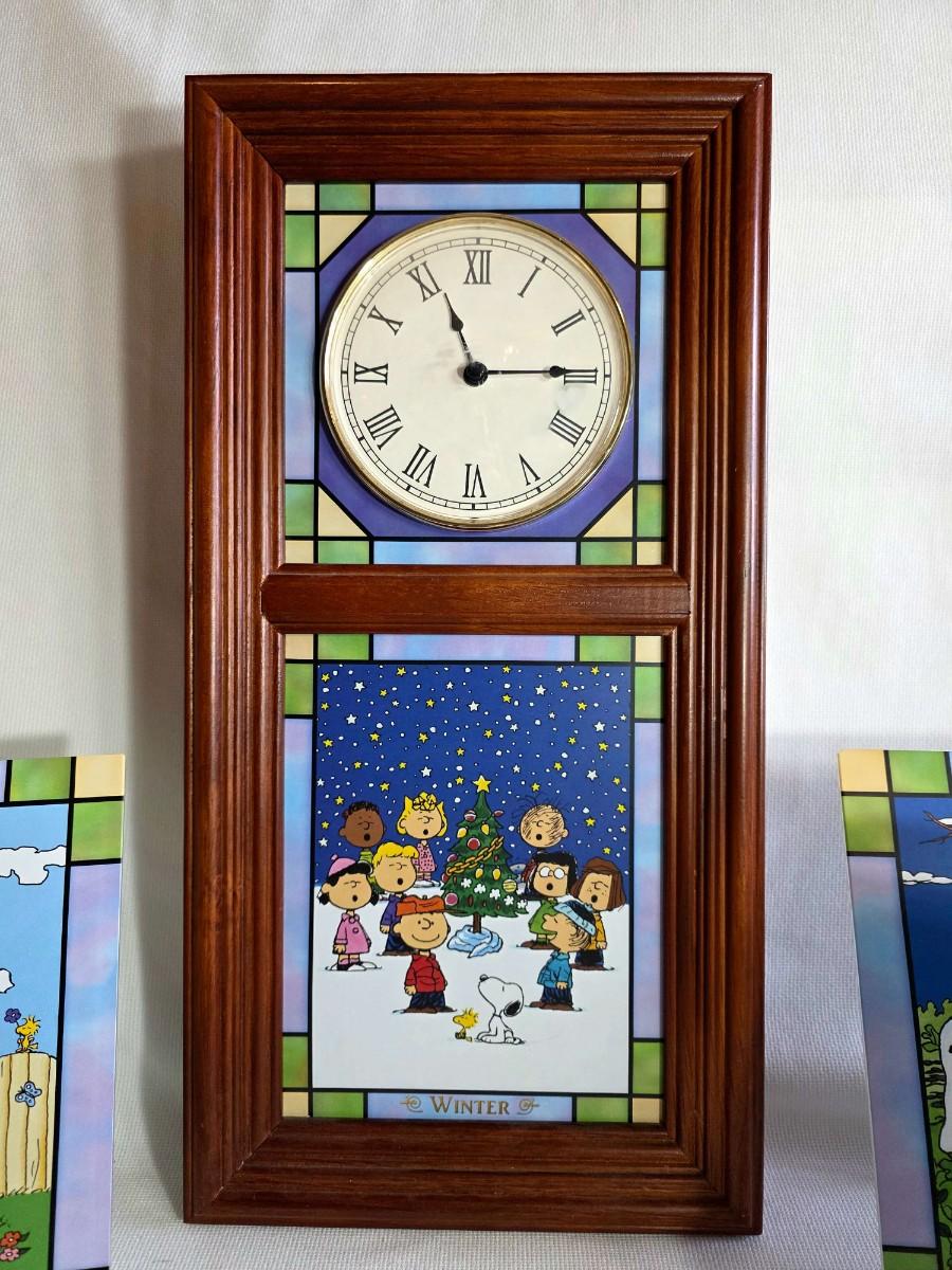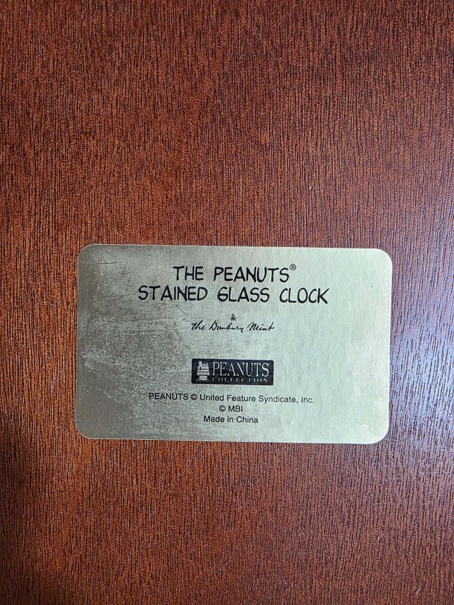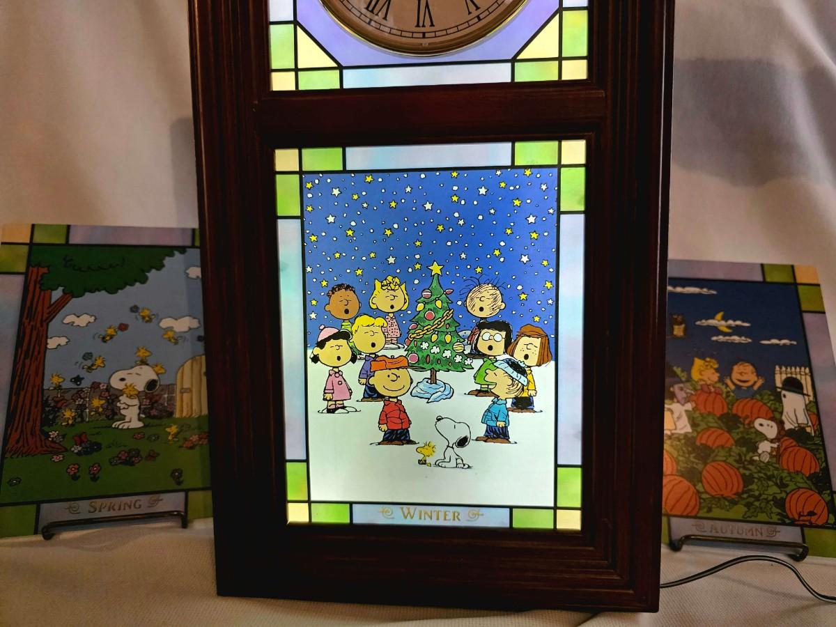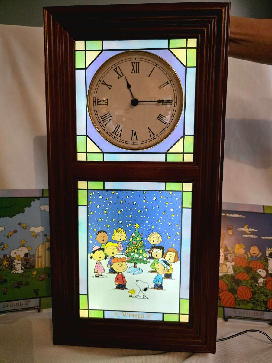 Danbury Mint, "Peanuts Stained Glass Clock" includes all 4 seasons-stained glass pieces. Tested and clock and lights are working.