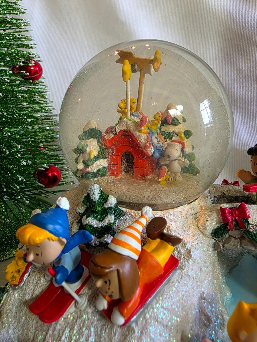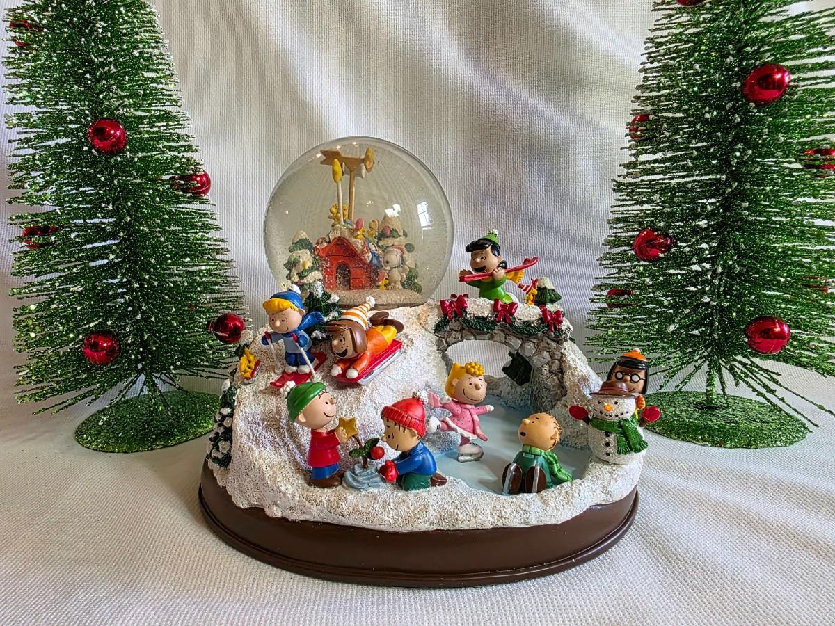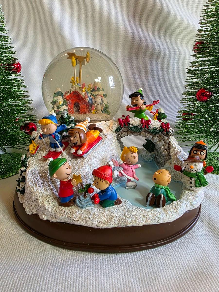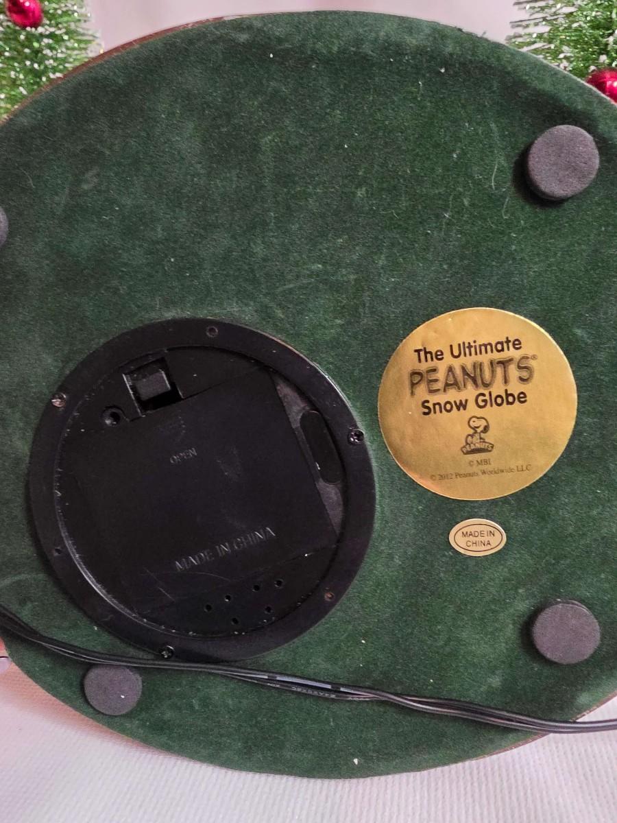 Danbury Mint Peanuts Ultimate Snow Globe. Includes the original adapter which works the lights; however, the music and snow globe are not working. When we tested with new batteries, it played one song, but the music has not played since. The snow globe gives one quick burst then stops. The snow globe is a little cloudy and yellowish in color with age. But this piece is still super cool!