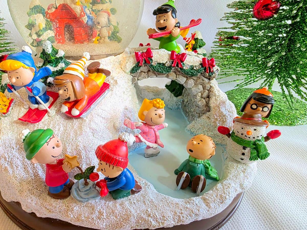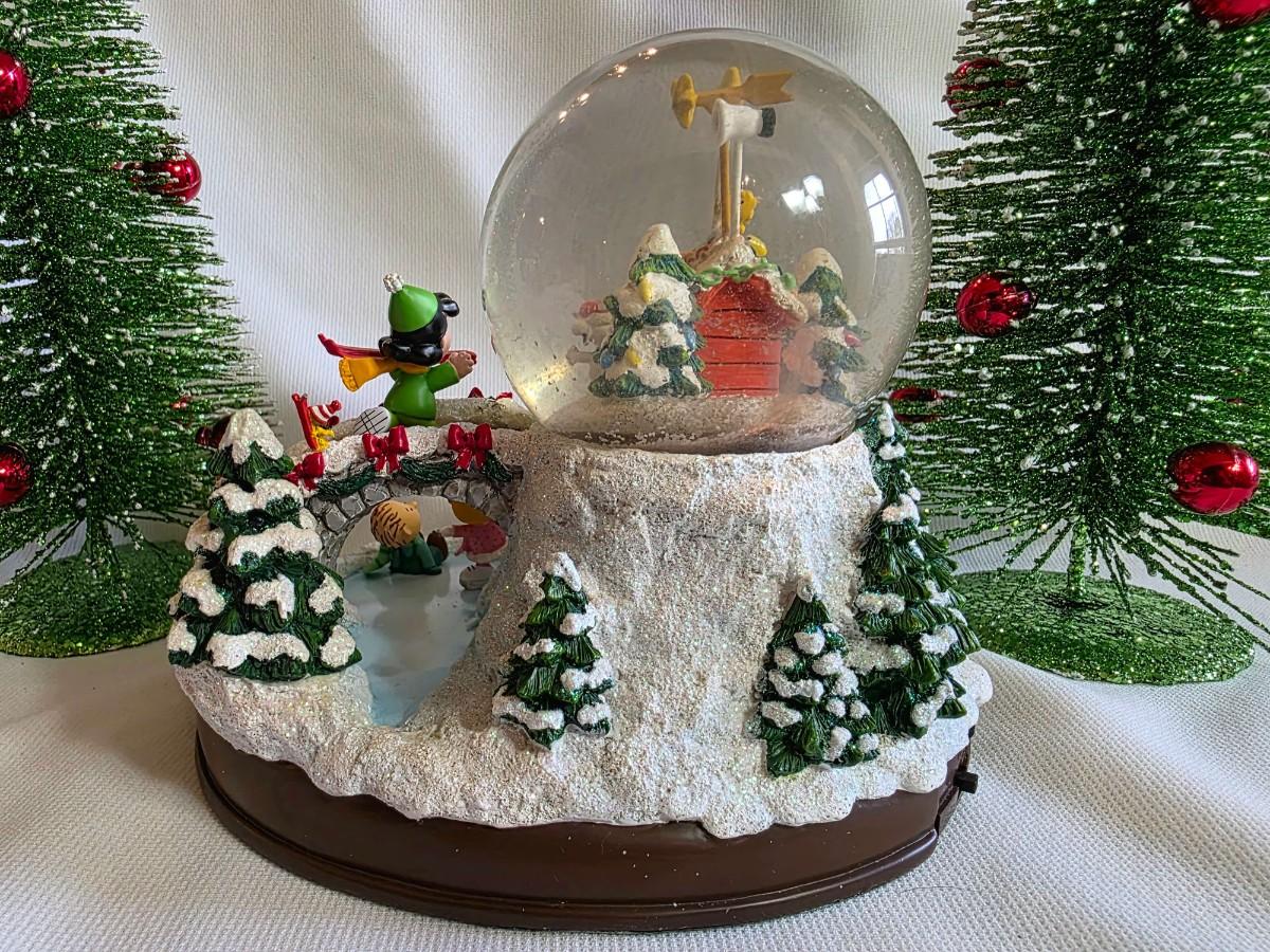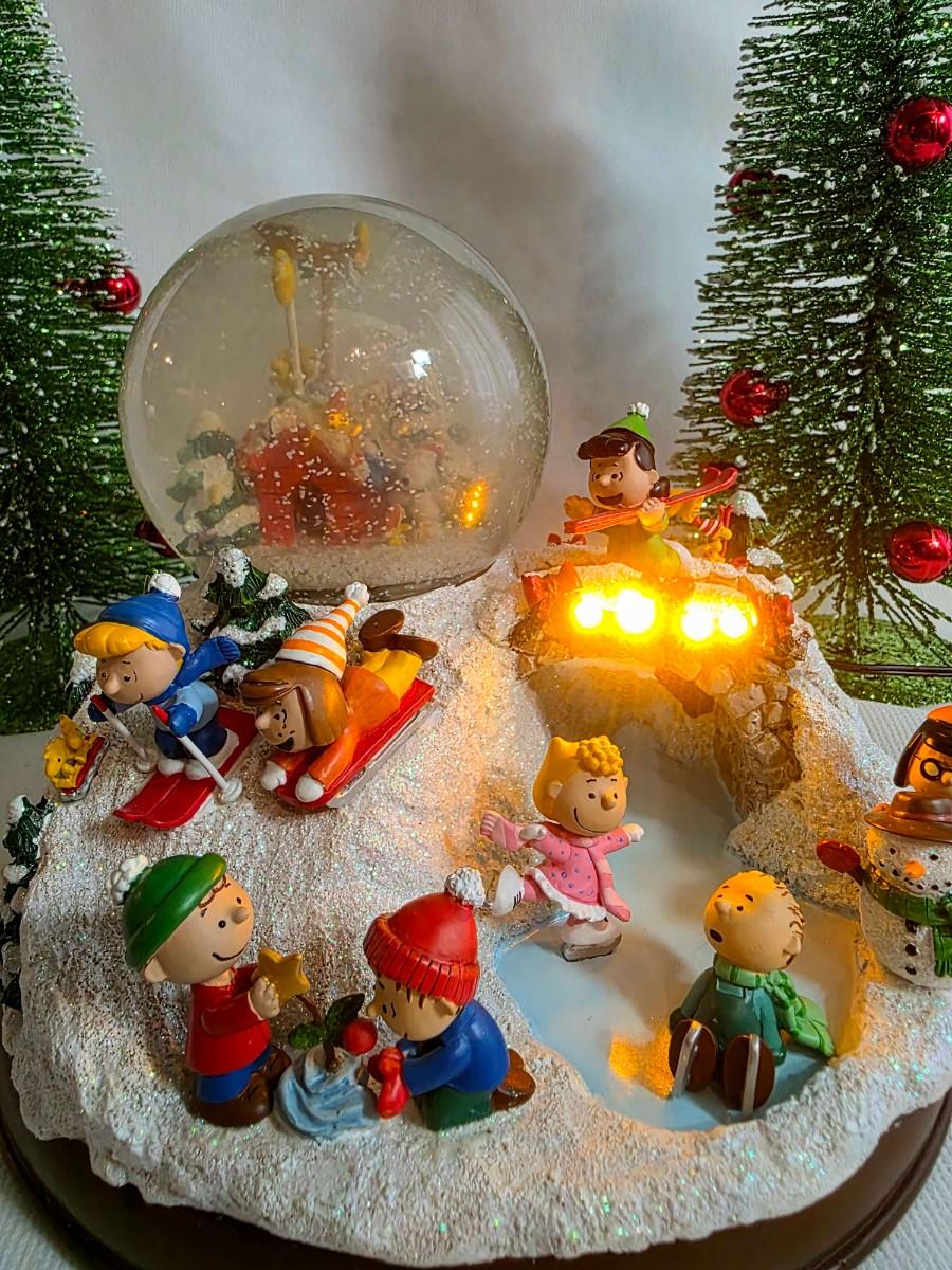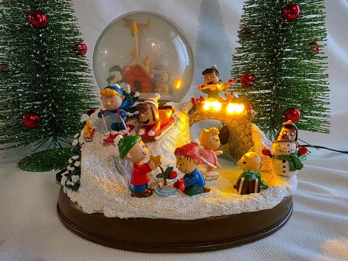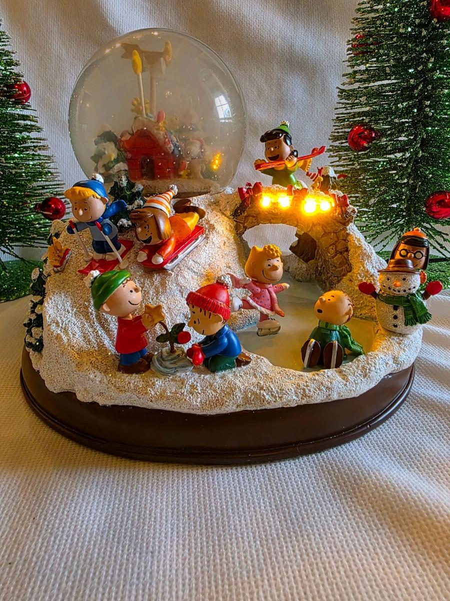 Danbury Mint Peanuts Ultimate Snow Globe. Includes the original adapter which works the lights; however, the music and snow globe are not working. When we tested with new batteries, it played one song, but the music has not played since. The snow globe gives one quick burst then stops. The snow globe is a little cloudy and yellowish in color with age. But this piece is still super cool!