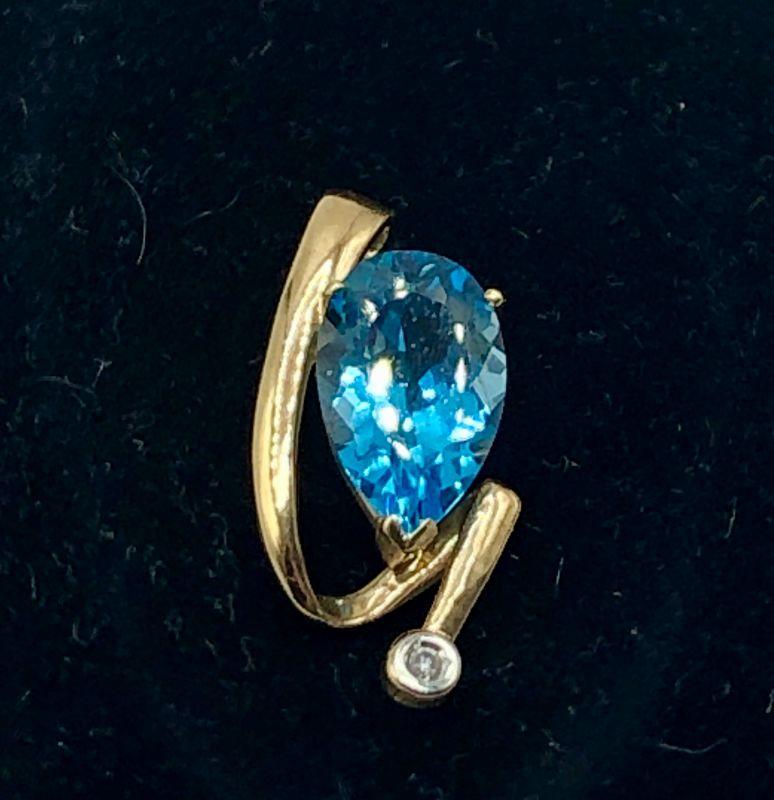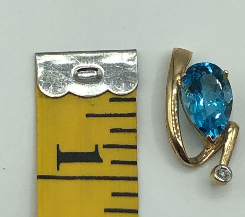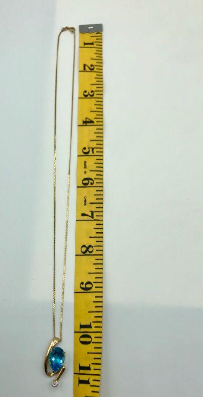 Large Blue Topaz Pendant with chain. Pendant is 10k yellow gold and a little over 1" in length. The stone is about 5/8". There looks to be a diamond accent stone at the one end. The chain is 14k yellow gold. Slim link, 10" length.