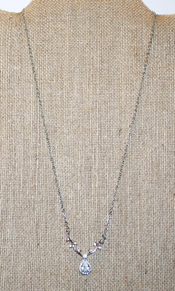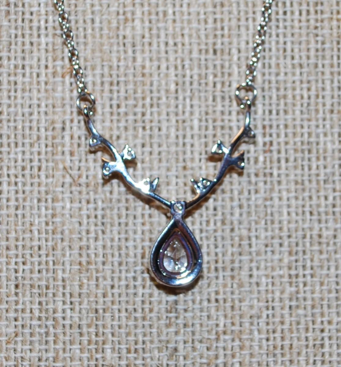 Pear Shaped Clear Stone on a "Branch" with 9 Tiny Stone Accents PENDANT (1" x 1") on a Silver Tone Necklace Chain 18" L