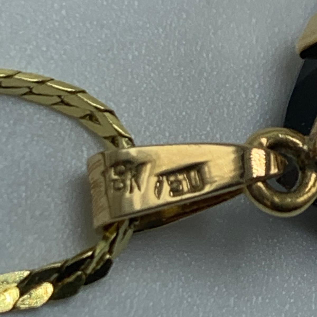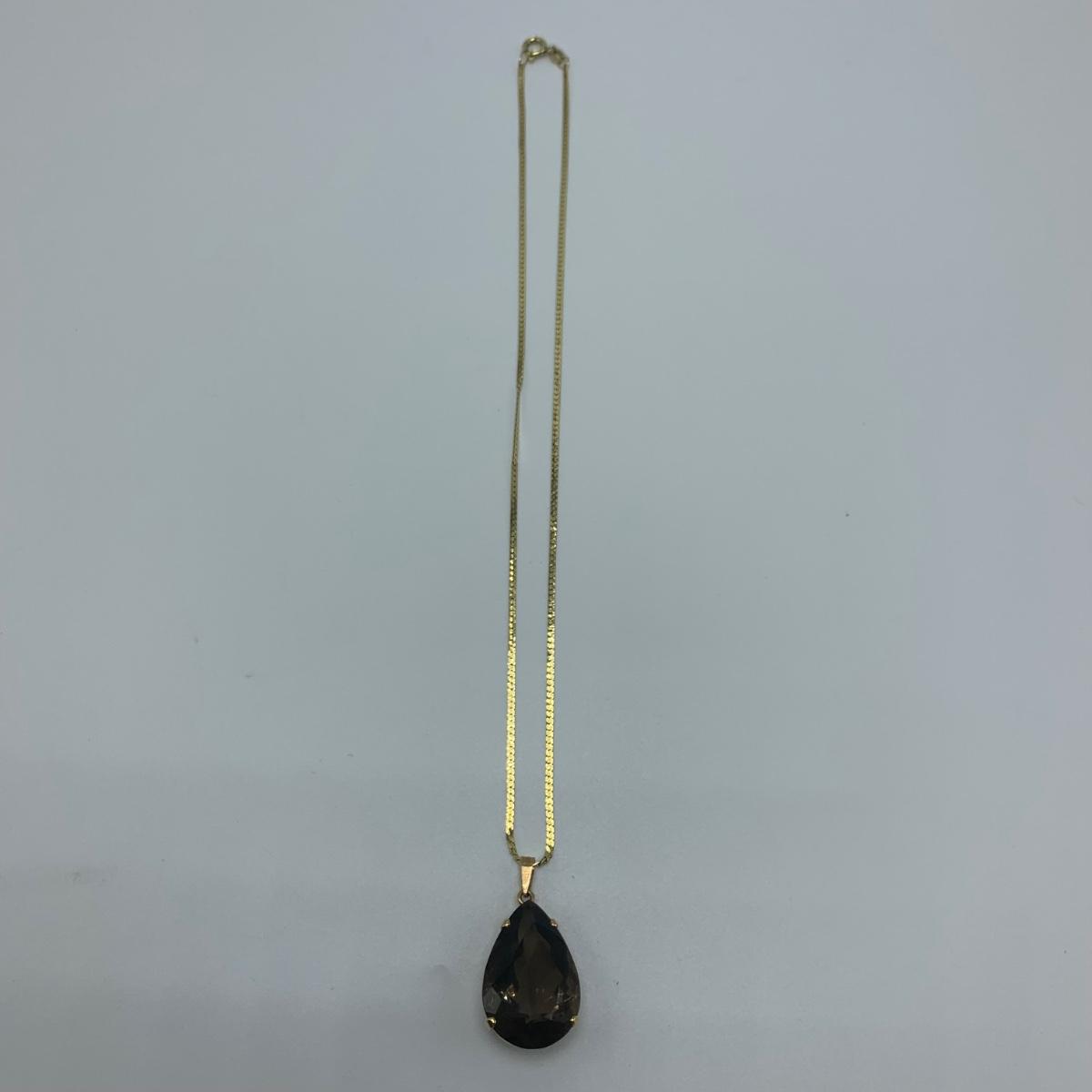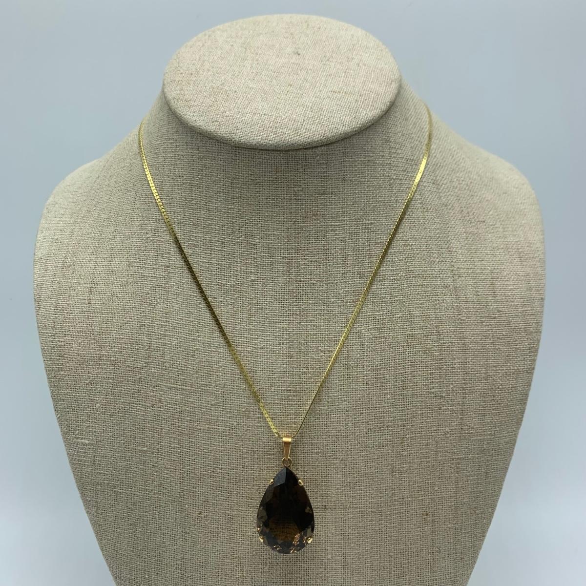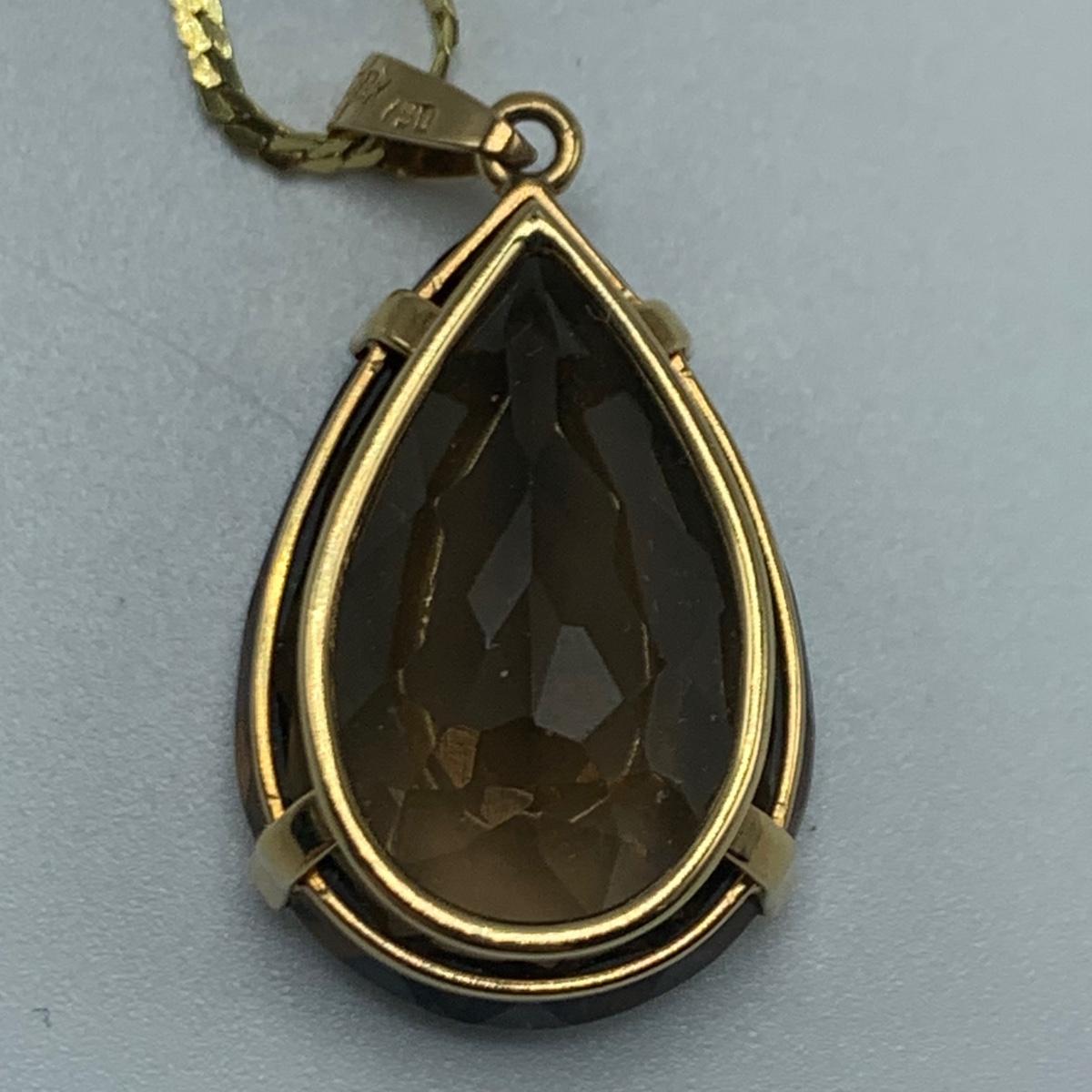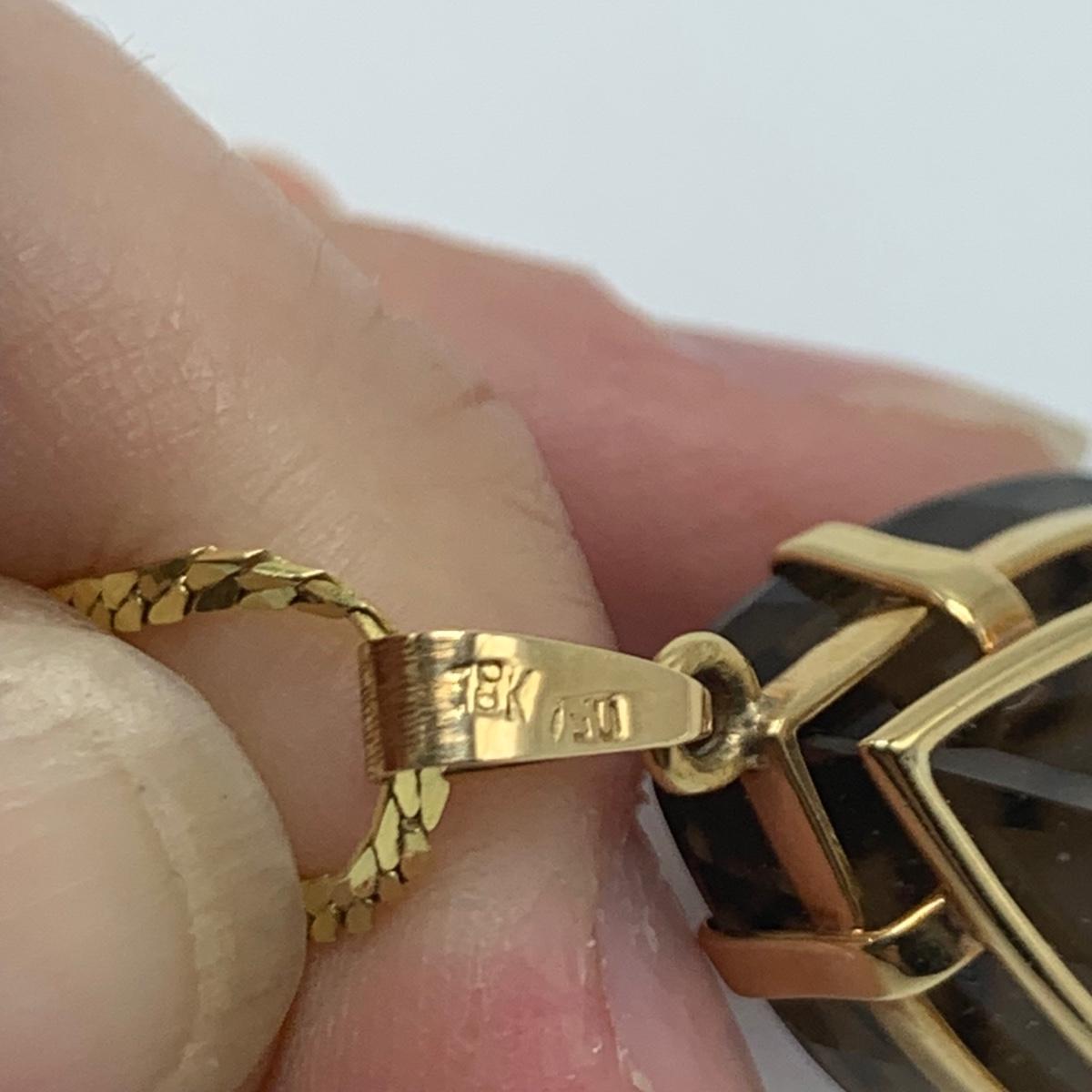 Sparkling pear-shaped faceted stone that is the color of smoky quartz, set in gold that is stamped 18K. Pendant is 1” long. It comes on a 16.5” golden chain that is marked “˜750’ (indicating 18K). All sales are final. No returns or refunds. Please bid accordingly.