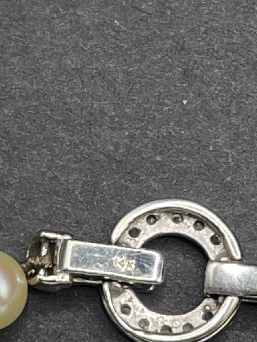 Pearl bracelet with white gold and dimaond clasp. Marked 14K. Good condition. 7 1/2"