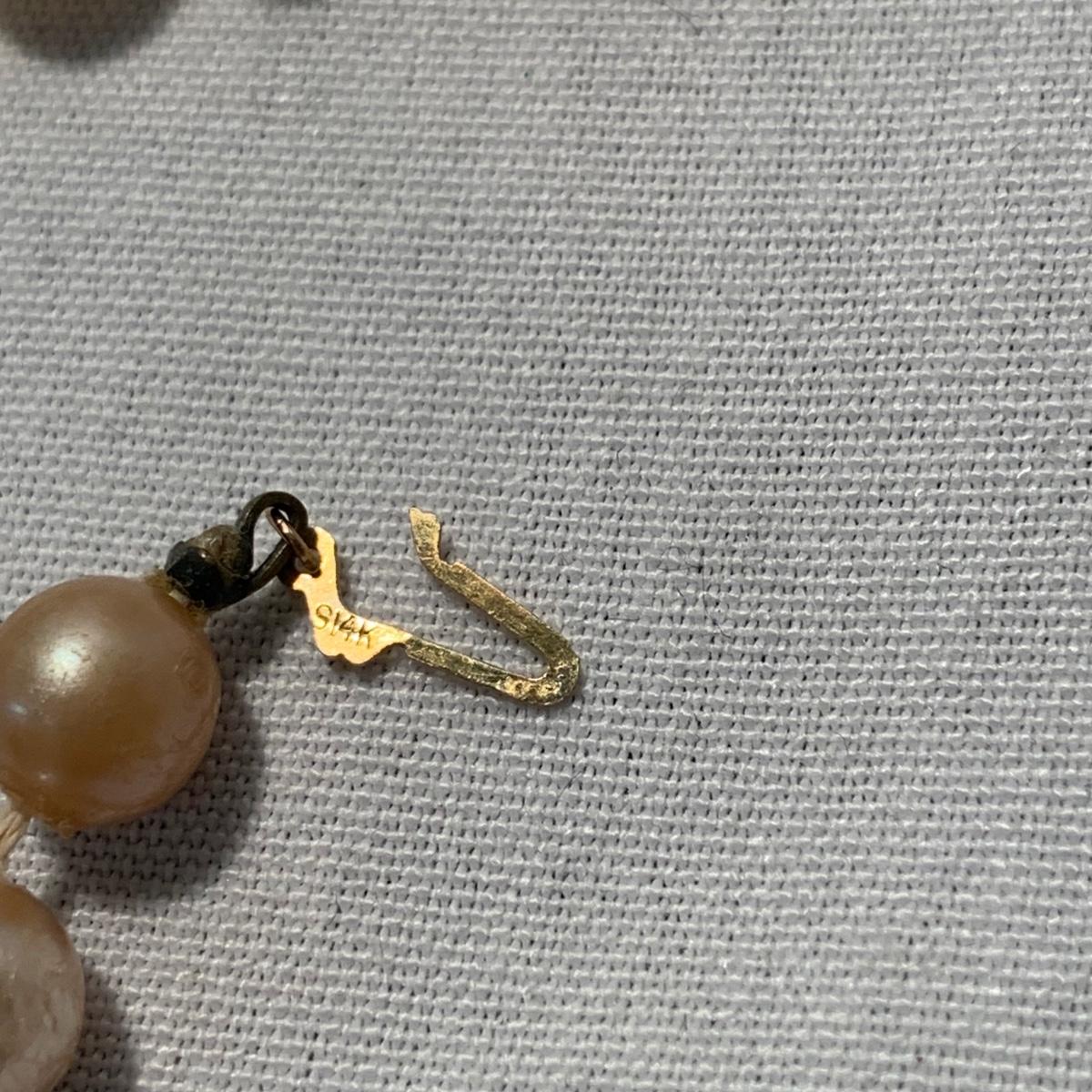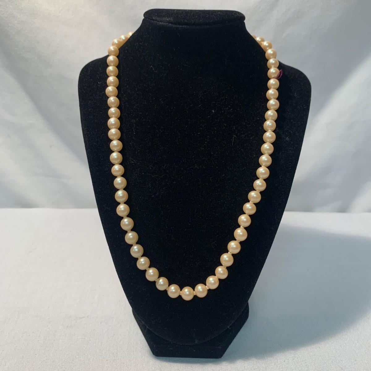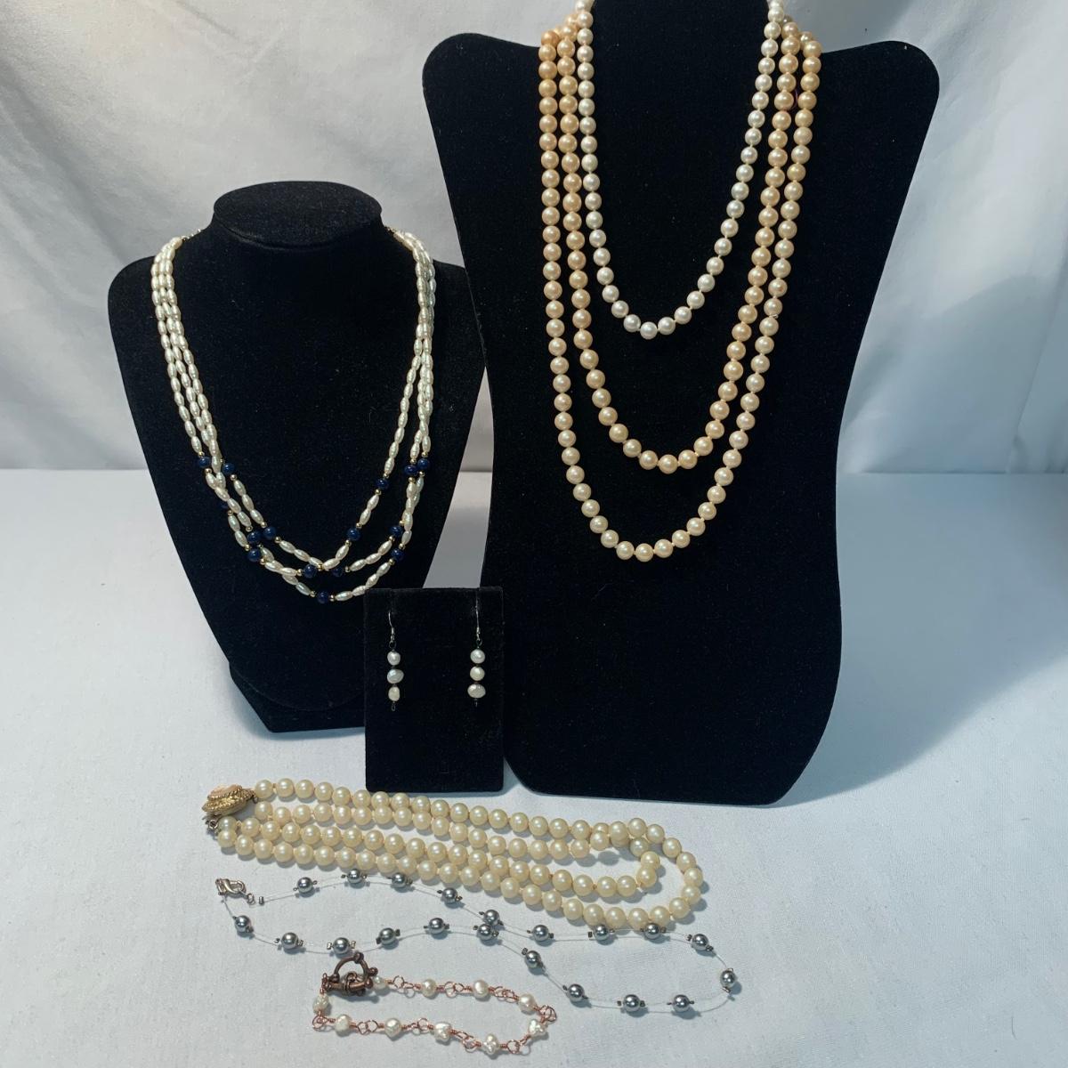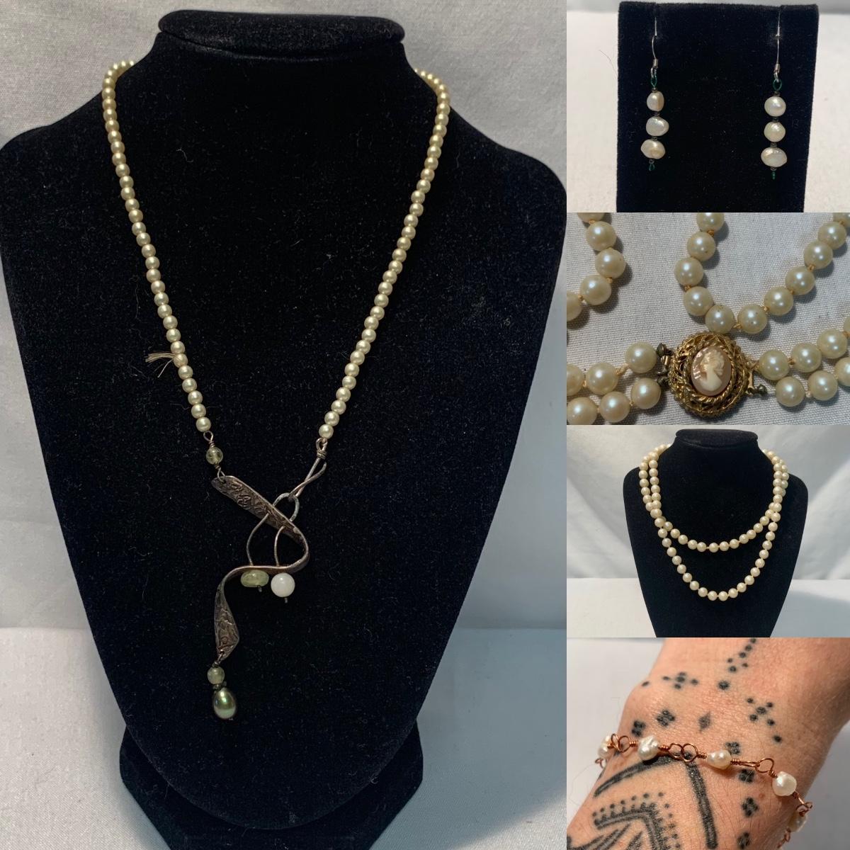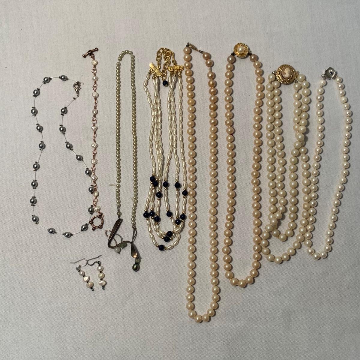 A collection of jewelry with pearl or pearl-like beads. Included are seven necklaces, a bracelet, and a pair of earrings for pierced ears. The earrings, bracelet, and three-stranded necklace appear to have freshwater pearls. The others are potentially pearlescent beads. We cannot verify any of the beads. Three of the pearlescent beads strands have lovely clasps. One has a unique front clasp that is marked ‘925 BLT’; it has some fraying on its string. The longest necklace is about 24” and its clasp is marked ‘S14K’. The shortest single strand necklace is 16” and its clasp is marked ‘14K’.