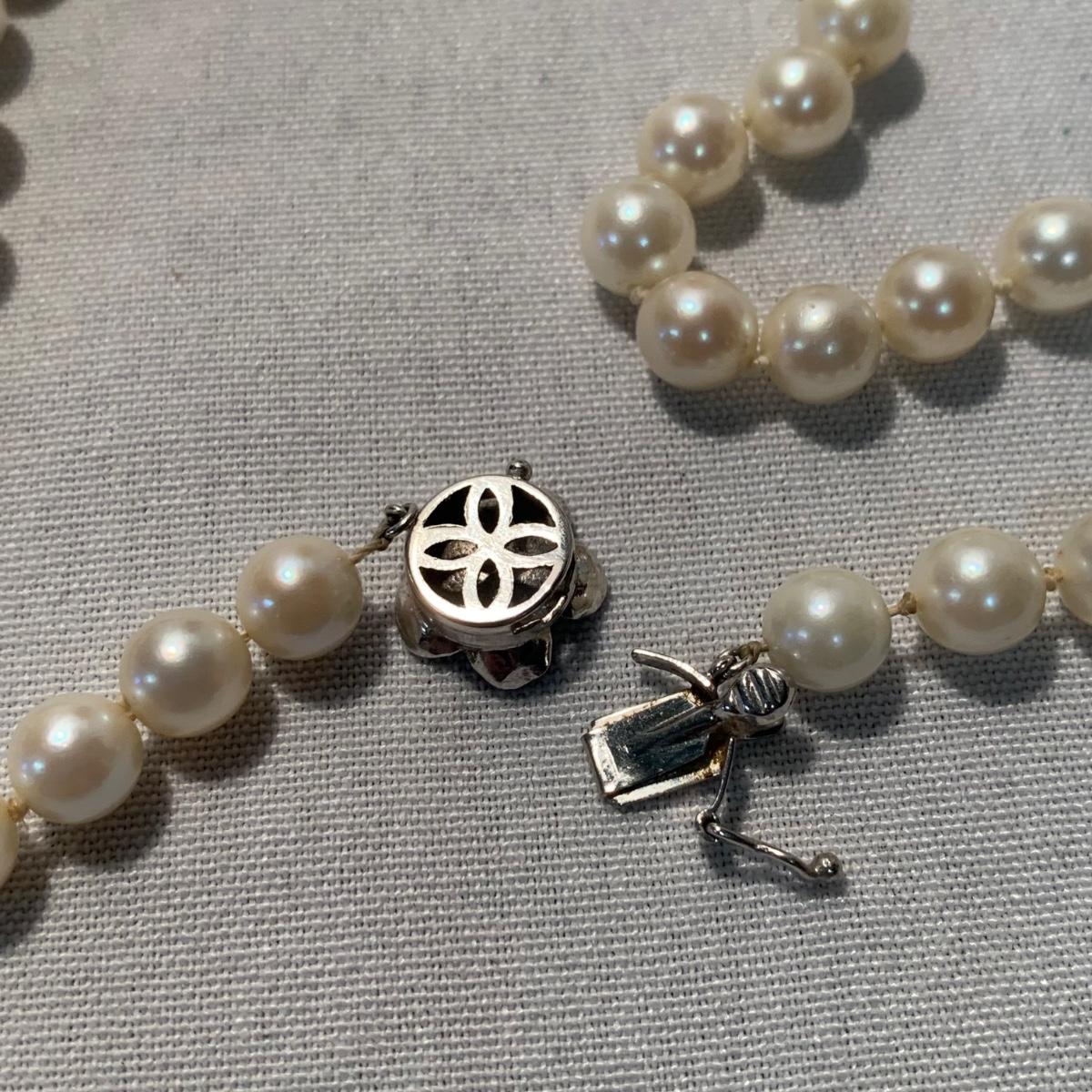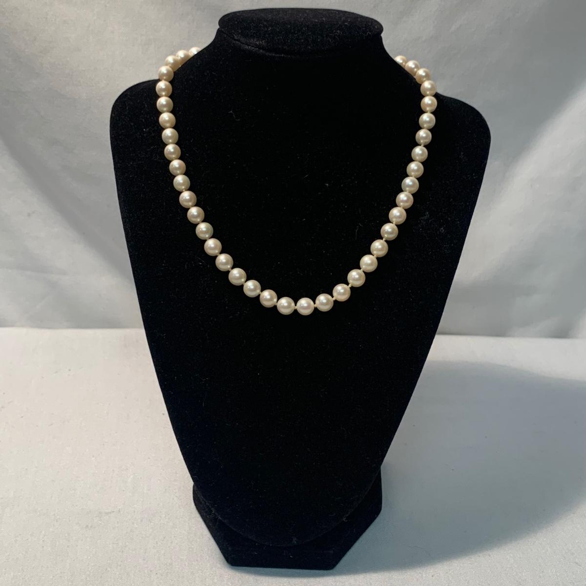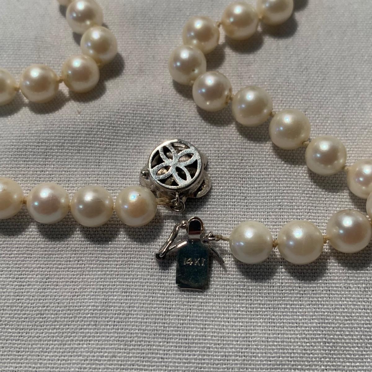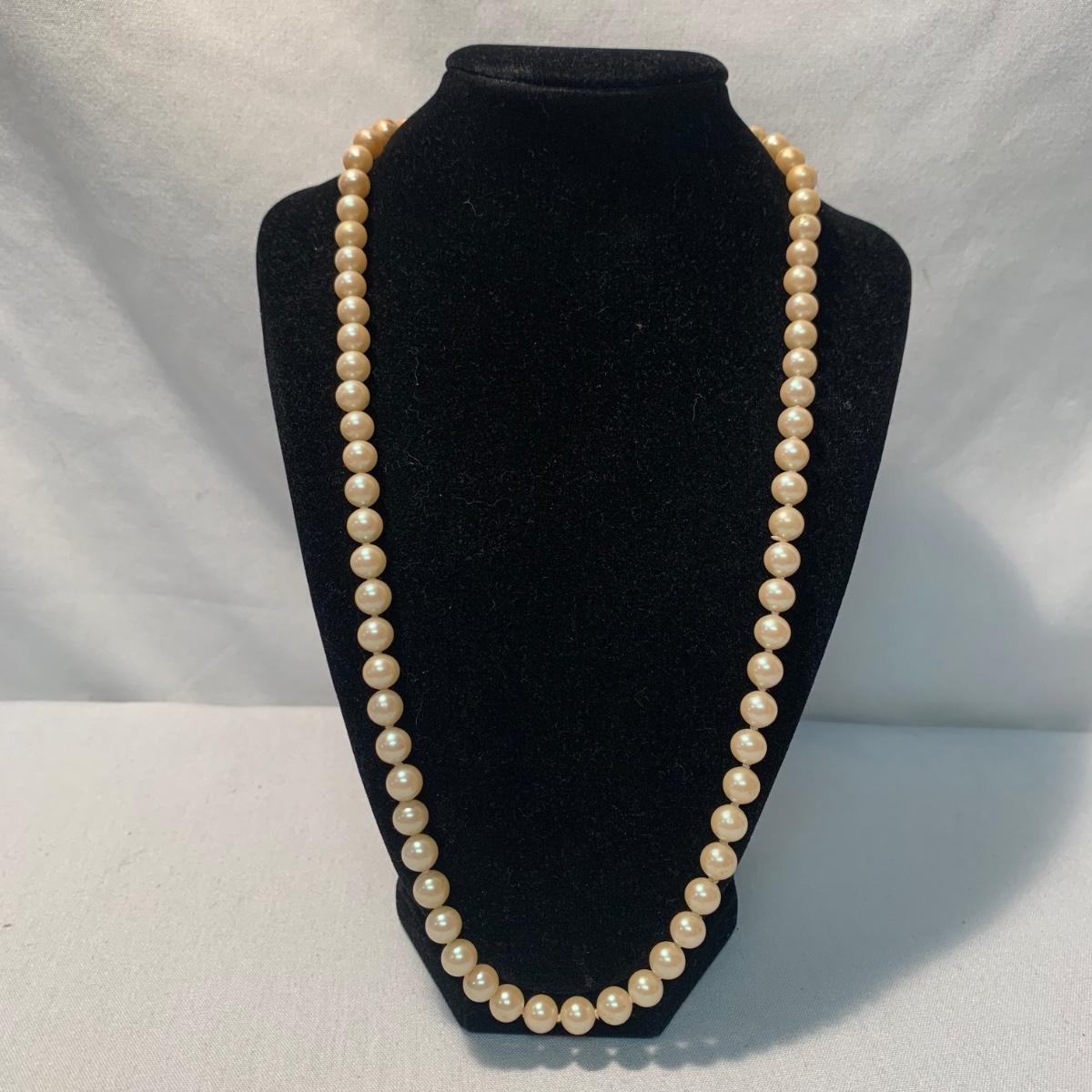 A collection of jewelry with pearl or pearl-like beads. Included are seven necklaces, a bracelet, and a pair of earrings for pierced ears. The earrings, bracelet, and three-stranded necklace appear to have freshwater pearls. The others are potentially pearlescent beads. We cannot verify any of the beads. Three of the pearlescent beads strands have lovely clasps. One has a unique front clasp that is marked ‘925 BLT’; it has some fraying on its string. The longest necklace is about 24” and its clasp is marked ‘S14K’. The shortest single strand necklace is 16” and its clasp is marked ‘14K’.