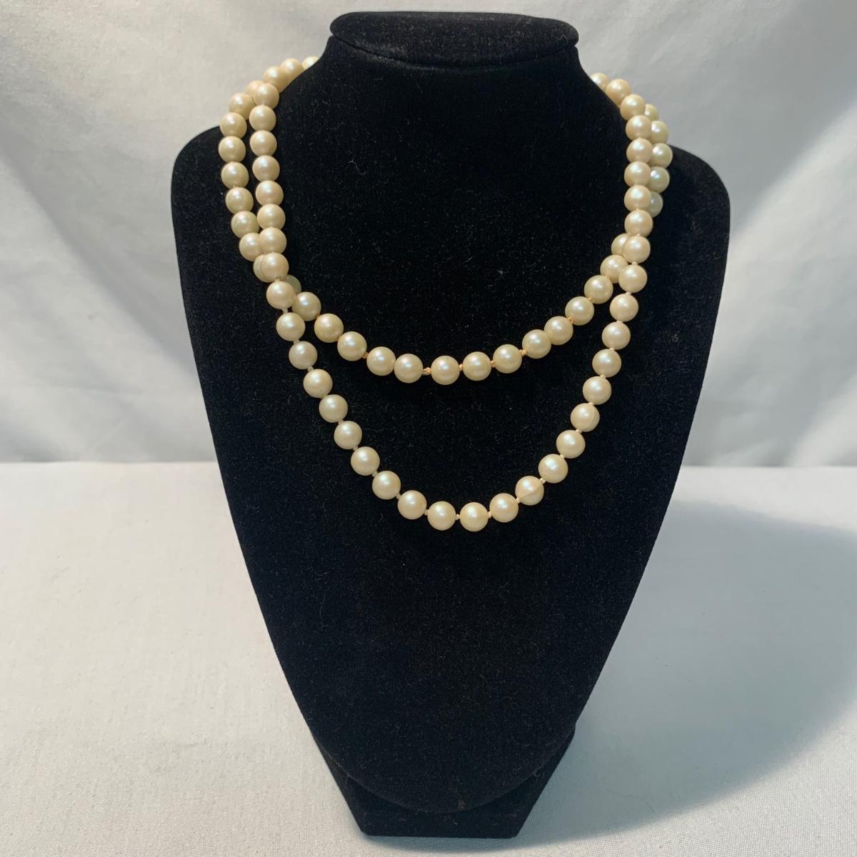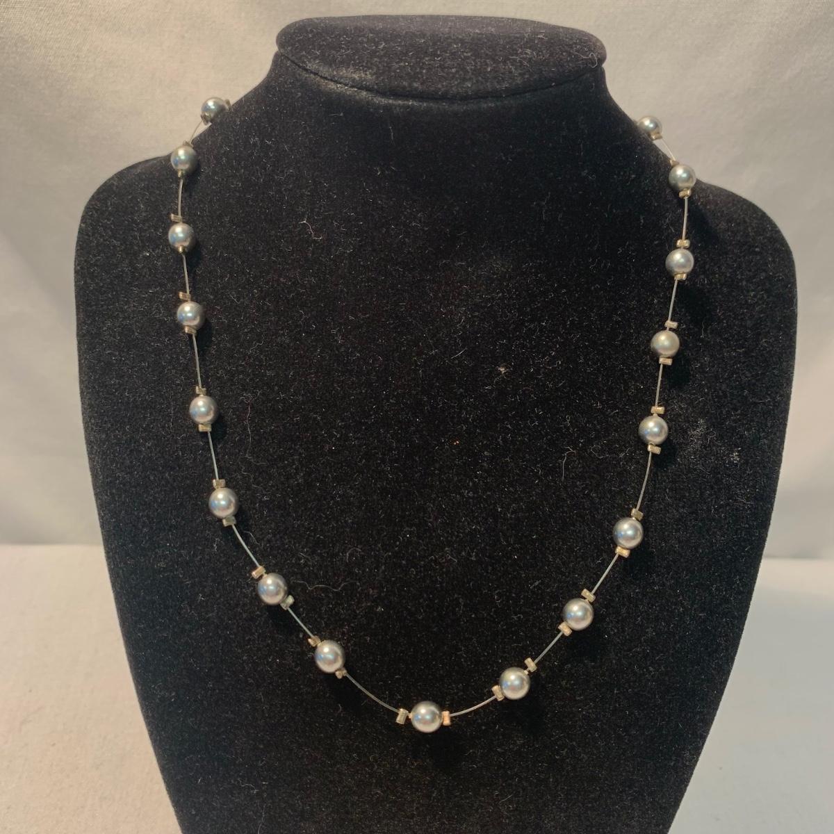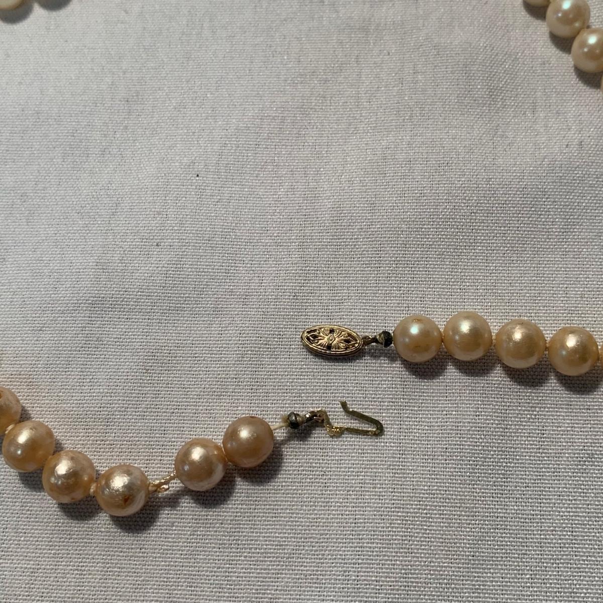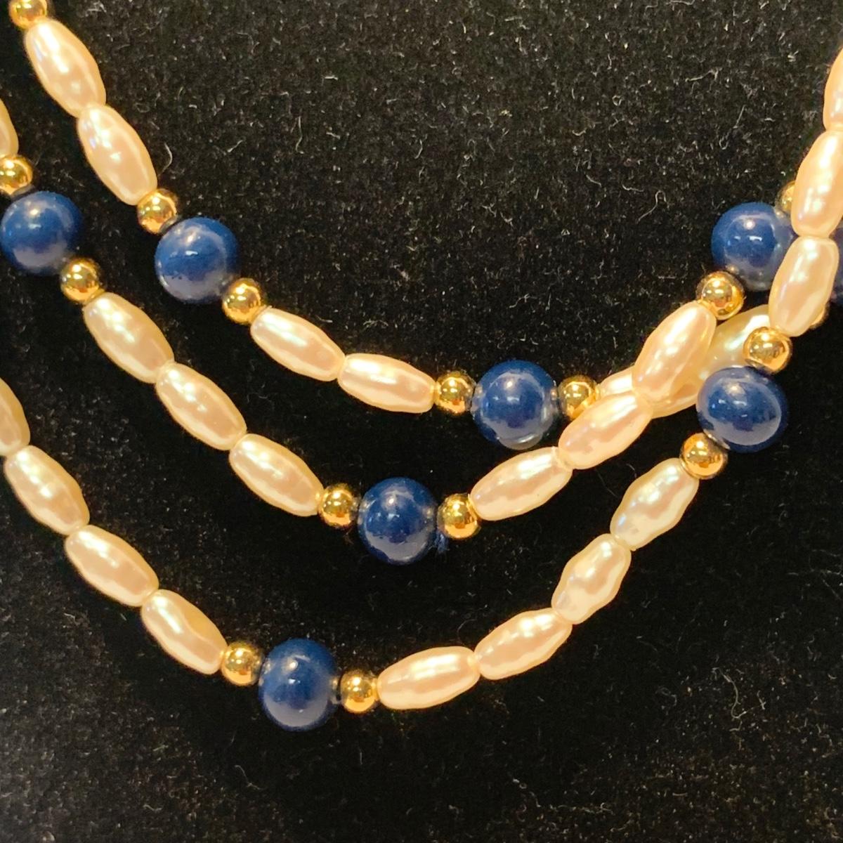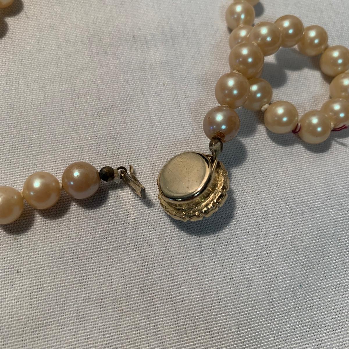 A collection of jewelry with pearl or pearl-like beads. Included are seven necklaces, a bracelet, and a pair of earrings for pierced ears. The earrings, bracelet, and three-stranded necklace appear to have freshwater pearls. The others are potentially pearlescent beads. We cannot verify any of the beads. Three of the pearlescent beads strands have lovely clasps. One has a unique front clasp that is marked ‘925 BLT’; it has some fraying on its string. The longest necklace is about 24” and its clasp is marked ‘S14K’. The shortest single strand necklace is 16” and its clasp is marked ‘14K’.