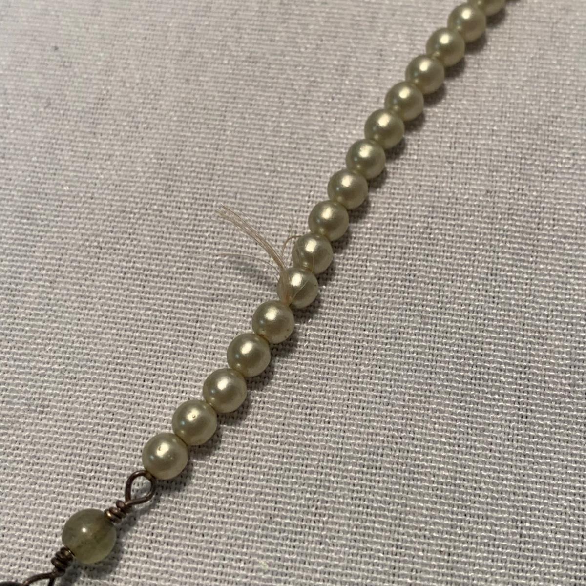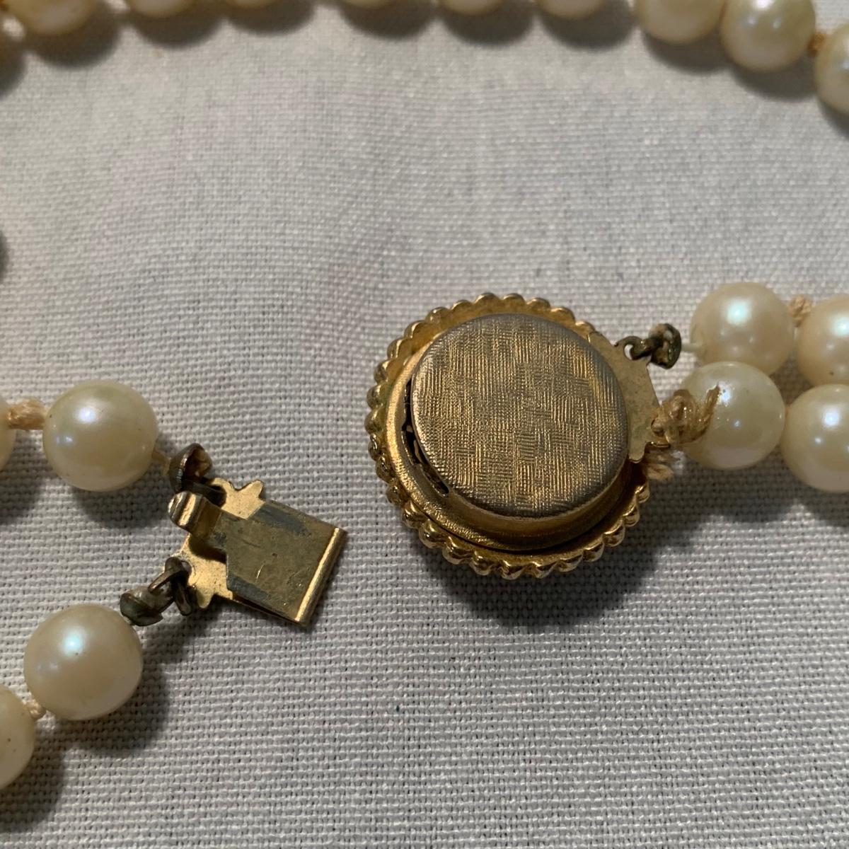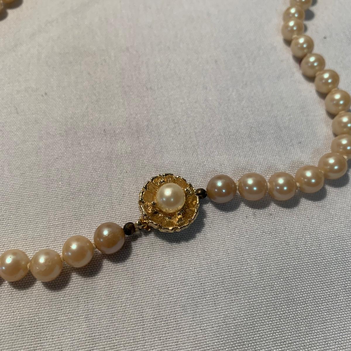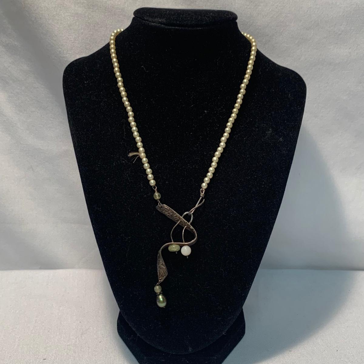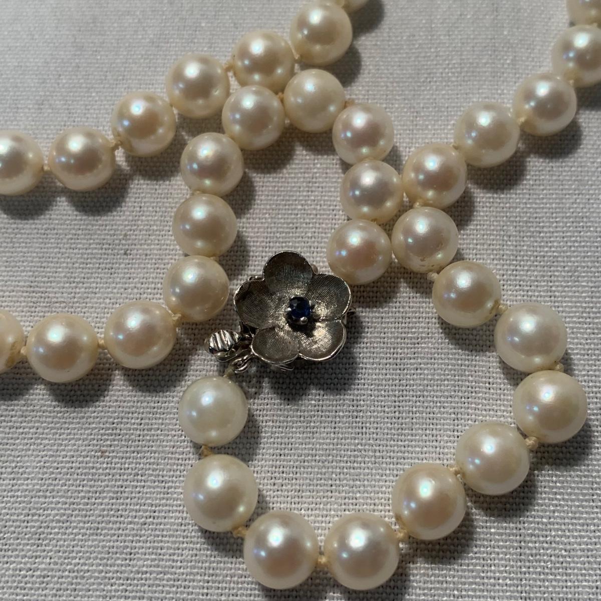 A collection of jewelry with pearl or pearl-like beads. Included are seven necklaces, a bracelet, and a pair of earrings for pierced ears. The earrings, bracelet, and three-stranded necklace appear to have freshwater pearls. The others are potentially pearlescent beads. We cannot verify any of the beads. Three of the pearlescent beads strands have lovely clasps. One has a unique front clasp that is marked ‘925 BLT’; it has some fraying on its string. The longest necklace is about 24” and its clasp is marked ‘S14K’. The shortest single strand necklace is 16” and its clasp is marked ‘14K’.