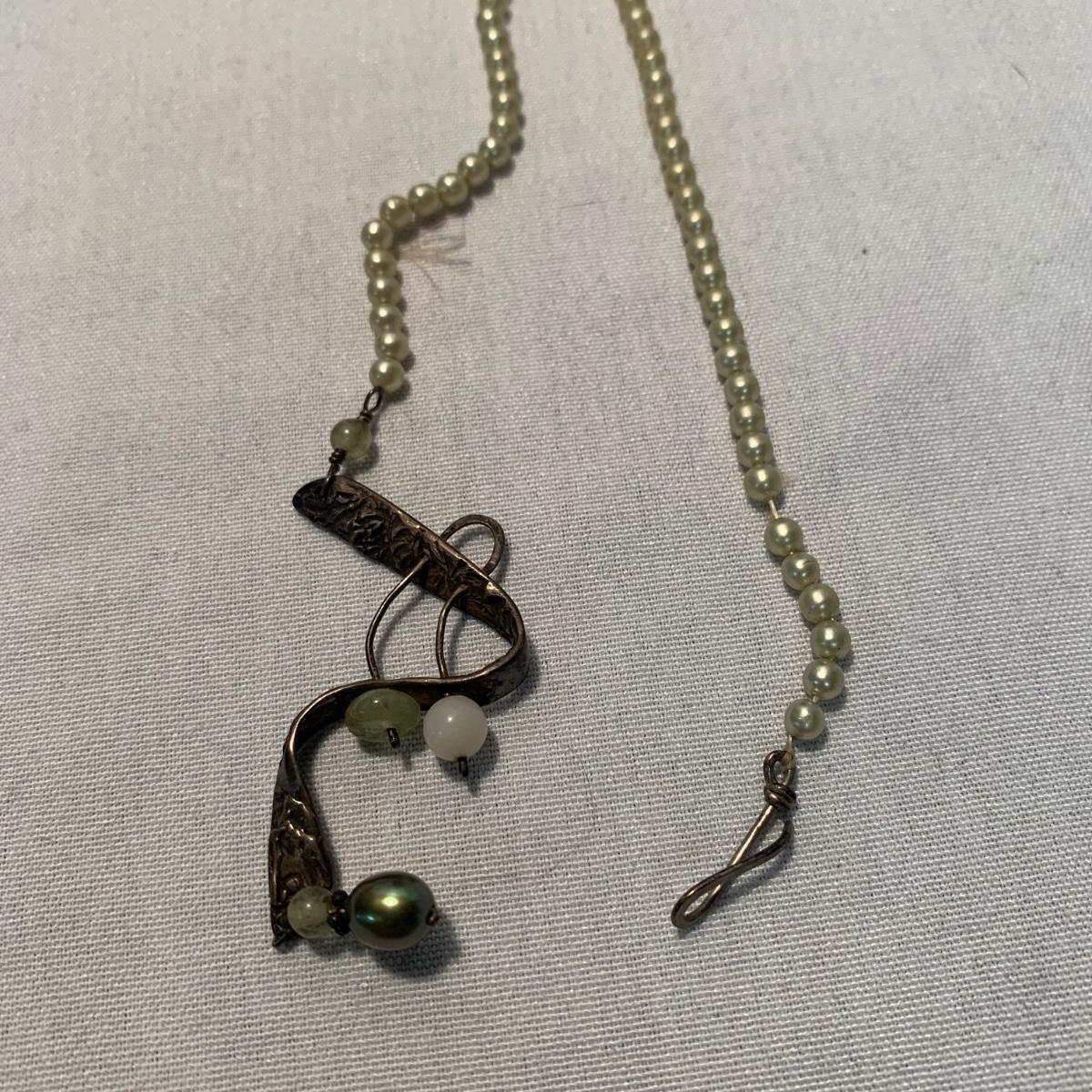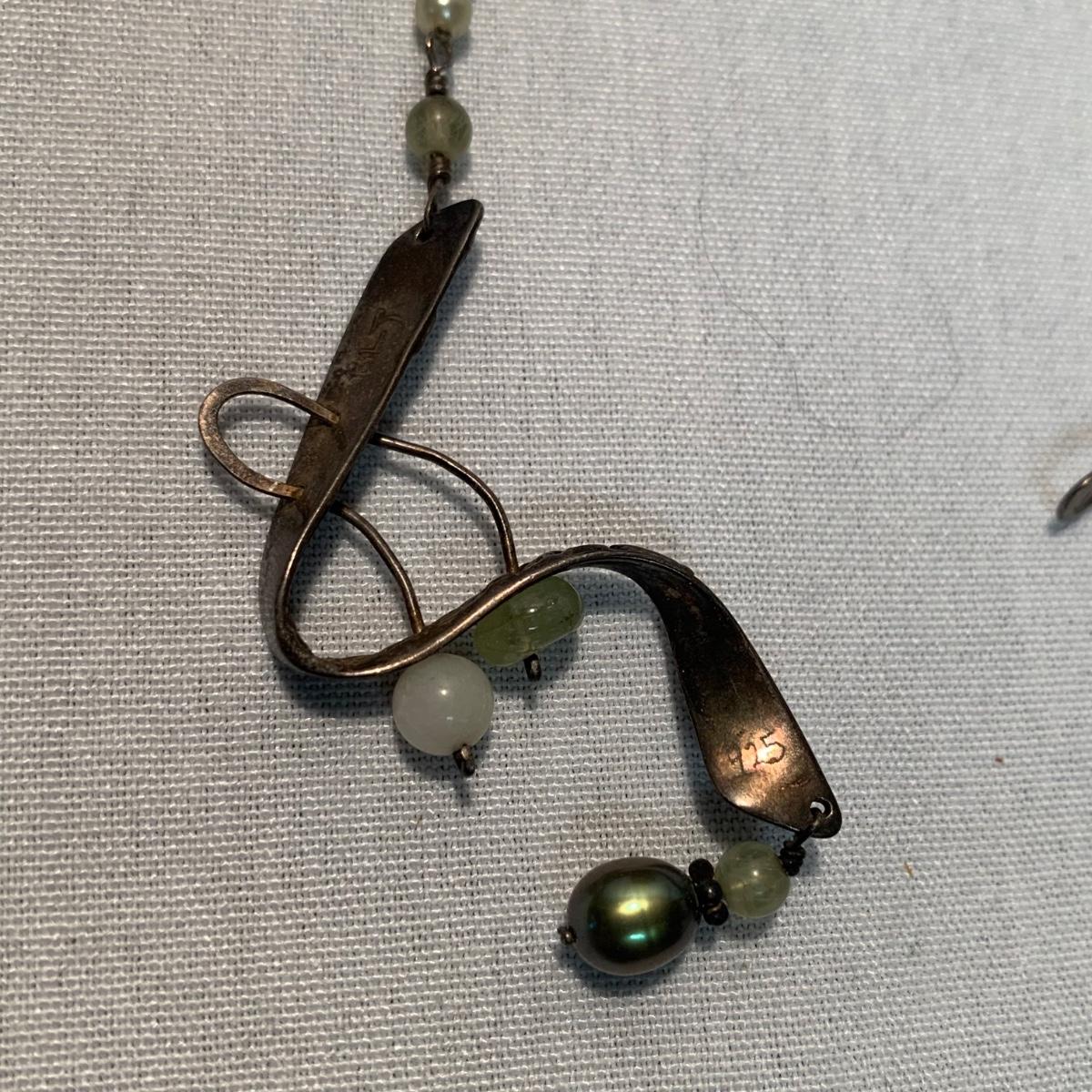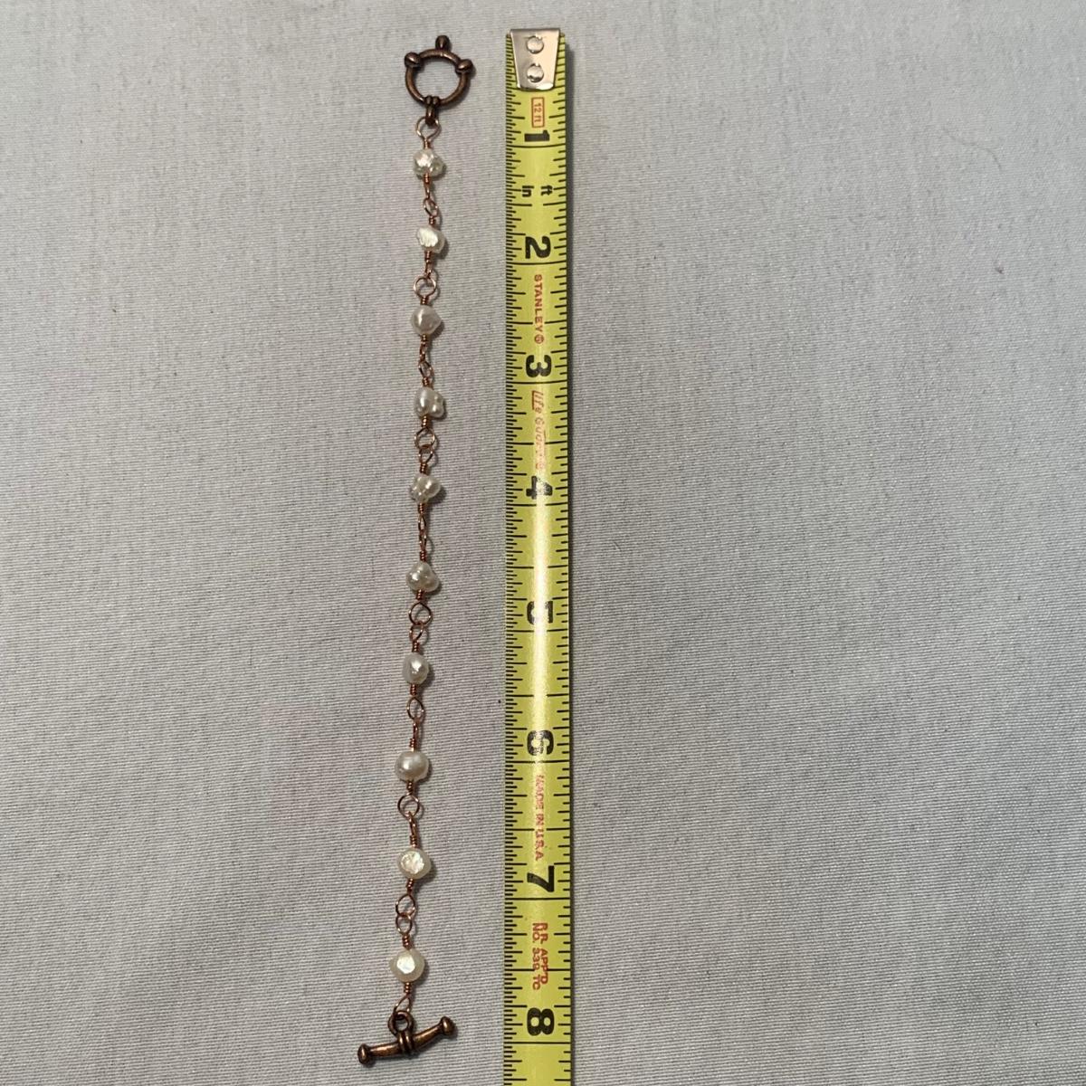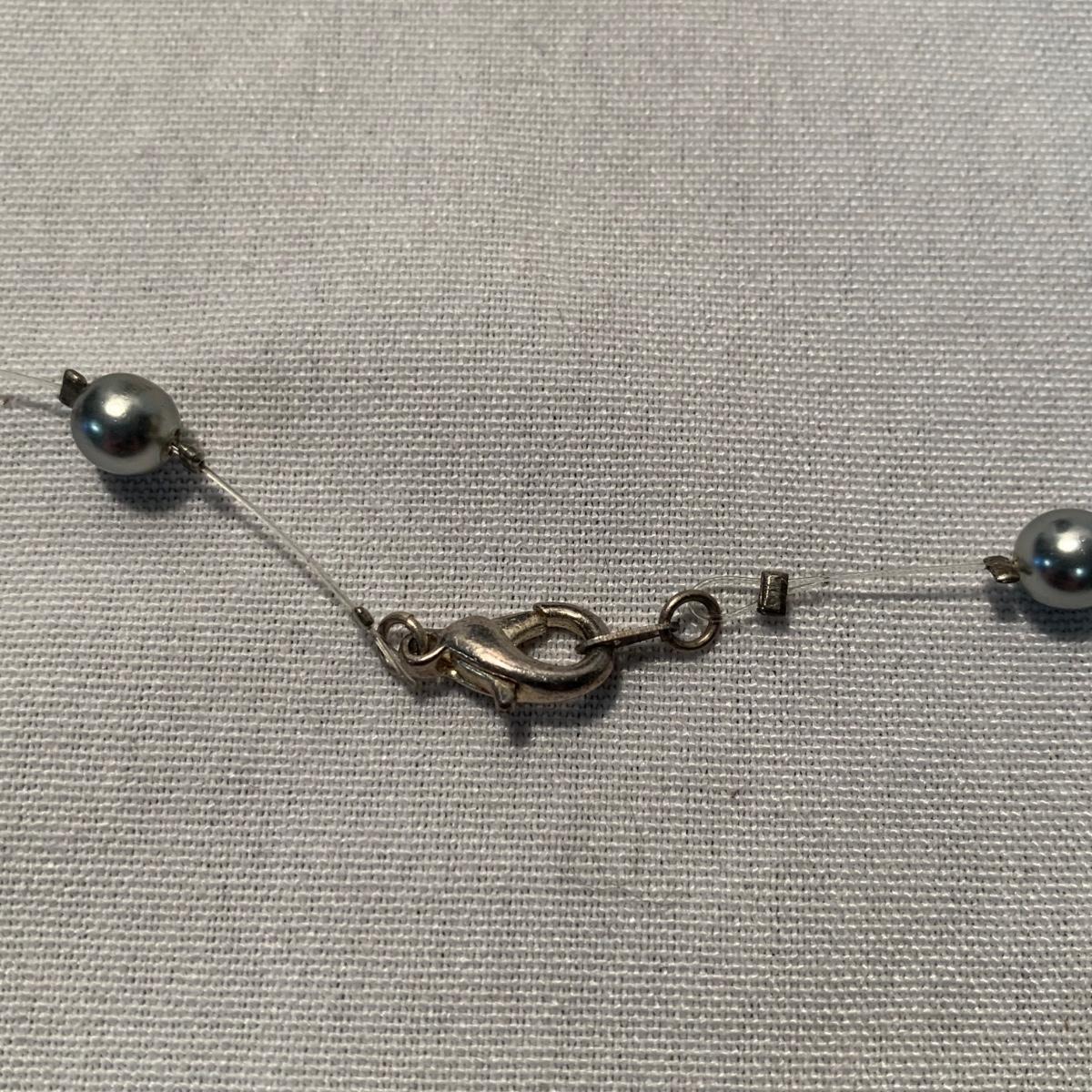 A collection of jewelry with pearl or pearl-like beads. Included are seven necklaces, a bracelet, and a pair of earrings for pierced ears. The earrings, bracelet, and three-stranded necklace appear to have freshwater pearls. The others are potentially pearlescent beads. We cannot verify any of the beads. Three of the pearlescent beads strands have lovely clasps. One has a unique front clasp that is marked ‘925 BLT’; it has some fraying on its string. The longest necklace is about 24” and its clasp is marked ‘S14K’. The shortest single strand necklace is 16” and its clasp is marked ‘14K’.