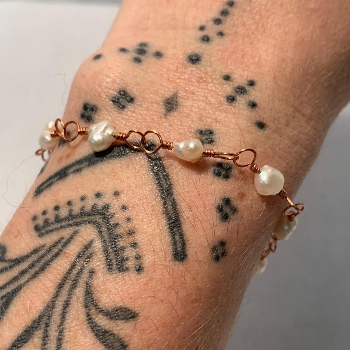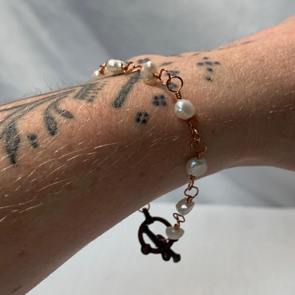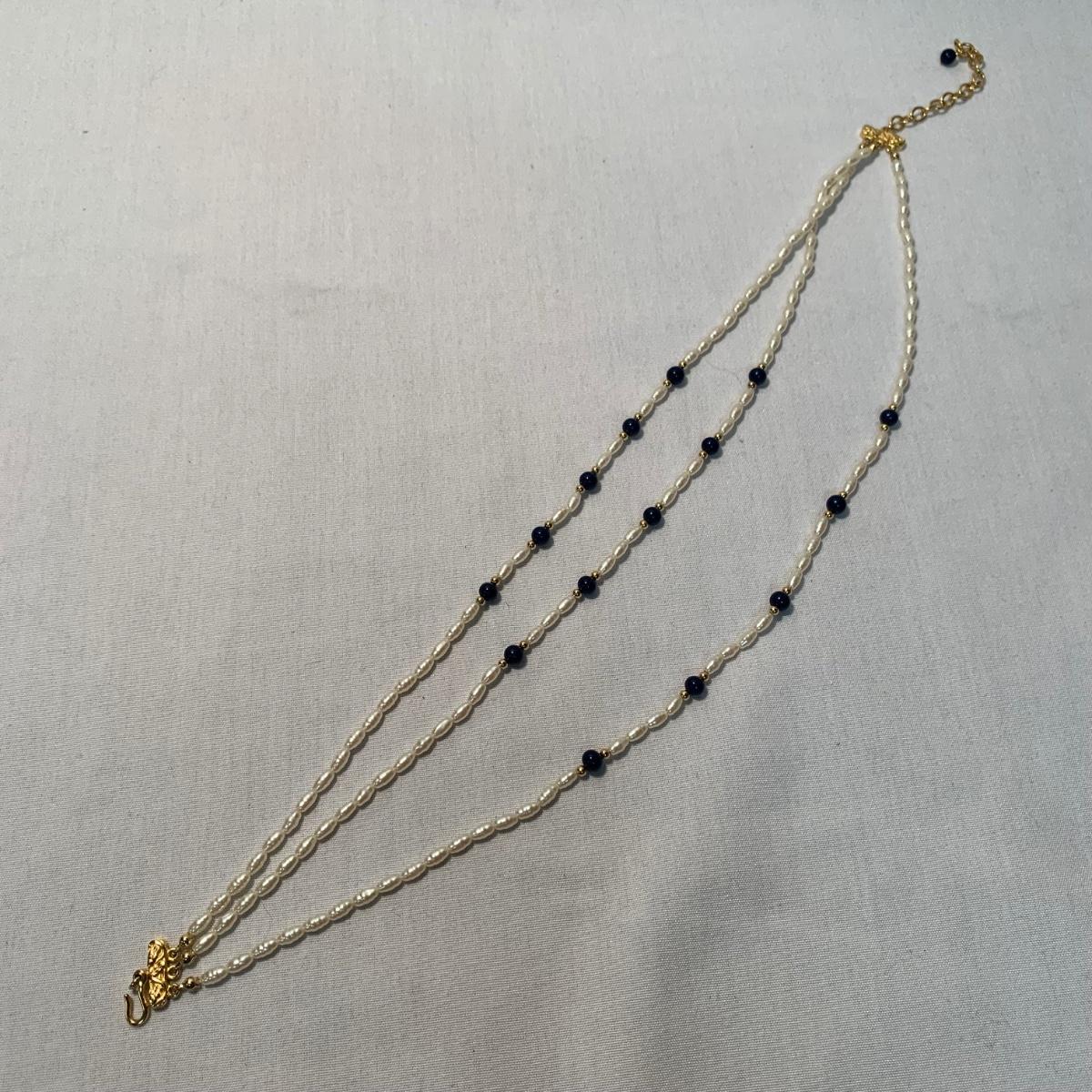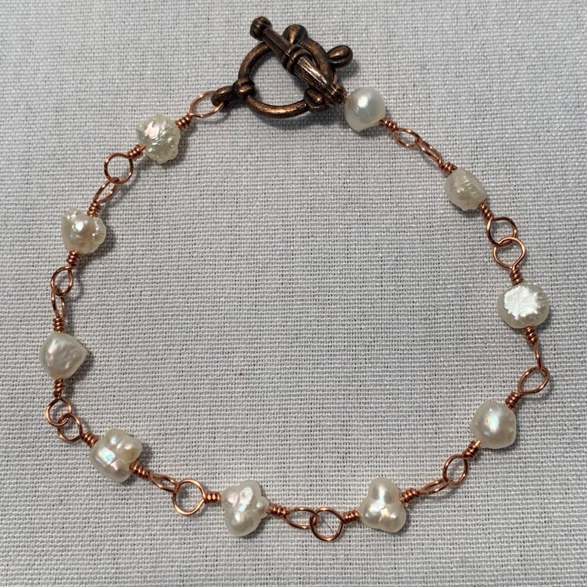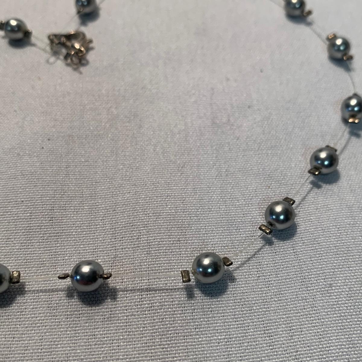 A collection of jewelry with pearl or pearl-like beads. Included are seven necklaces, a bracelet, and a pair of earrings for pierced ears. The earrings, bracelet, and three-stranded necklace appear to have freshwater pearls. The others are potentially pearlescent beads. We cannot verify any of the beads. Three of the pearlescent beads strands have lovely clasps. One has a unique front clasp that is marked ‘925 BLT’; it has some fraying on its string. The longest necklace is about 24” and its clasp is marked ‘S14K’. The shortest single strand necklace is 16” and its clasp is marked ‘14K’.