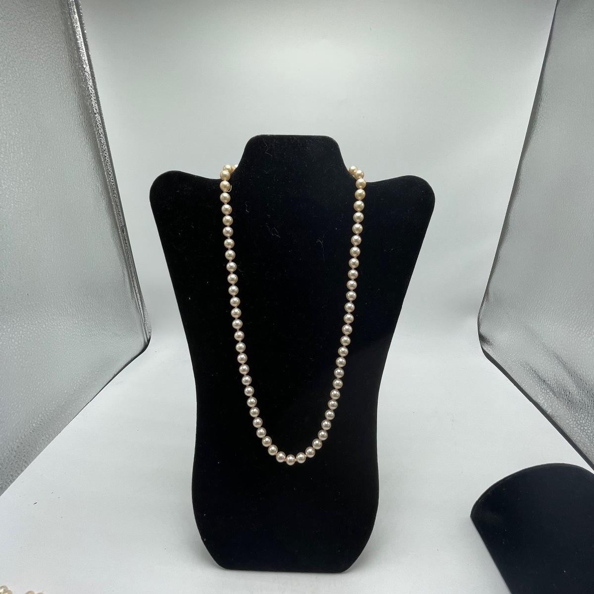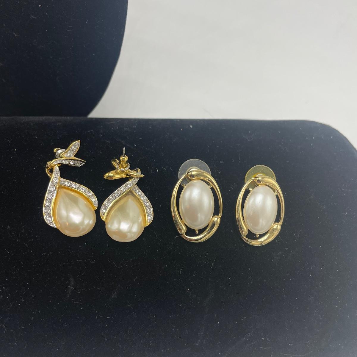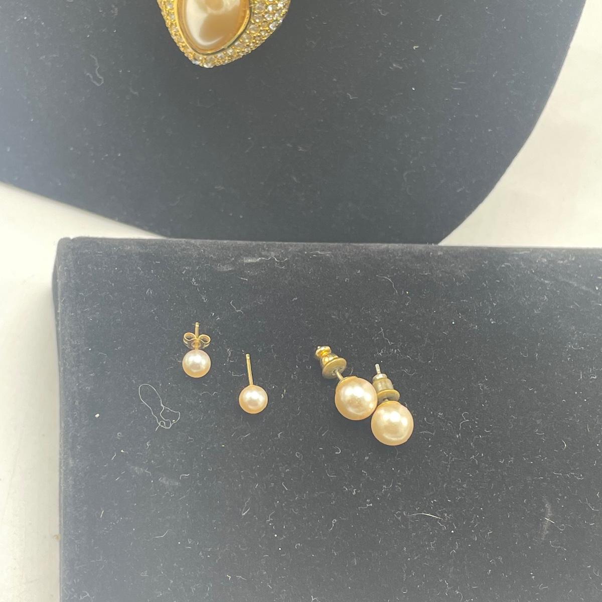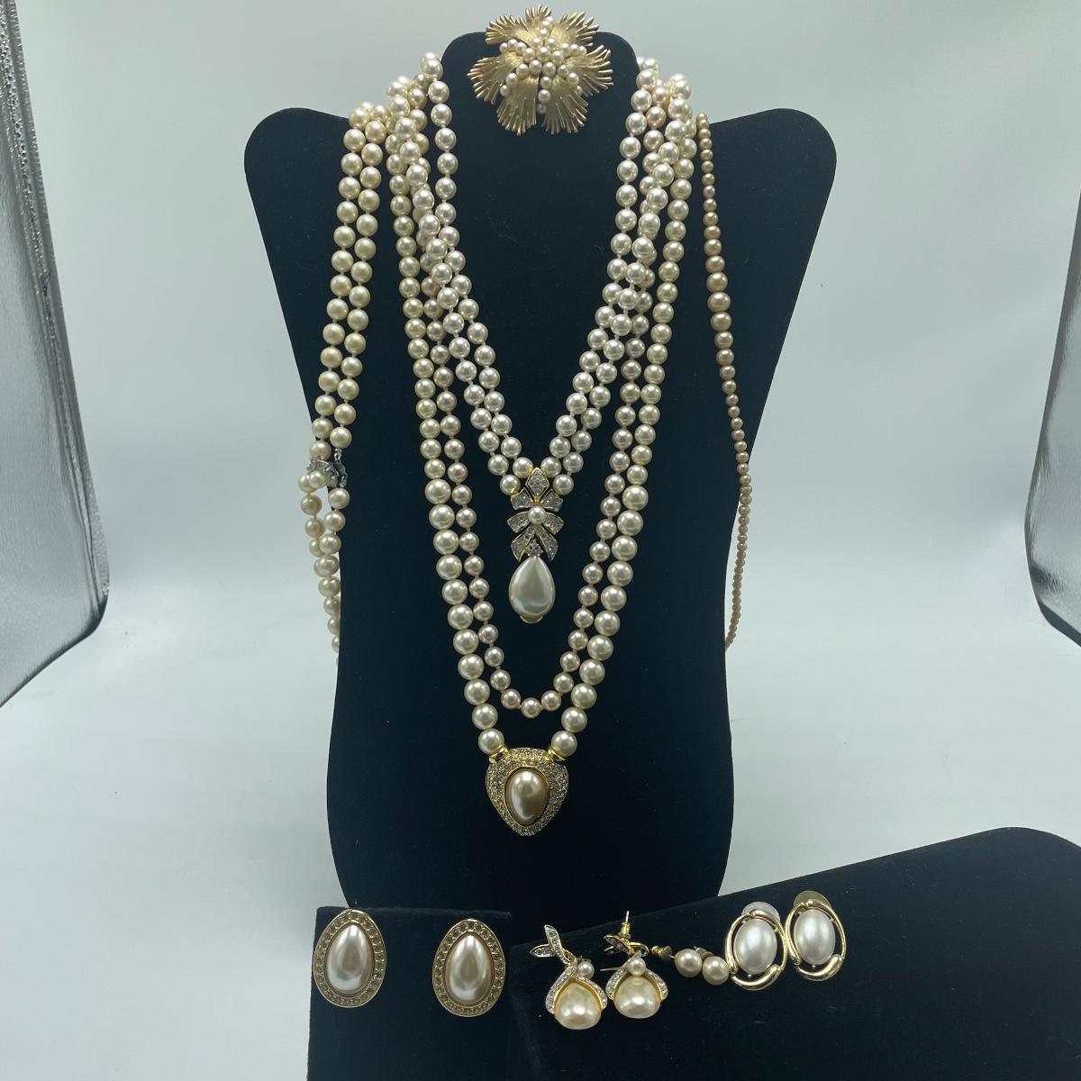 Five Pearl necklaces that includes double and single stranded. We cannot guarantee any authenticity on the pearls. One necklace is marked Napier and has a matching pair of earrings. All earrings are for pierced ears and lot also includes a brooch.