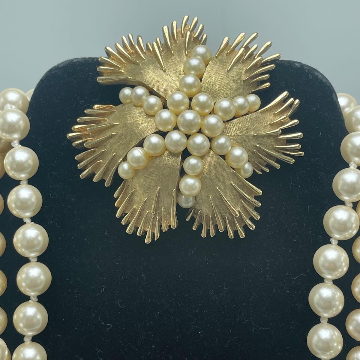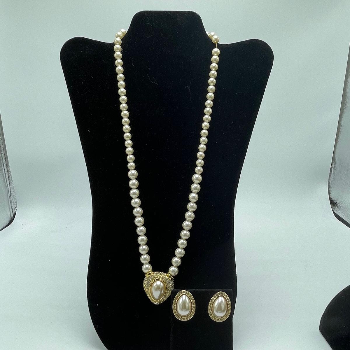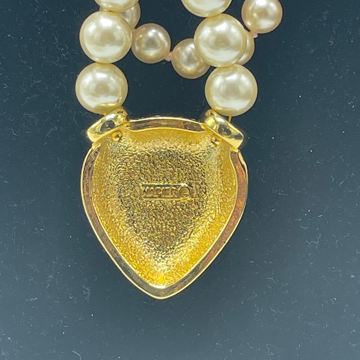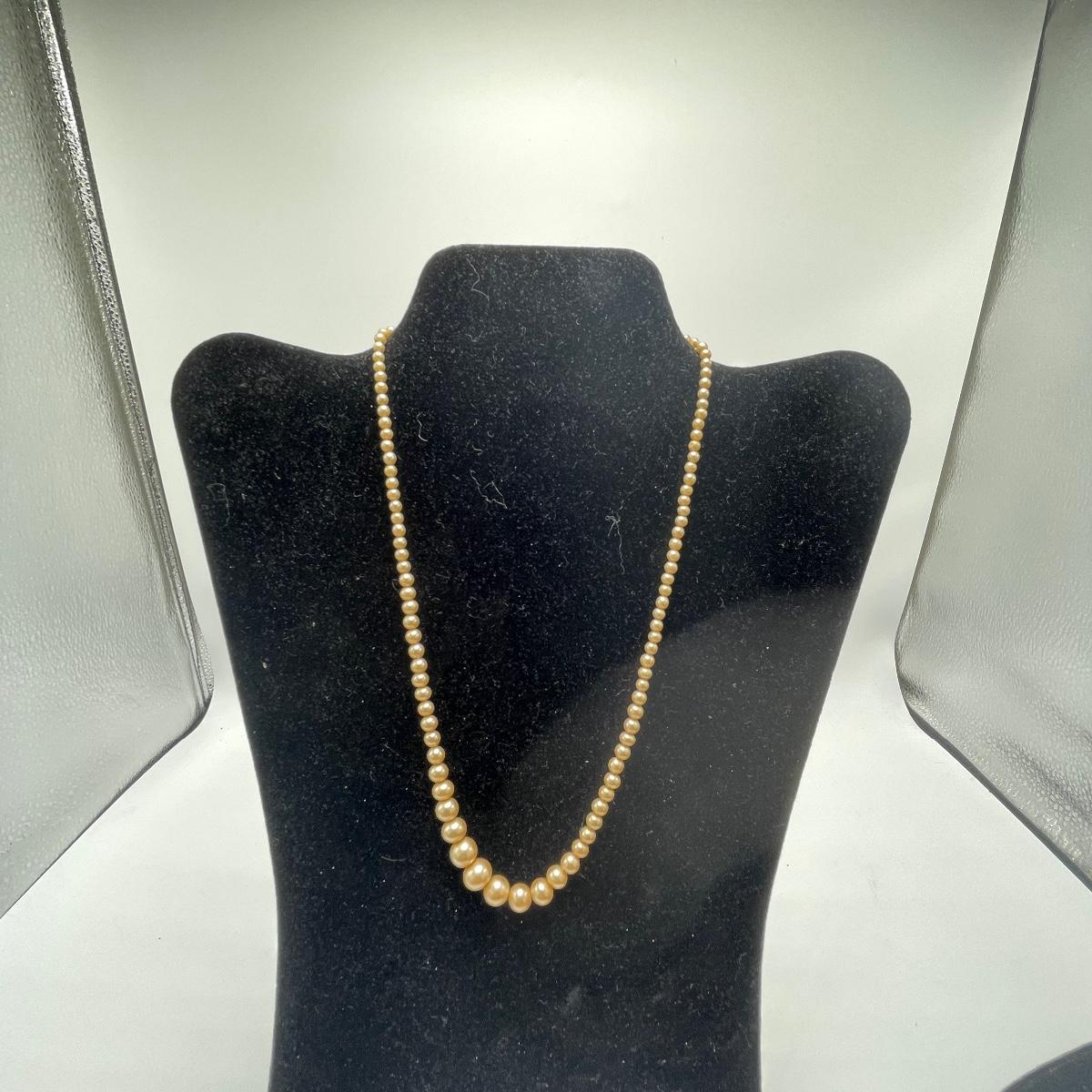 Five Pearl necklaces that includes double and single stranded. We cannot guarantee any authenticity on the pearls. One necklace is marked Napier and has a matching pair of earrings. All earrings are for pierced ears and lot also includes a brooch.