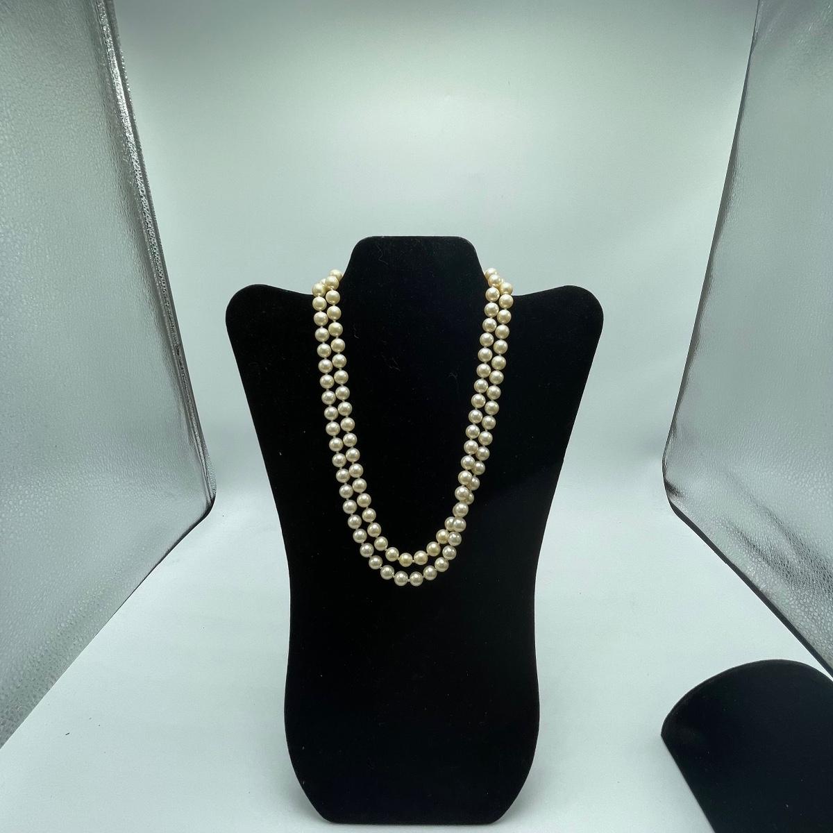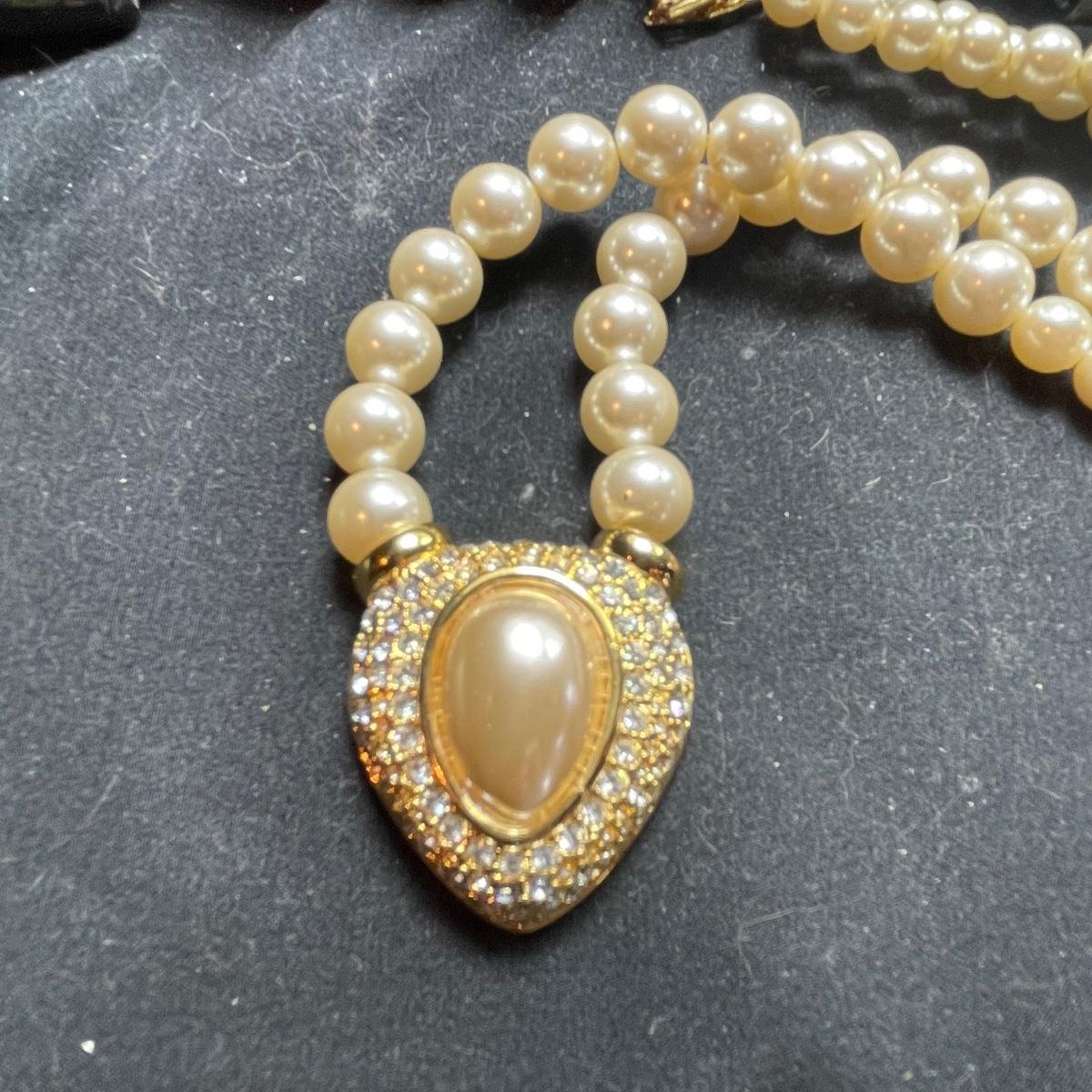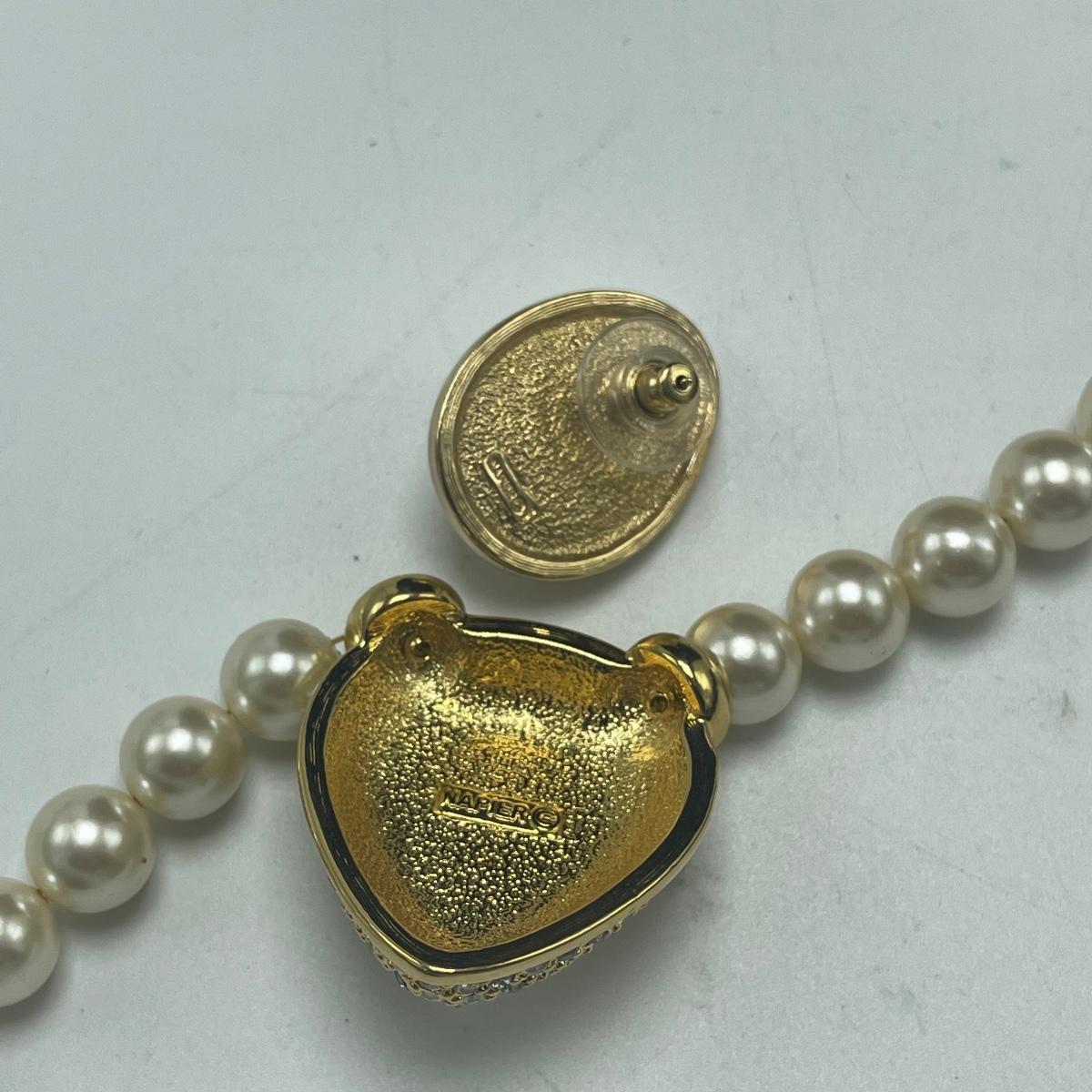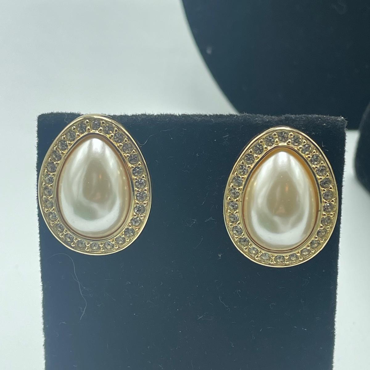 Five Pearl necklaces that includes double and single stranded. We cannot guarantee any authenticity on the pearls. One necklace is marked Napier and has a matching pair of earrings. All earrings are for pierced ears and lot also includes a brooch.