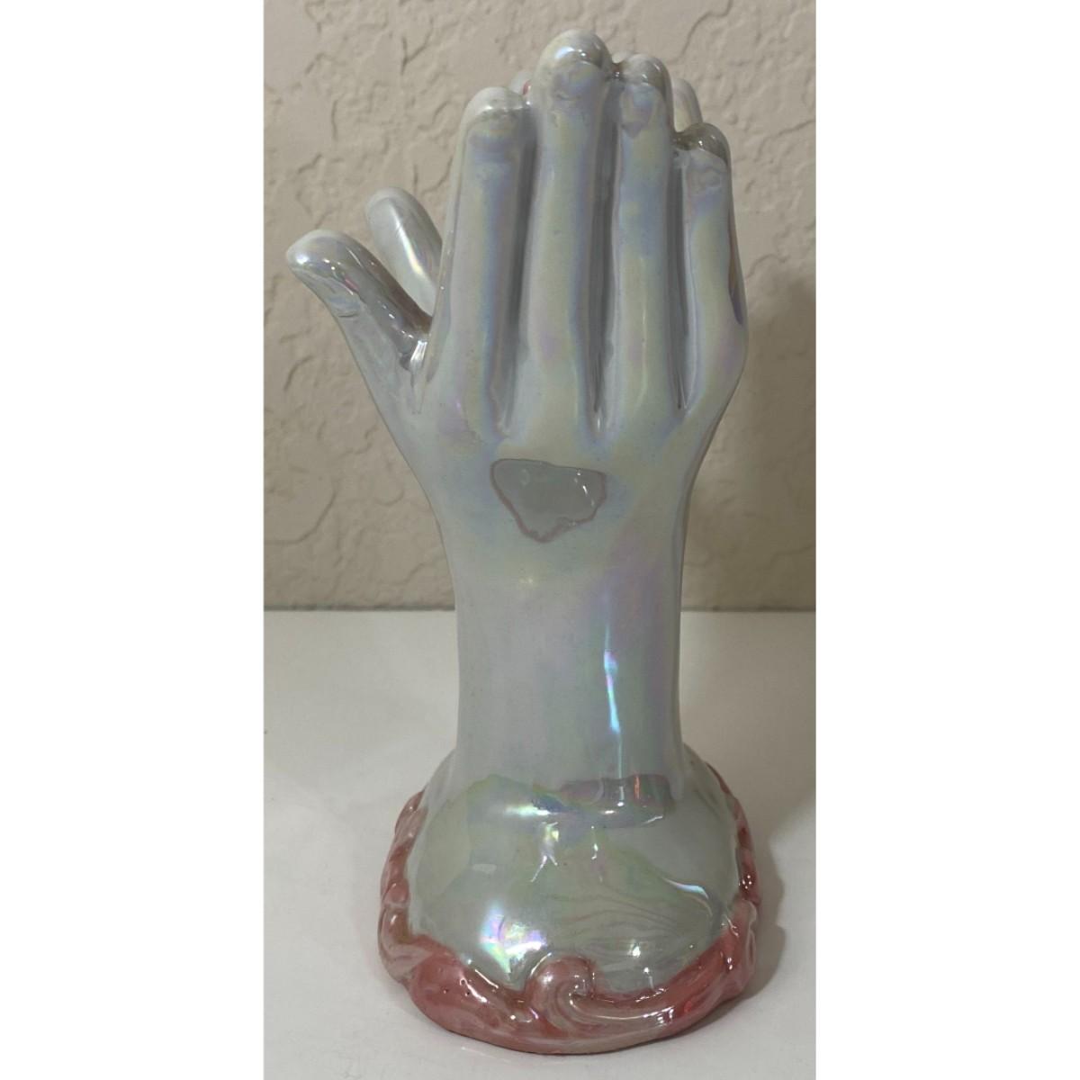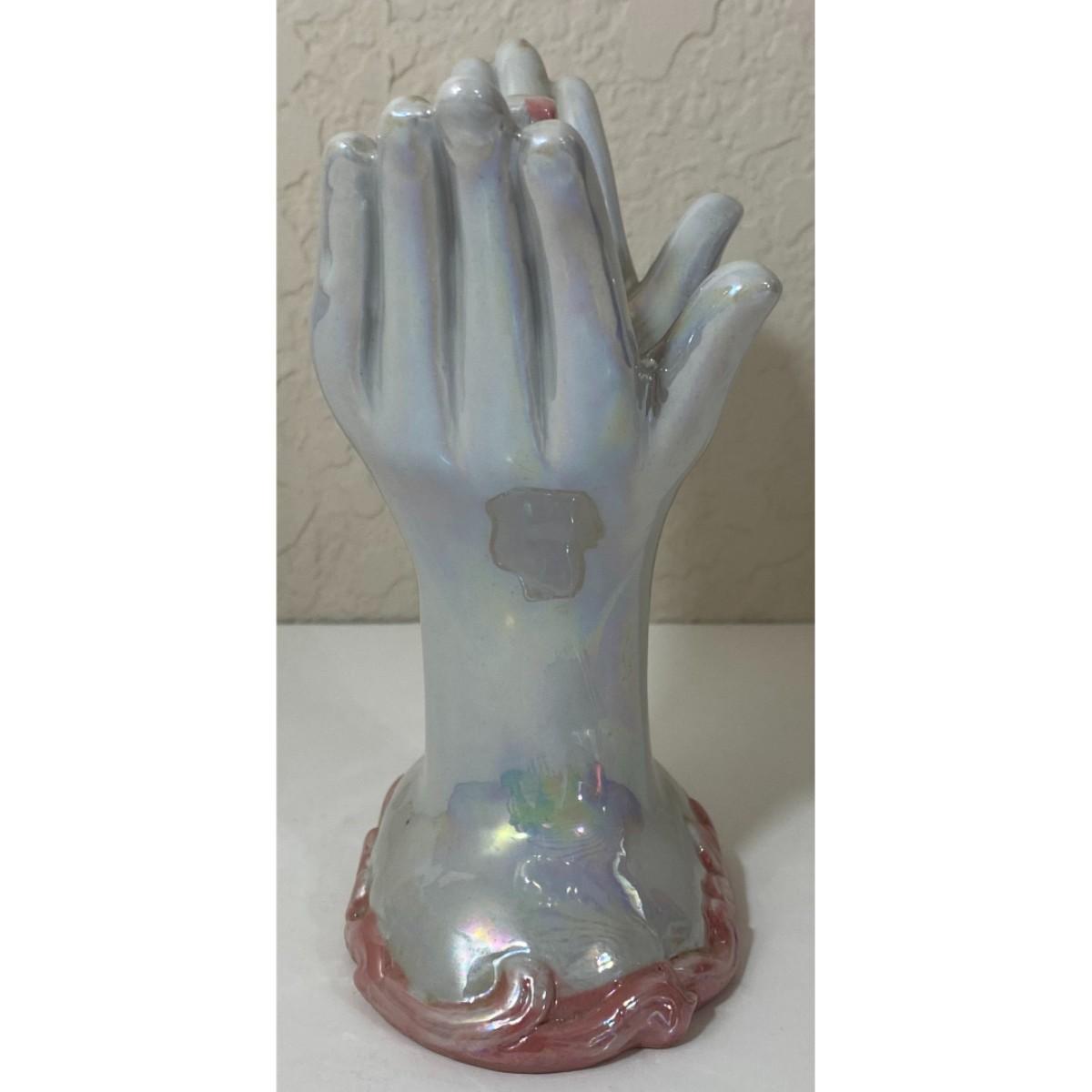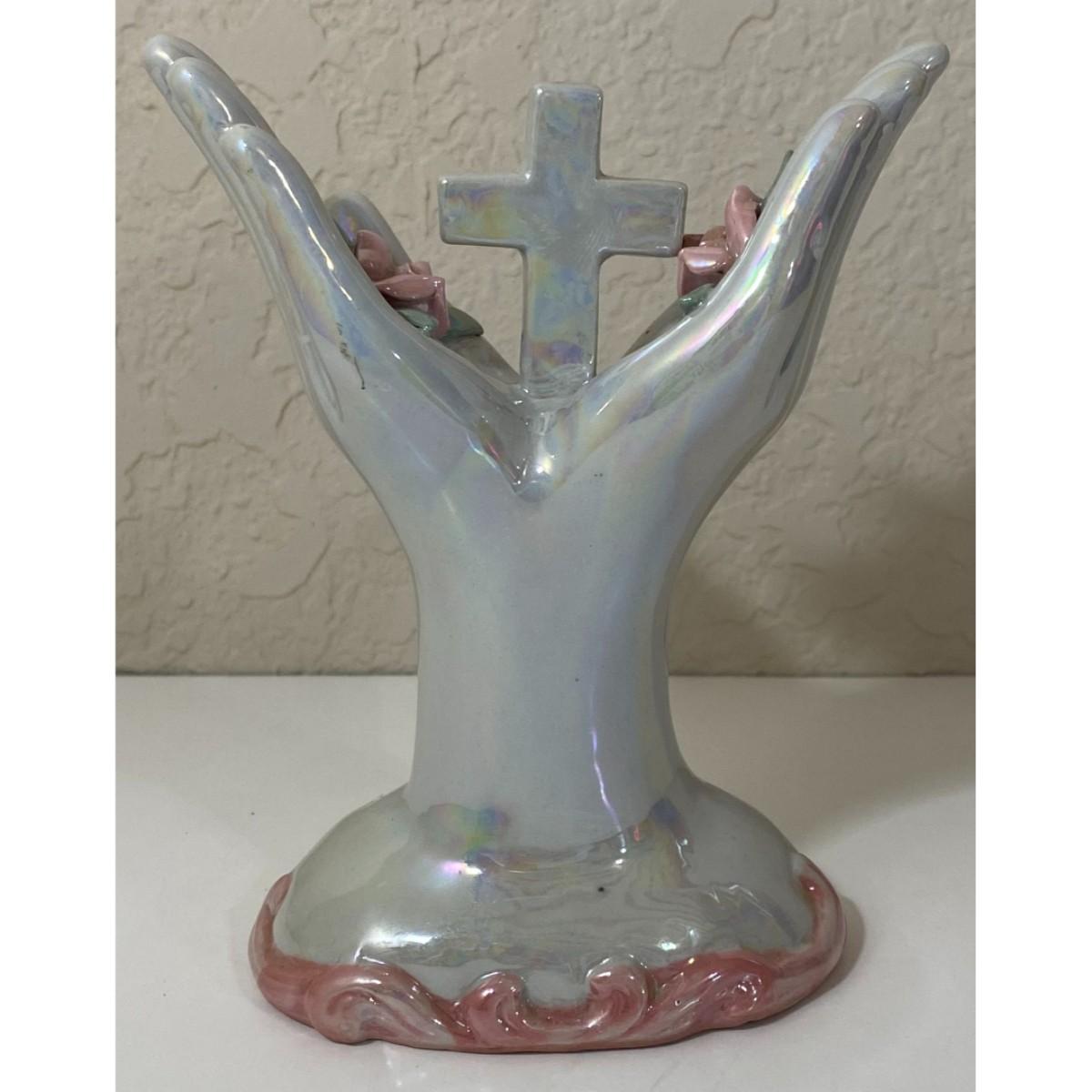 Pearl & Pink Ceramic Hands Holding Cross and Roses Flowers Christian Religious