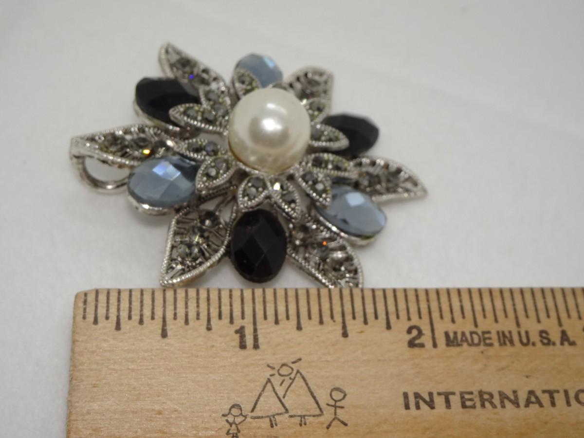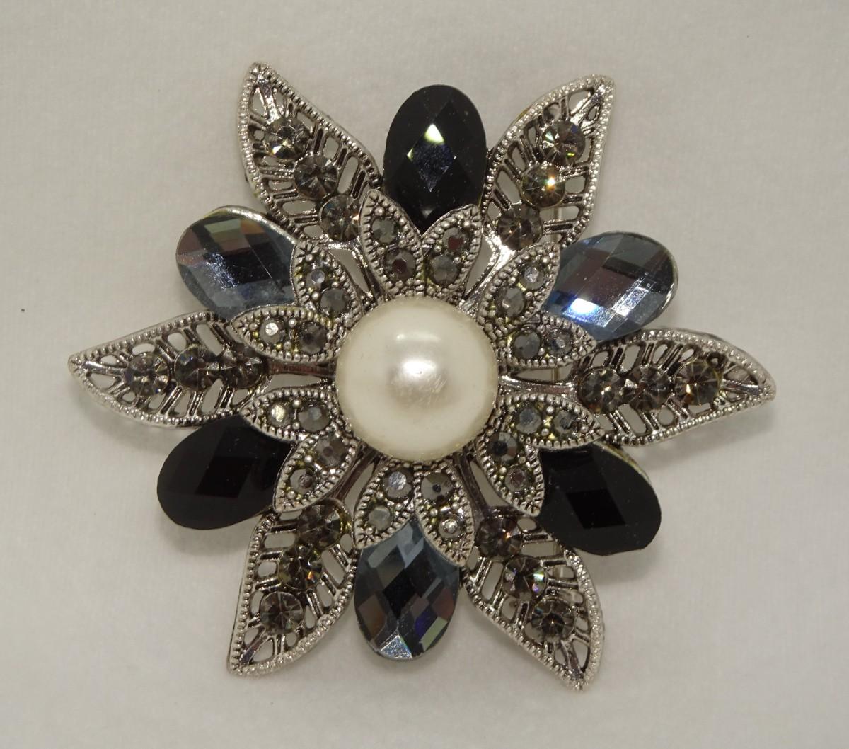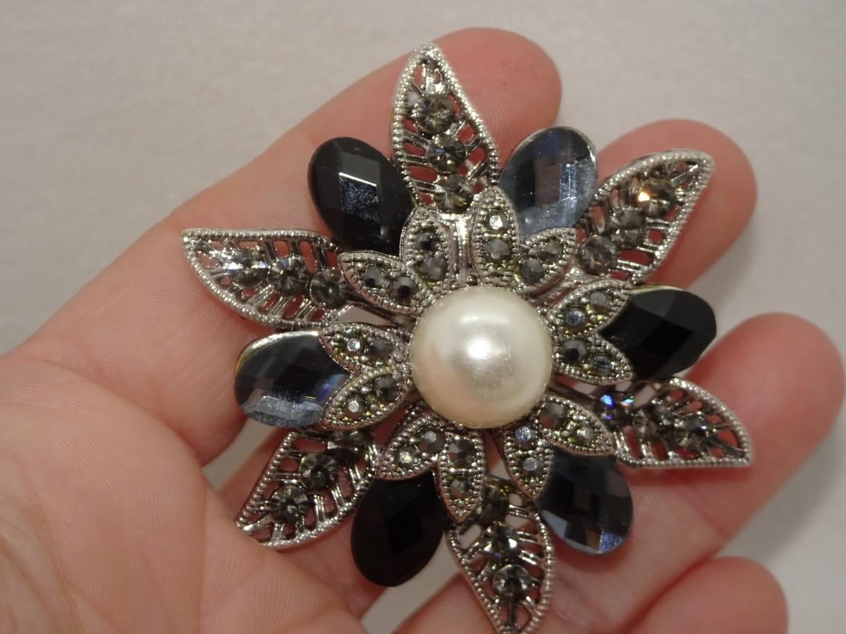 Pearl & Smokey Quartz Rhinestone Filigree Silver Tone Brooch - Statement Pin