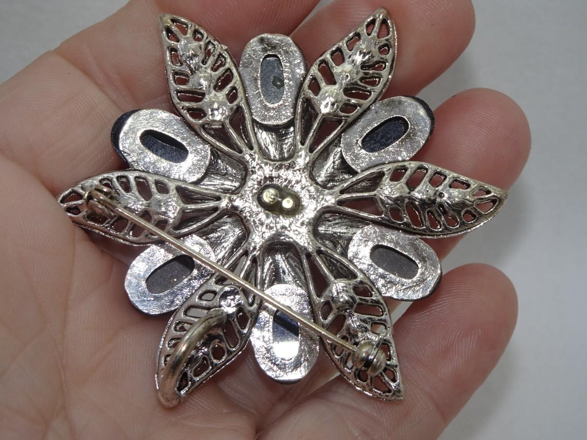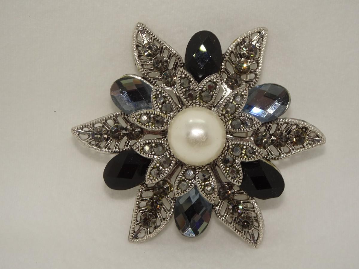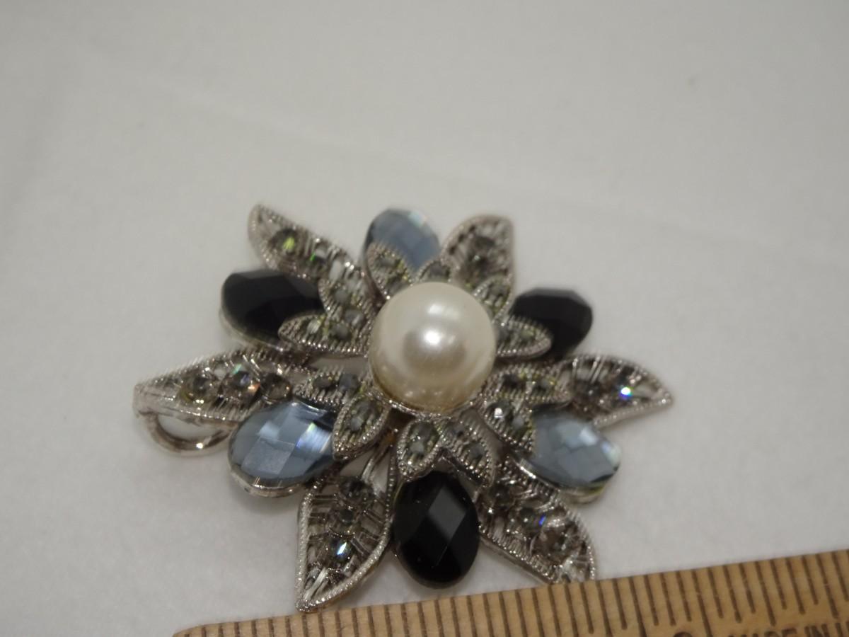 Pearl & Smokey Quartz Rhinestone Filigree Silver Tone Brooch - Statement Pin