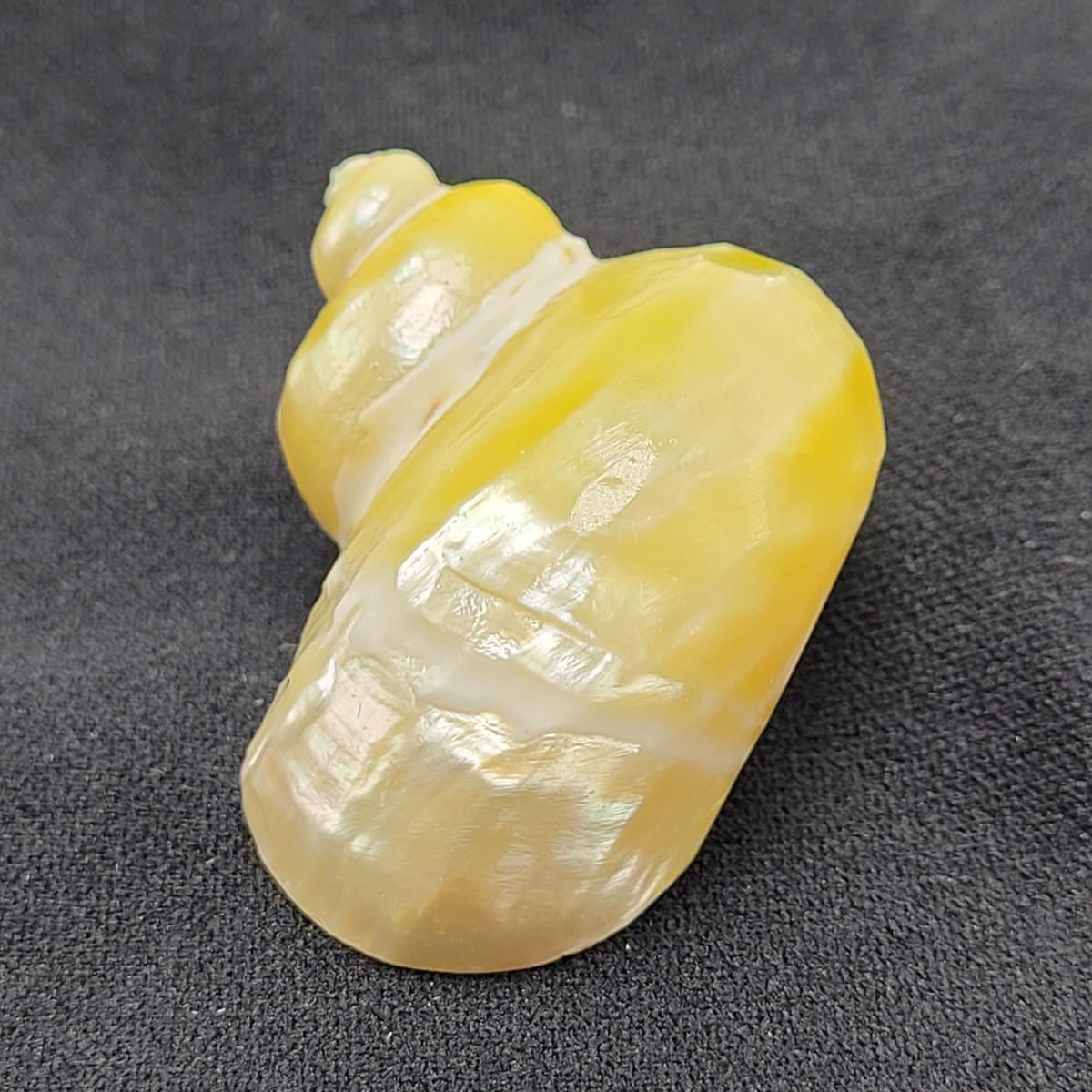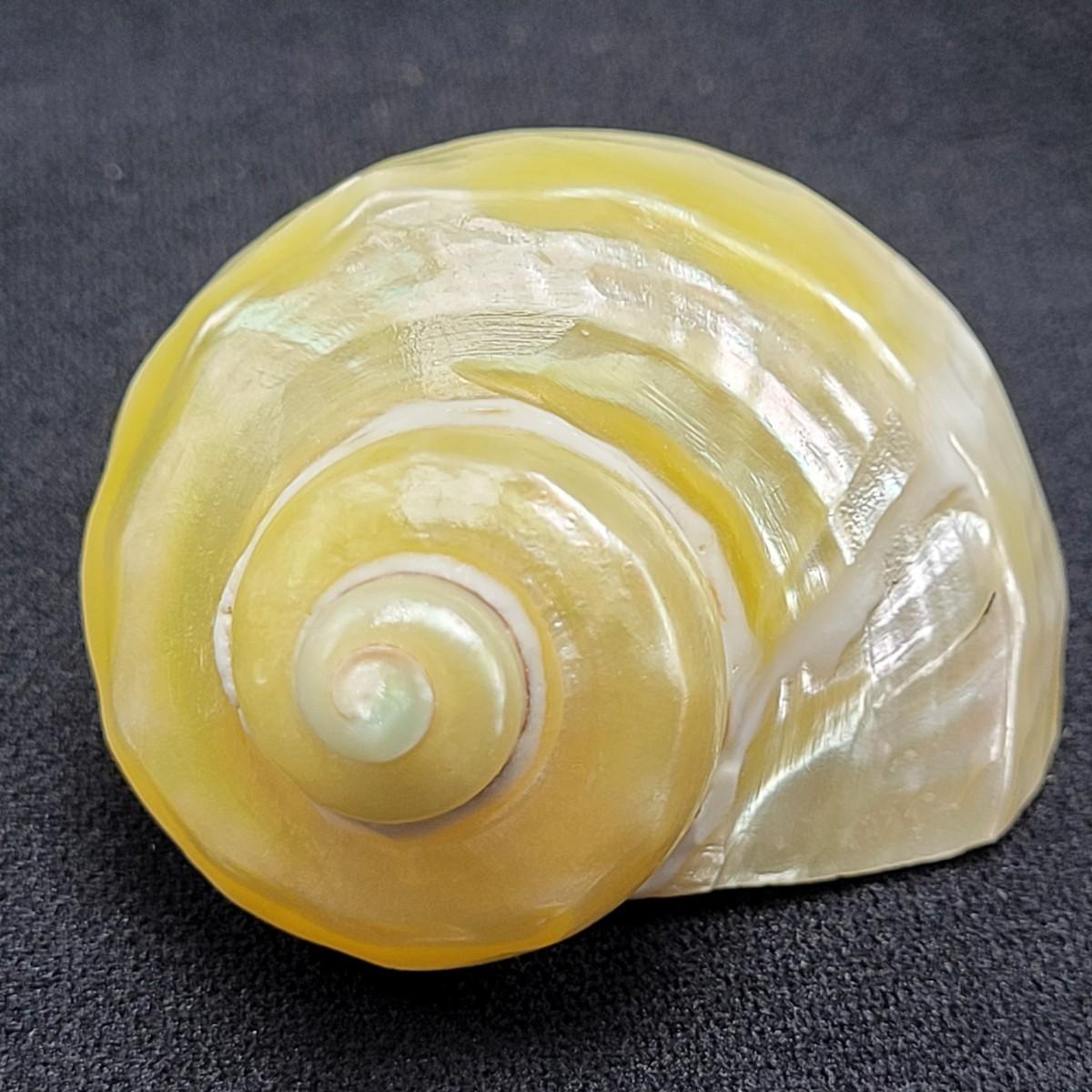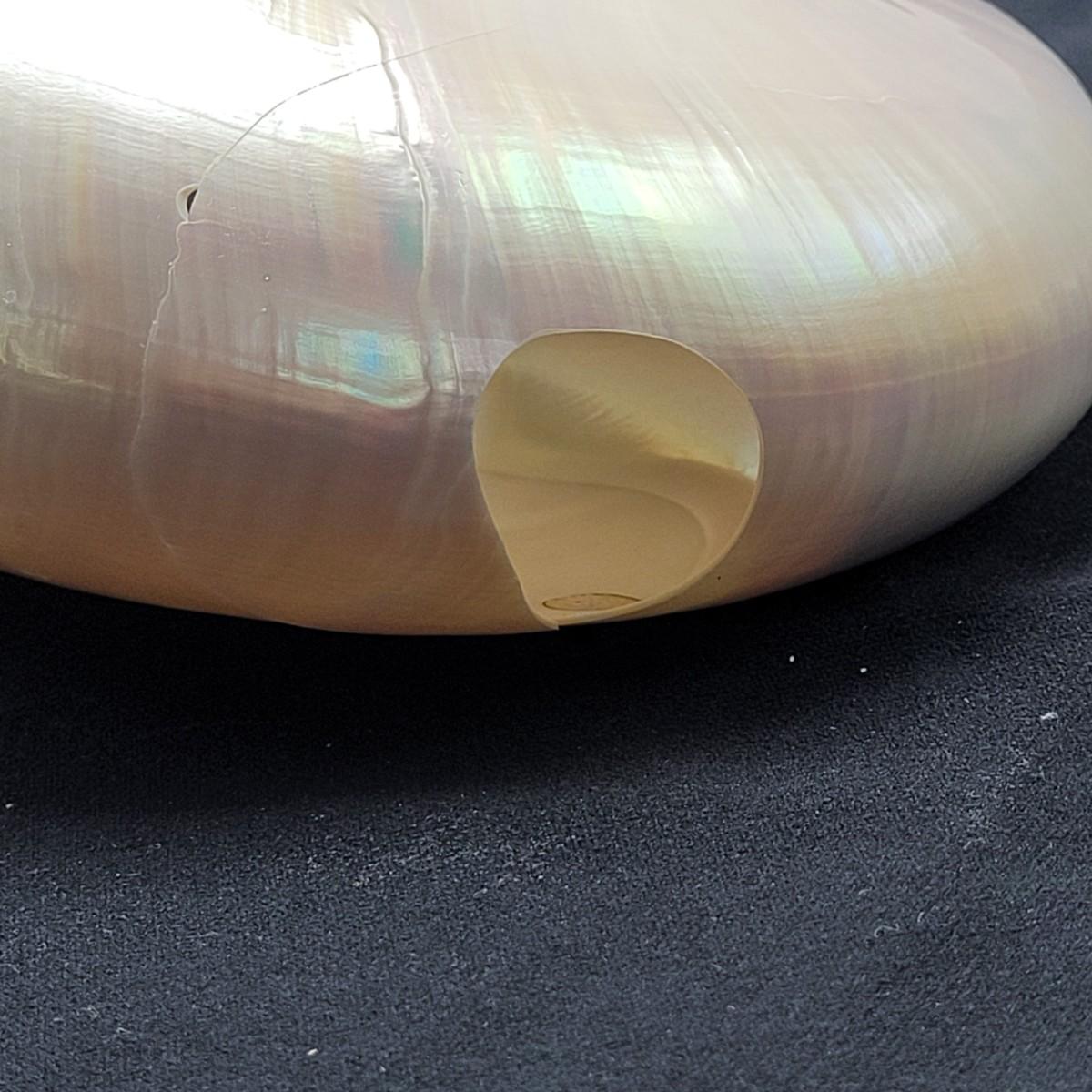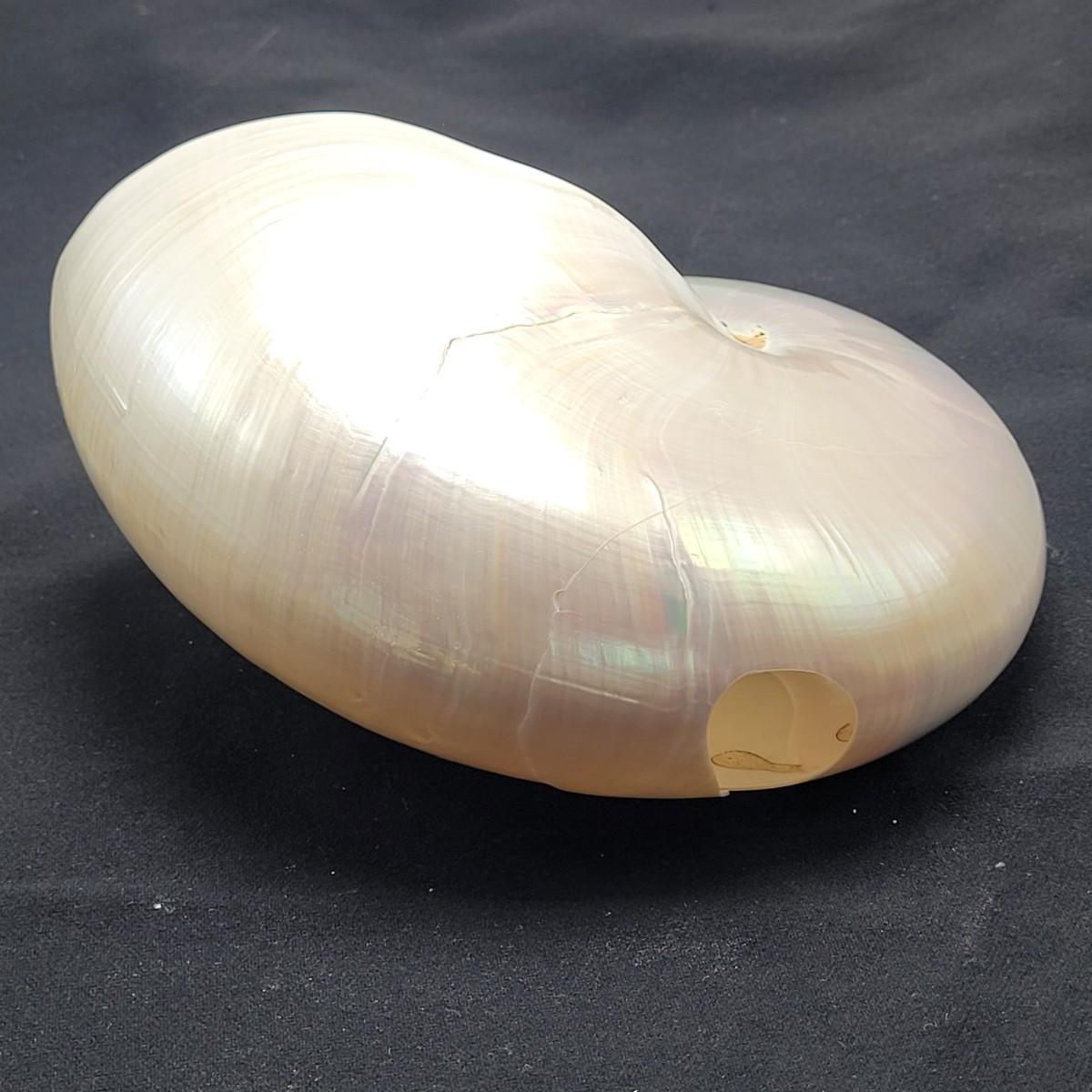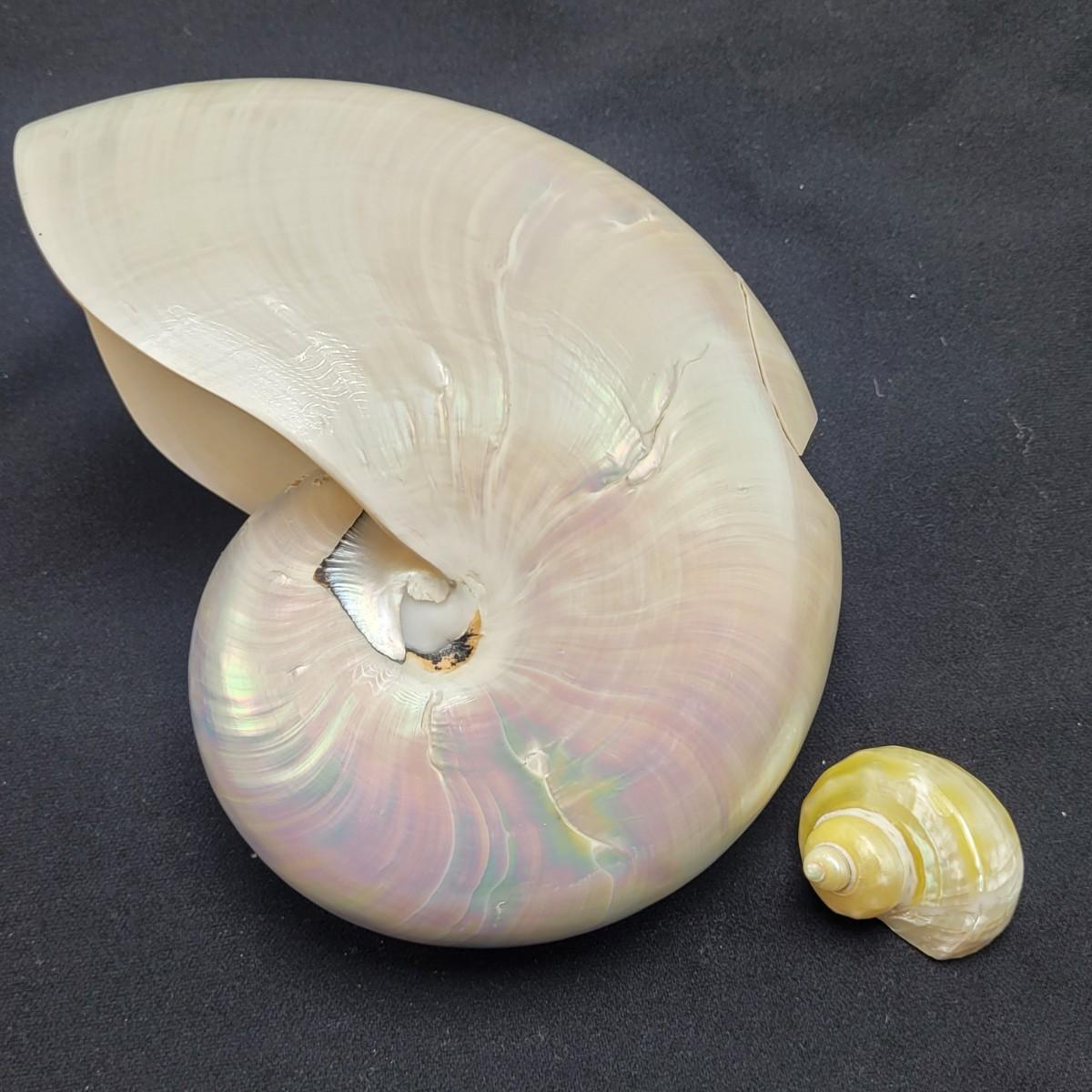 This lot includes one large pearlized nautilus shell and smaller pearlized snail shell. The nautilus shell is large and chambered. It measures 7" x 5" x 3.5"H. It has a small hole and crack on the backside. See photos. The smaller shell appears to be from a snail or other small sea creature and is also pearlized in a more yellow tone.
