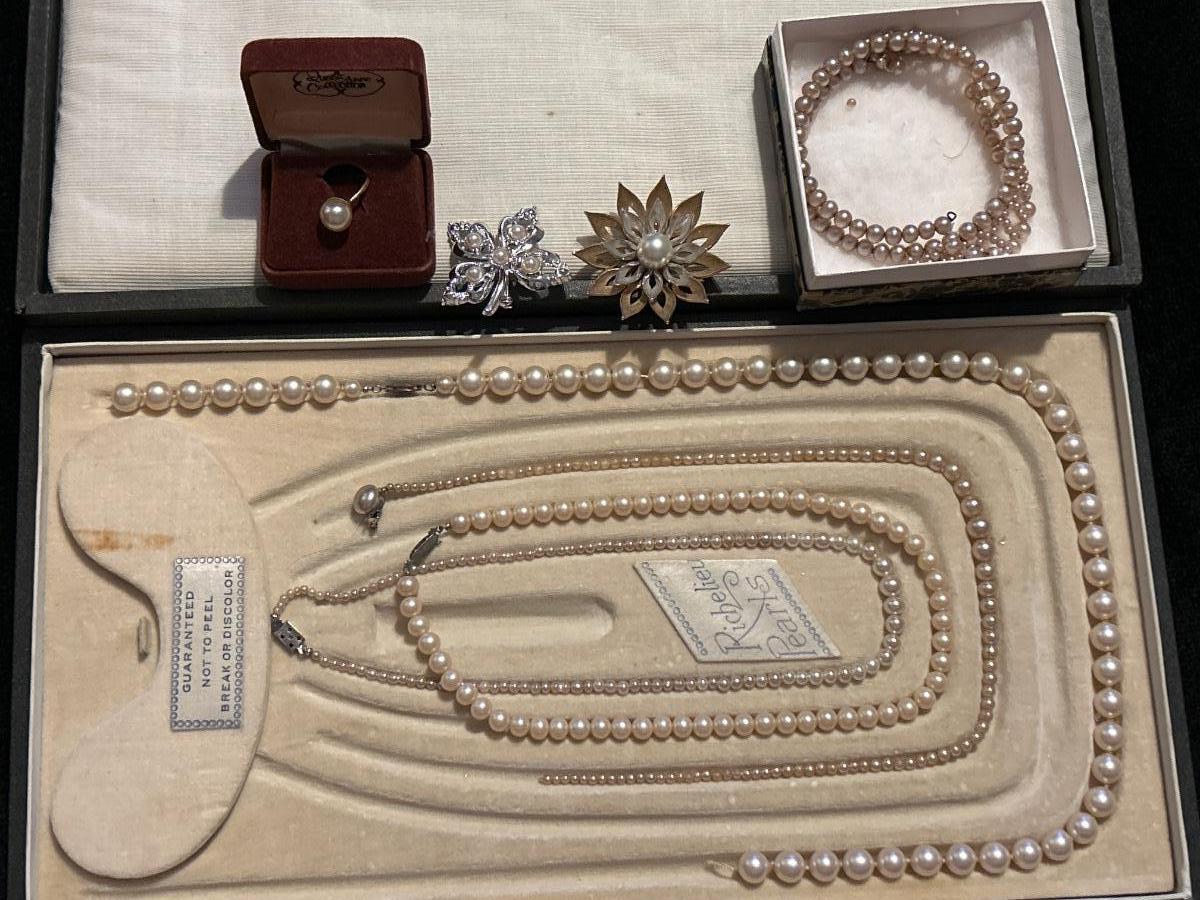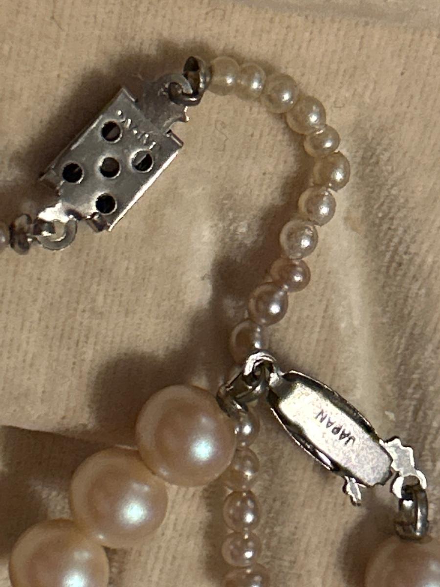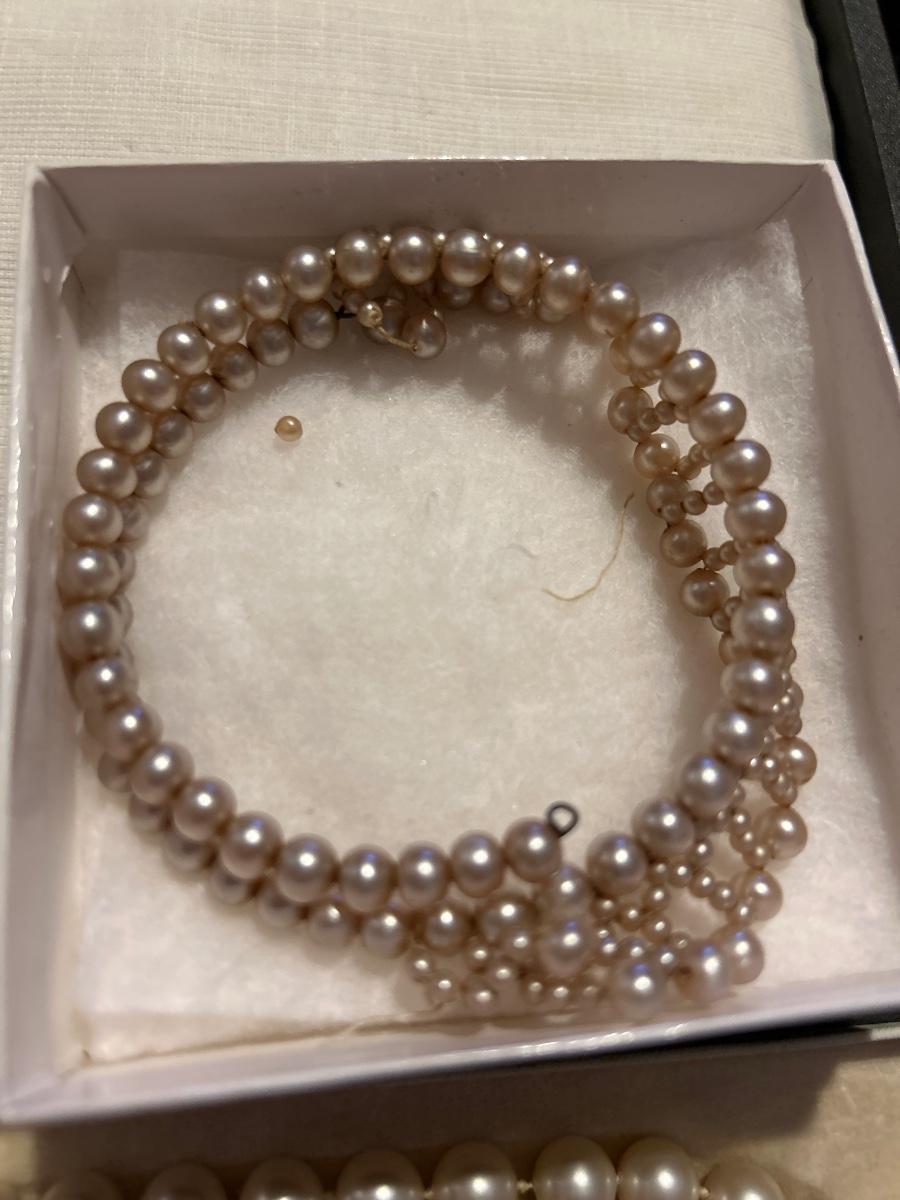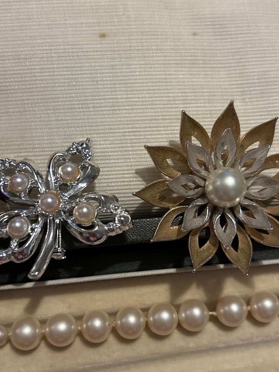 The center two strands are not broken and they are stamped Japan. This is just the box they were in, so I cannot guarantee they are real or not. The larger brooch is stamped Sarah Canada.