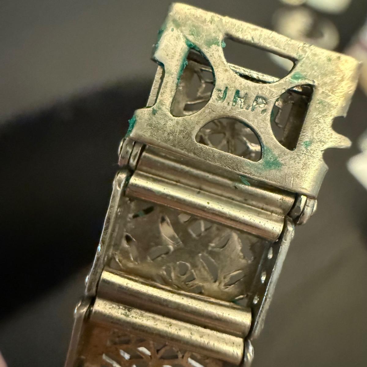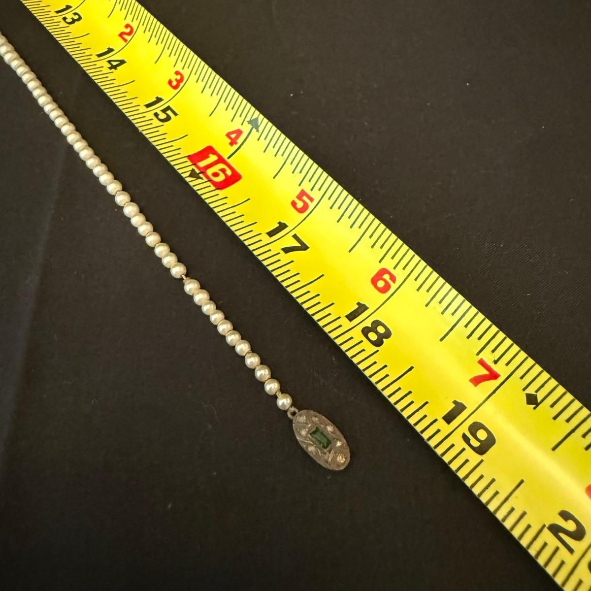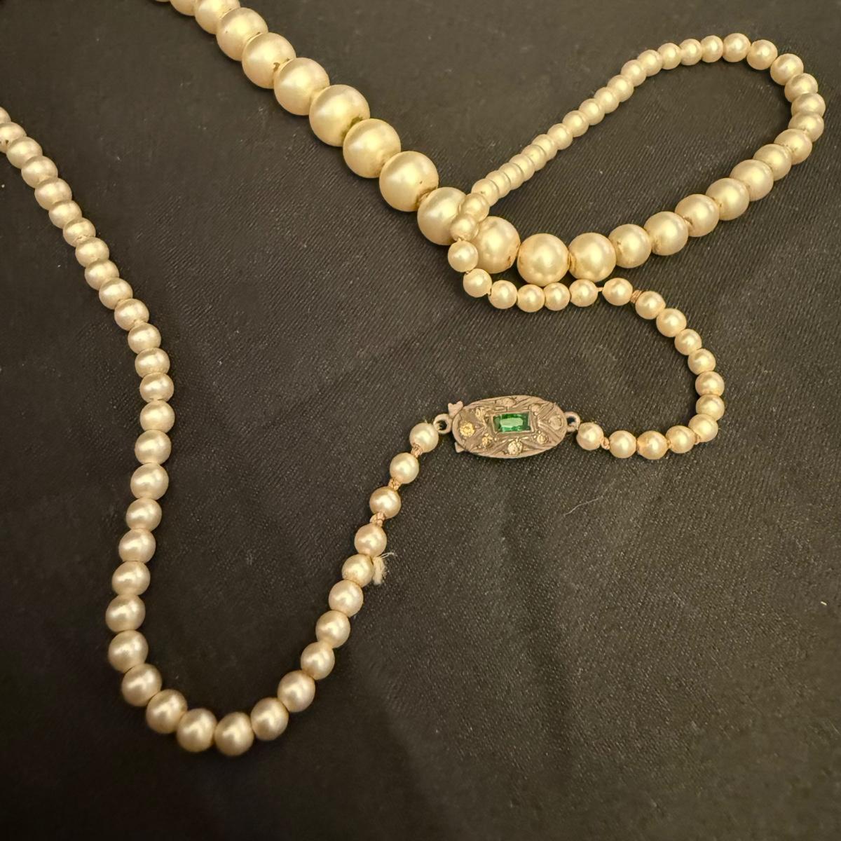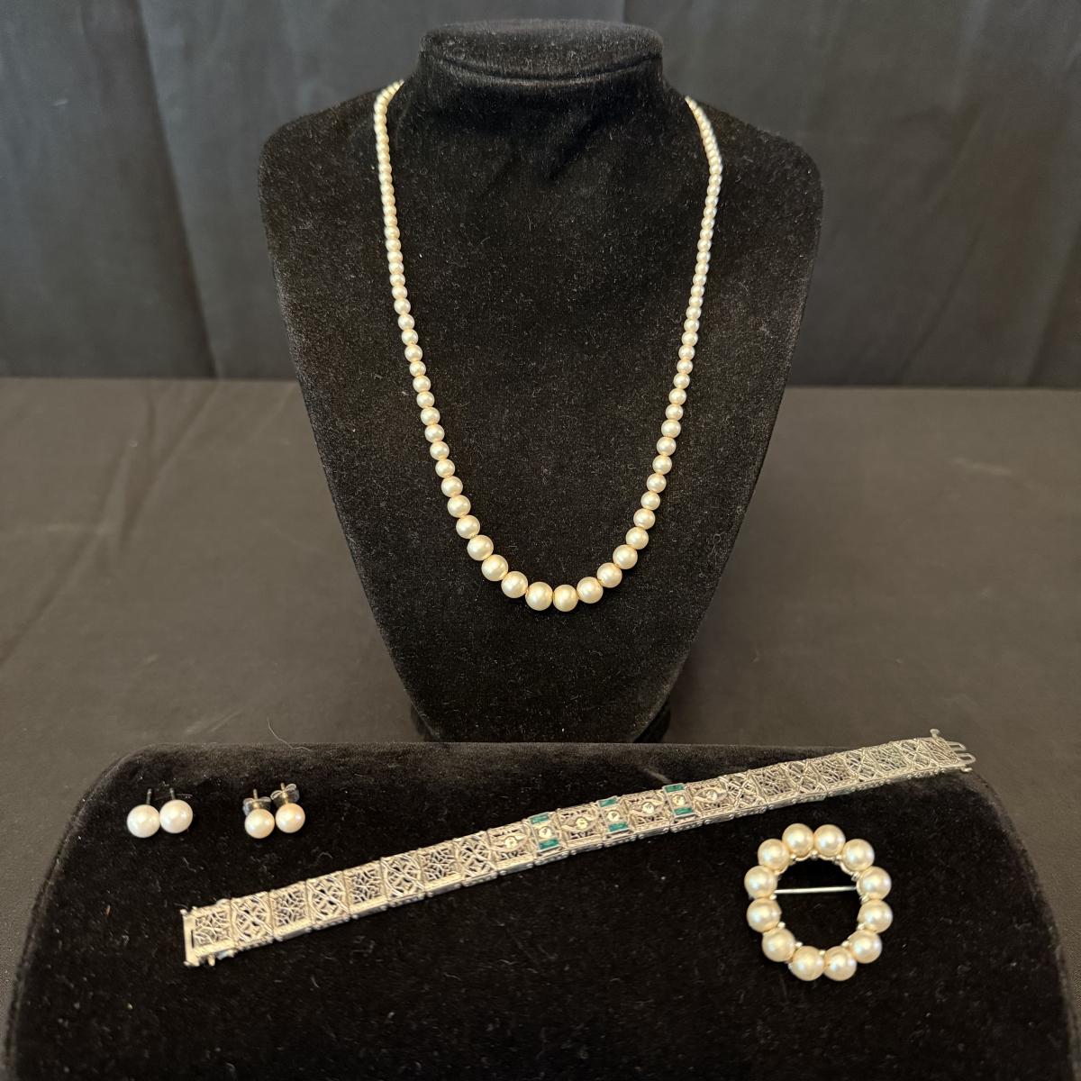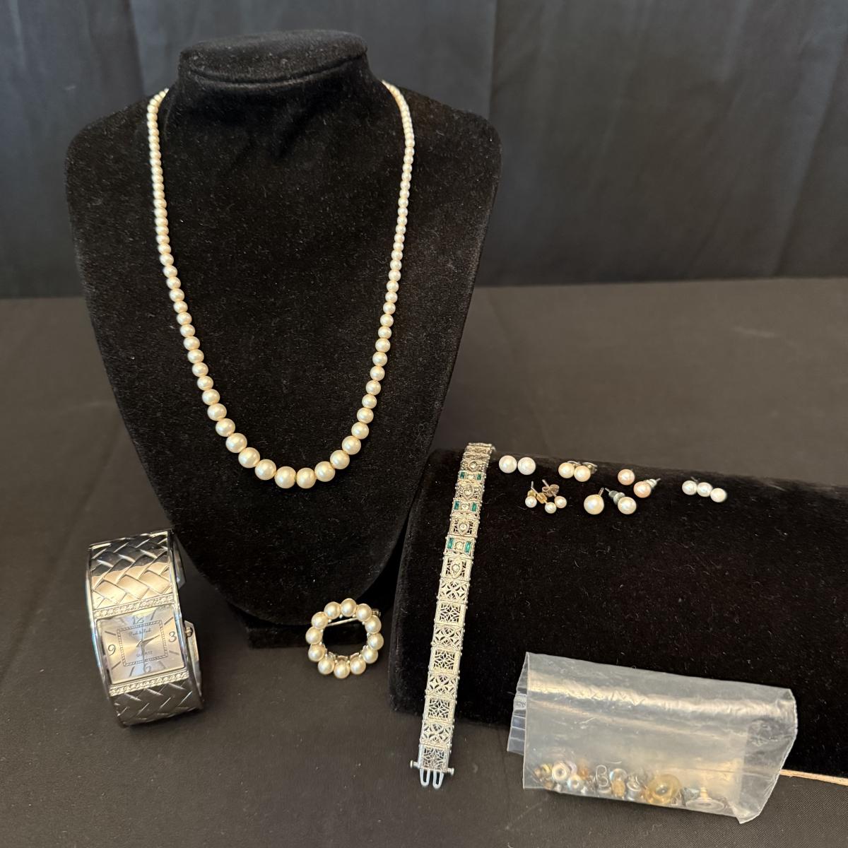 This elegant collection includes one pearl necklace, a small brooch with pearl-like beads, a silver bracelet with clear and green gemstones, a Peck & Peck brand watch, and 14 individual pearl post earrings (some are a pair but not all have a match). Additionally, there are extra earring backs included. The necklace is 18“. There is some residue on some of the pearls. It has a marking on the clasp that is hard to decipher. The watch is not currently functioning.
