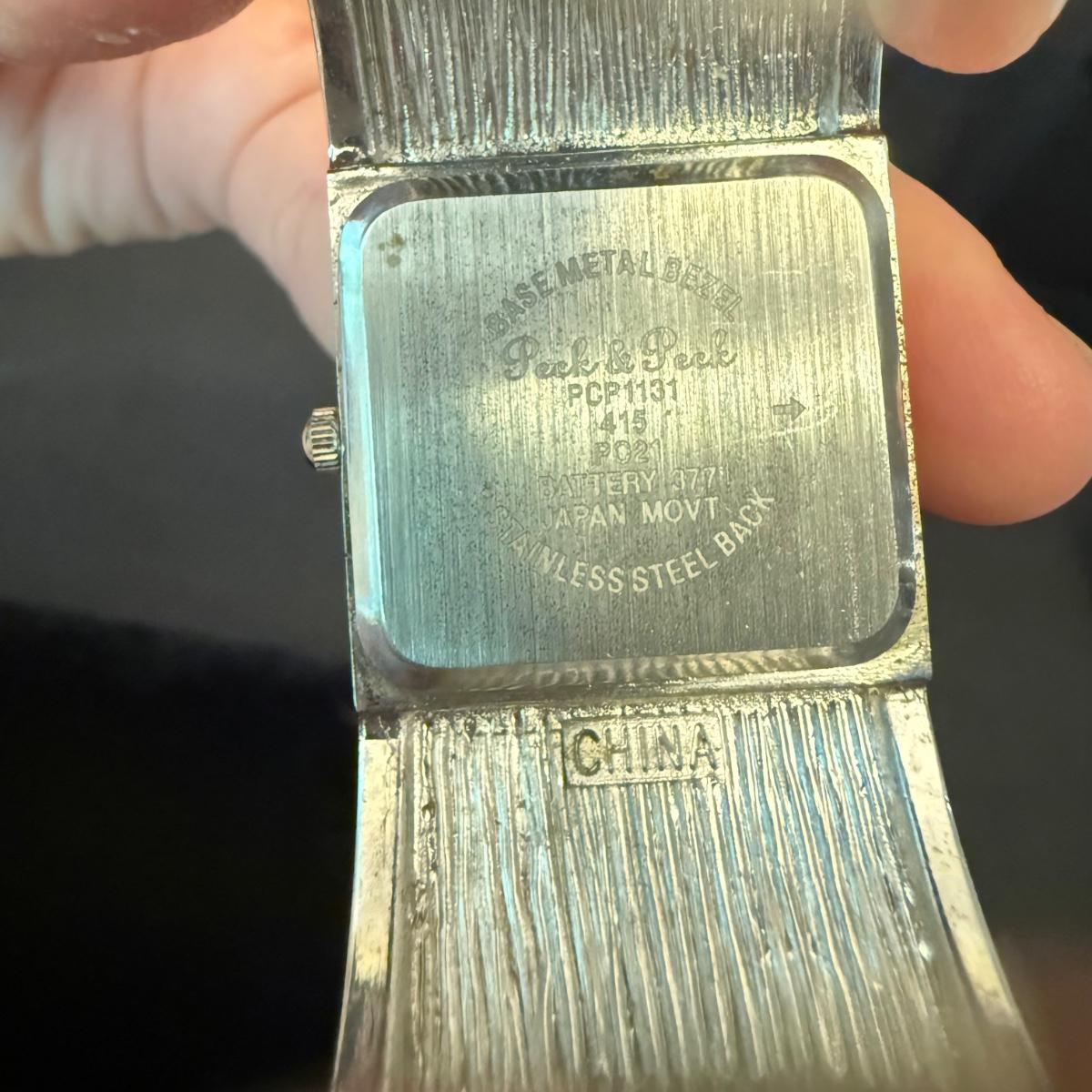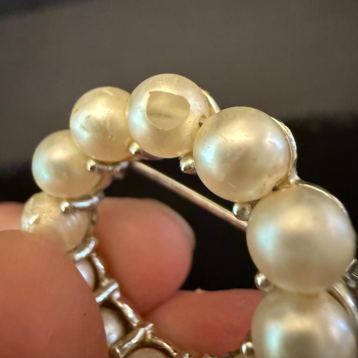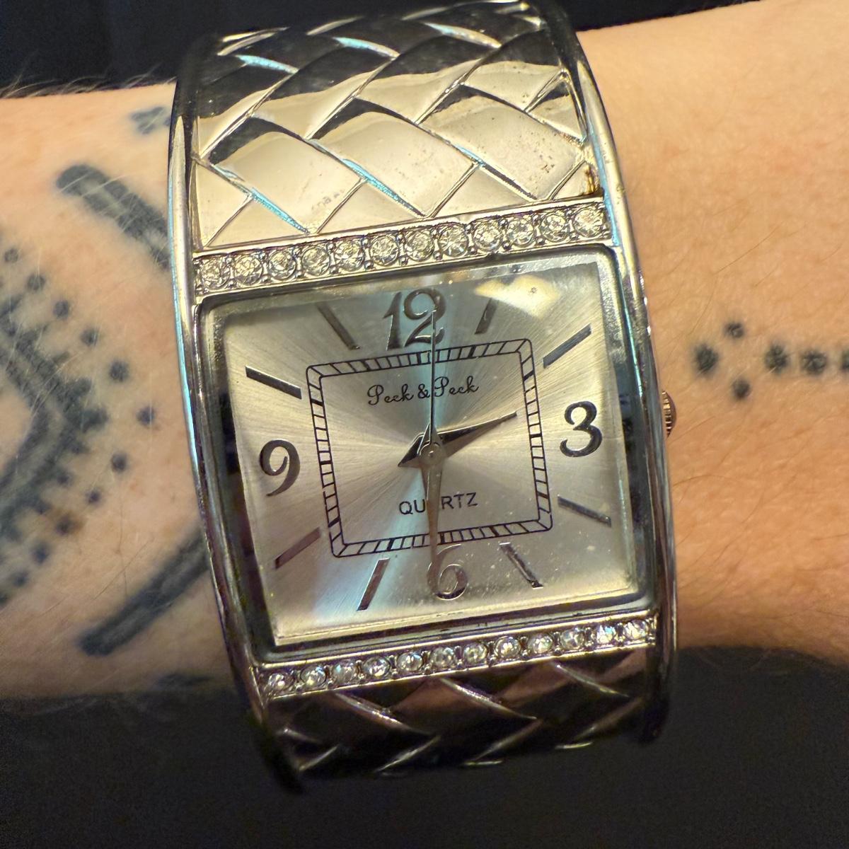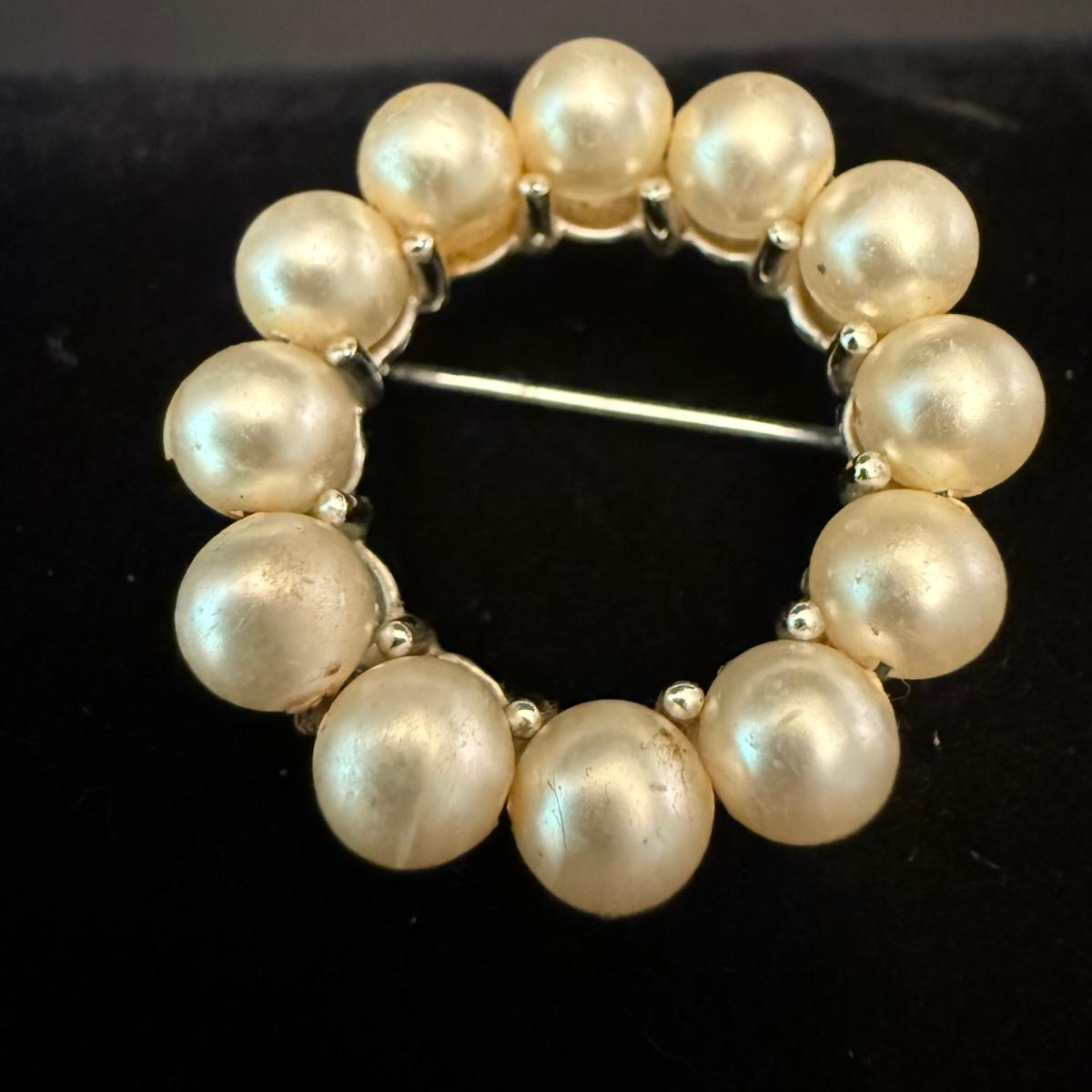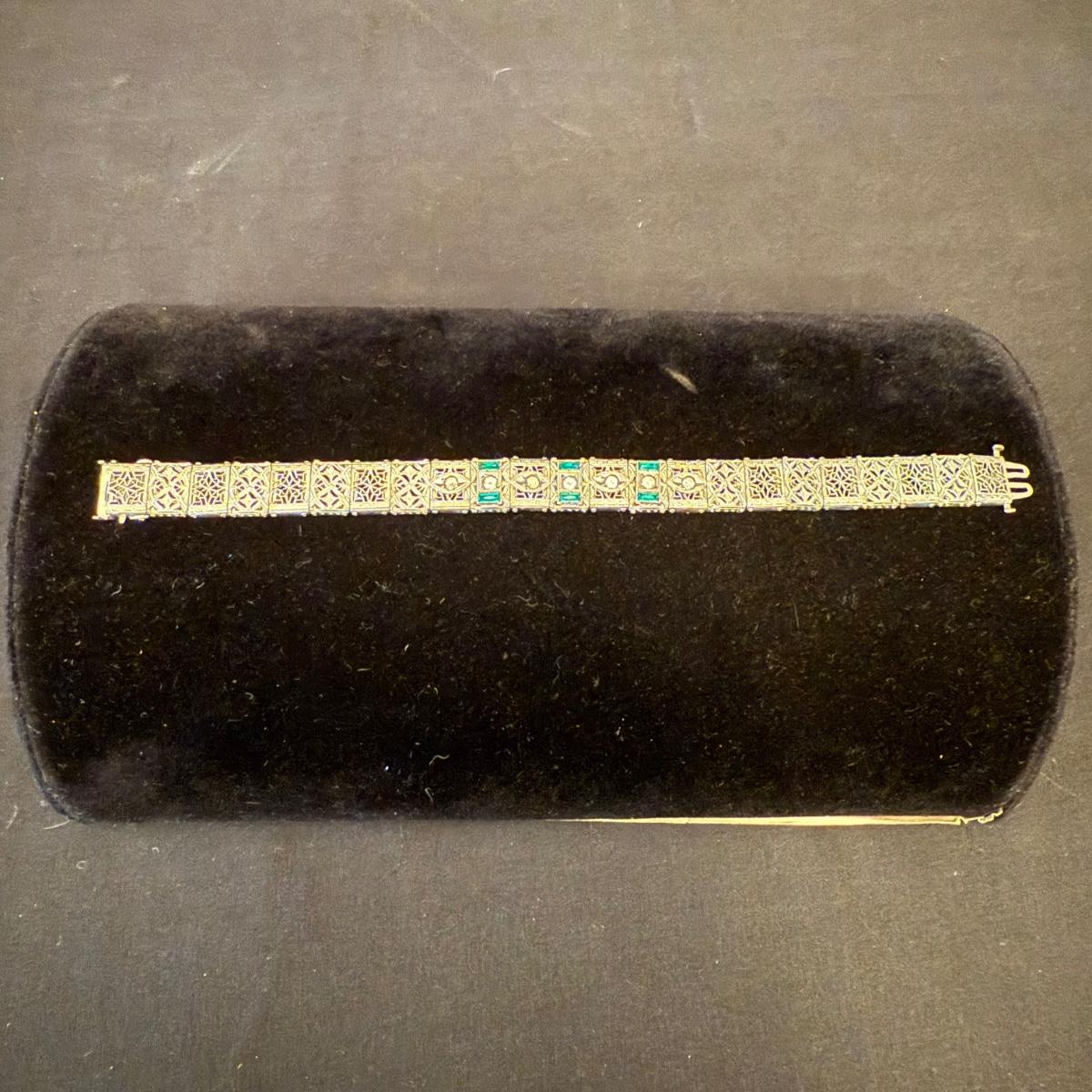 This elegant collection includes one pearl necklace, a small brooch with pearl-like beads, a silver bracelet with clear and green gemstones, a Peck & Peck brand watch, and 14 individual pearl post earrings (some are a pair but not all have a match). Additionally, there are extra earring backs included. The necklace is 18“. There is some residue on some of the pearls. It has a marking on the clasp that is hard to decipher. The watch is not currently functioning.