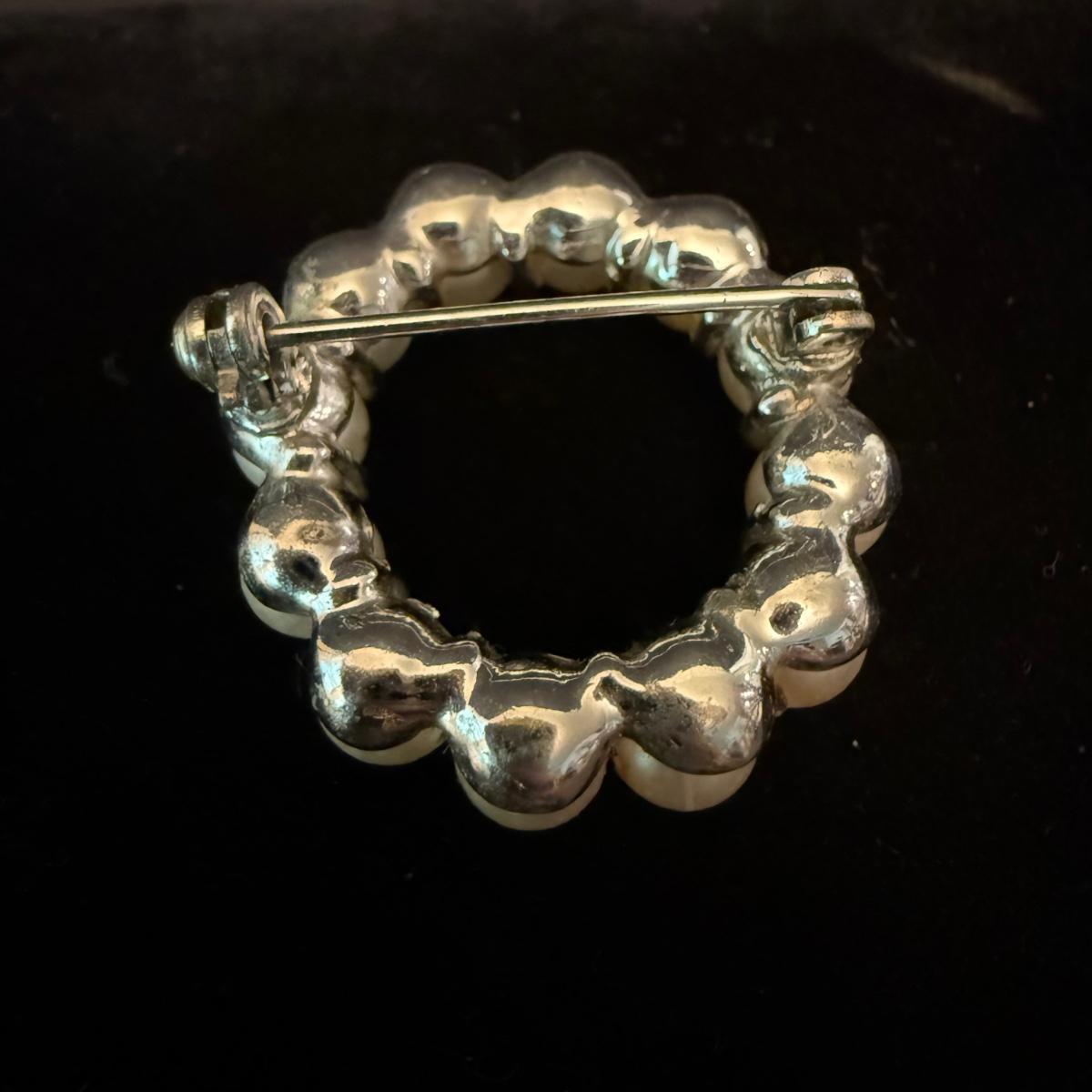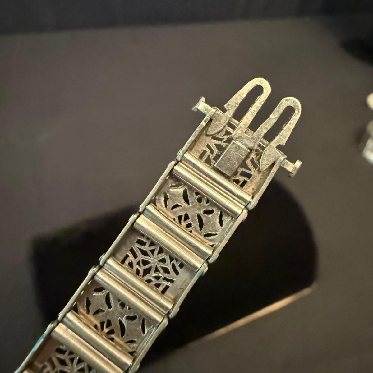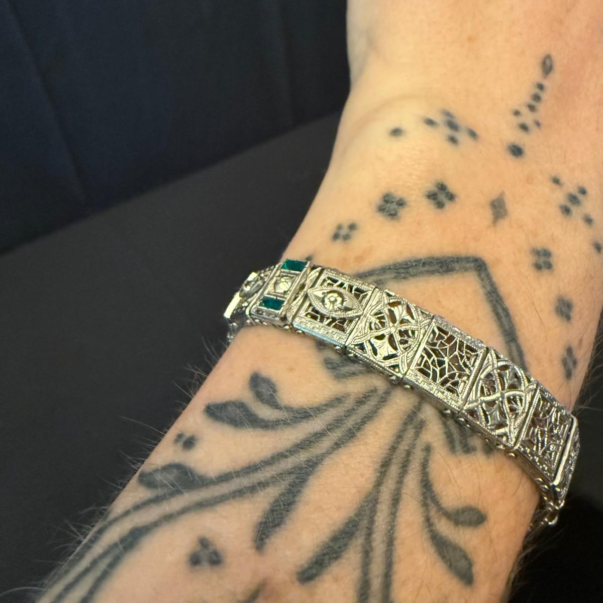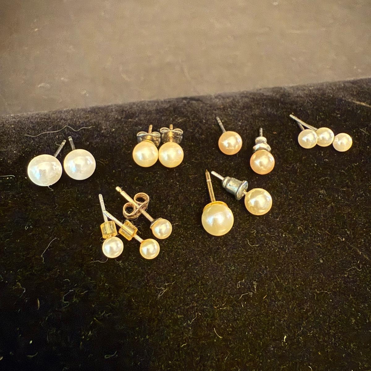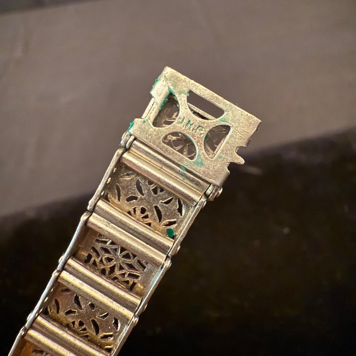 This elegant collection includes one pearl necklace, a small brooch with pearl-like beads, a silver bracelet with clear and green gemstones, a Peck & Peck brand watch, and 14 individual pearl post earrings (some are a pair but not all have a match). Additionally, there are extra earring backs included. The necklace is 18“. There is some residue on some of the pearls. It has a marking on the clasp that is hard to decipher. The watch is not currently functioning.