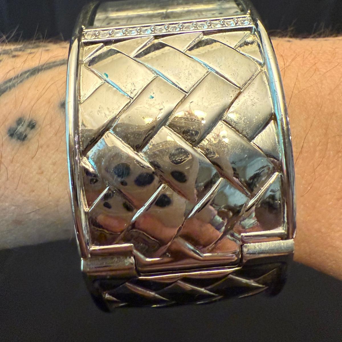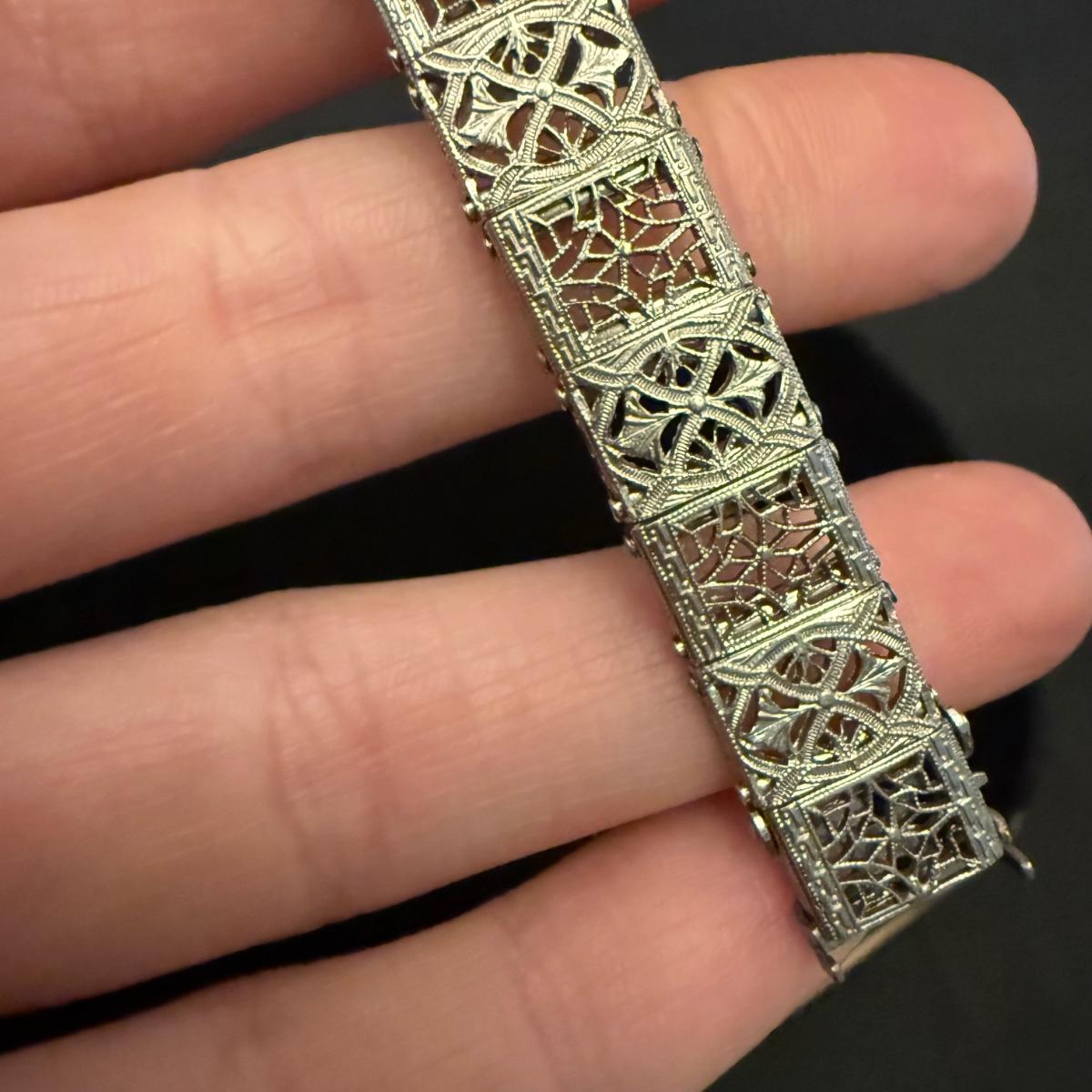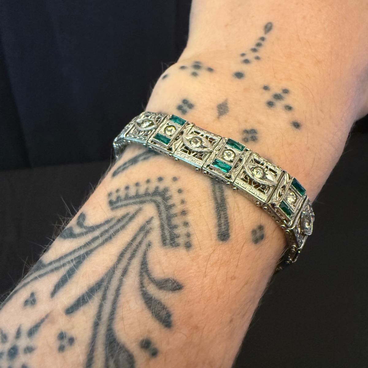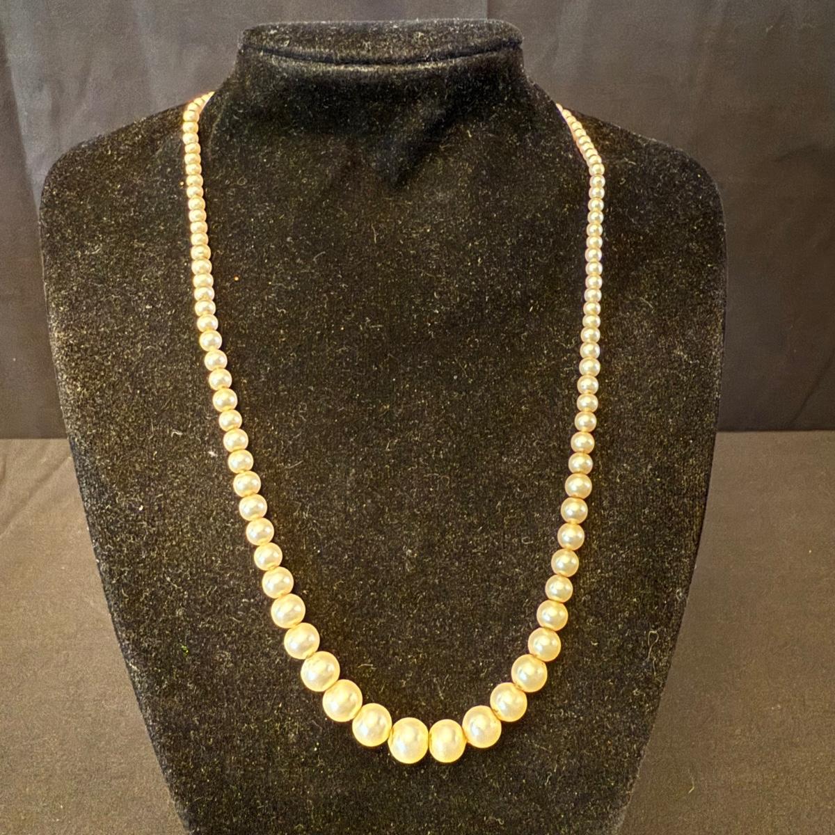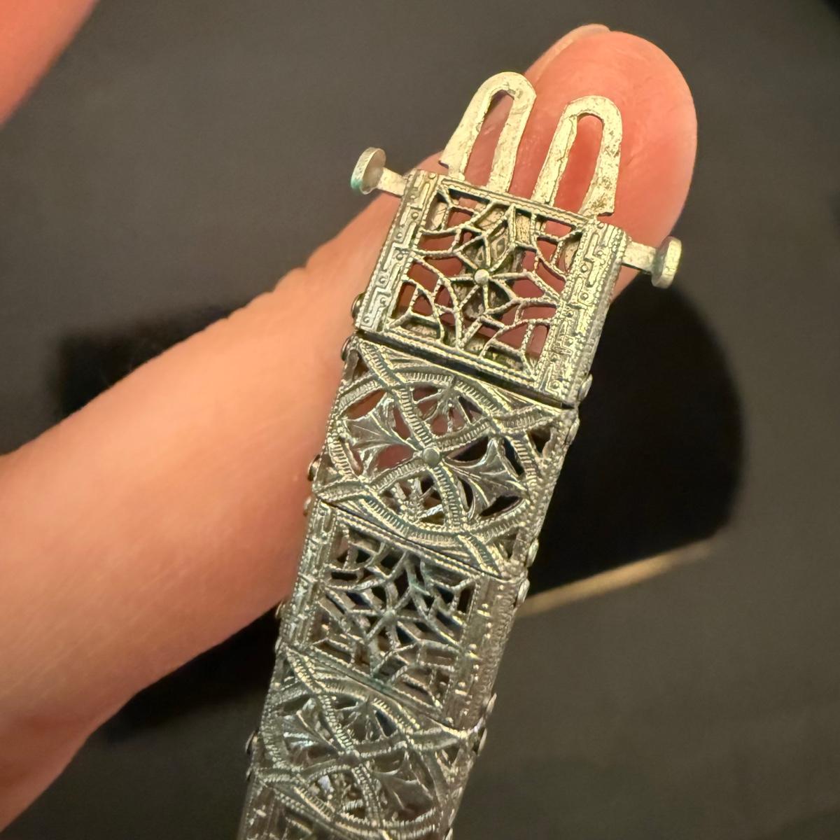 This elegant collection includes one pearl necklace, a small brooch with pearl-like beads, a silver bracelet with clear and green gemstones, a Peck & Peck brand watch, and 14 individual pearl post earrings (some are a pair but not all have a match). Additionally, there are extra earring backs included. The necklace is 18“. There is some residue on some of the pearls. It has a marking on the clasp that is hard to decipher. The watch is not currently functioning.