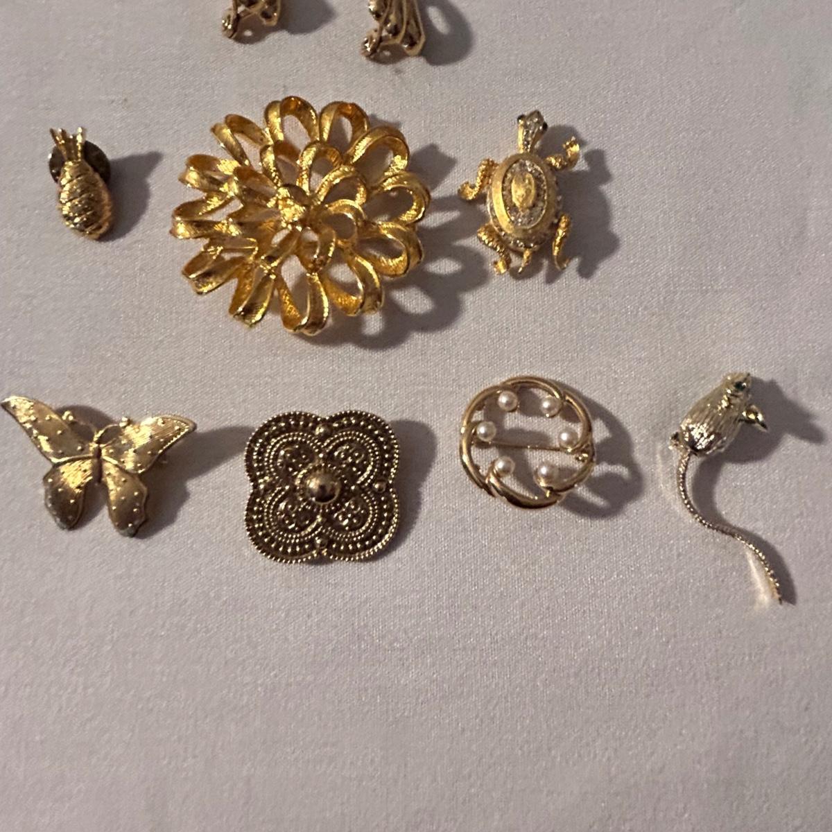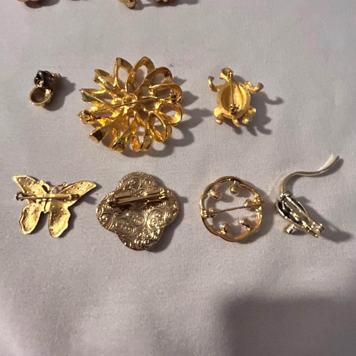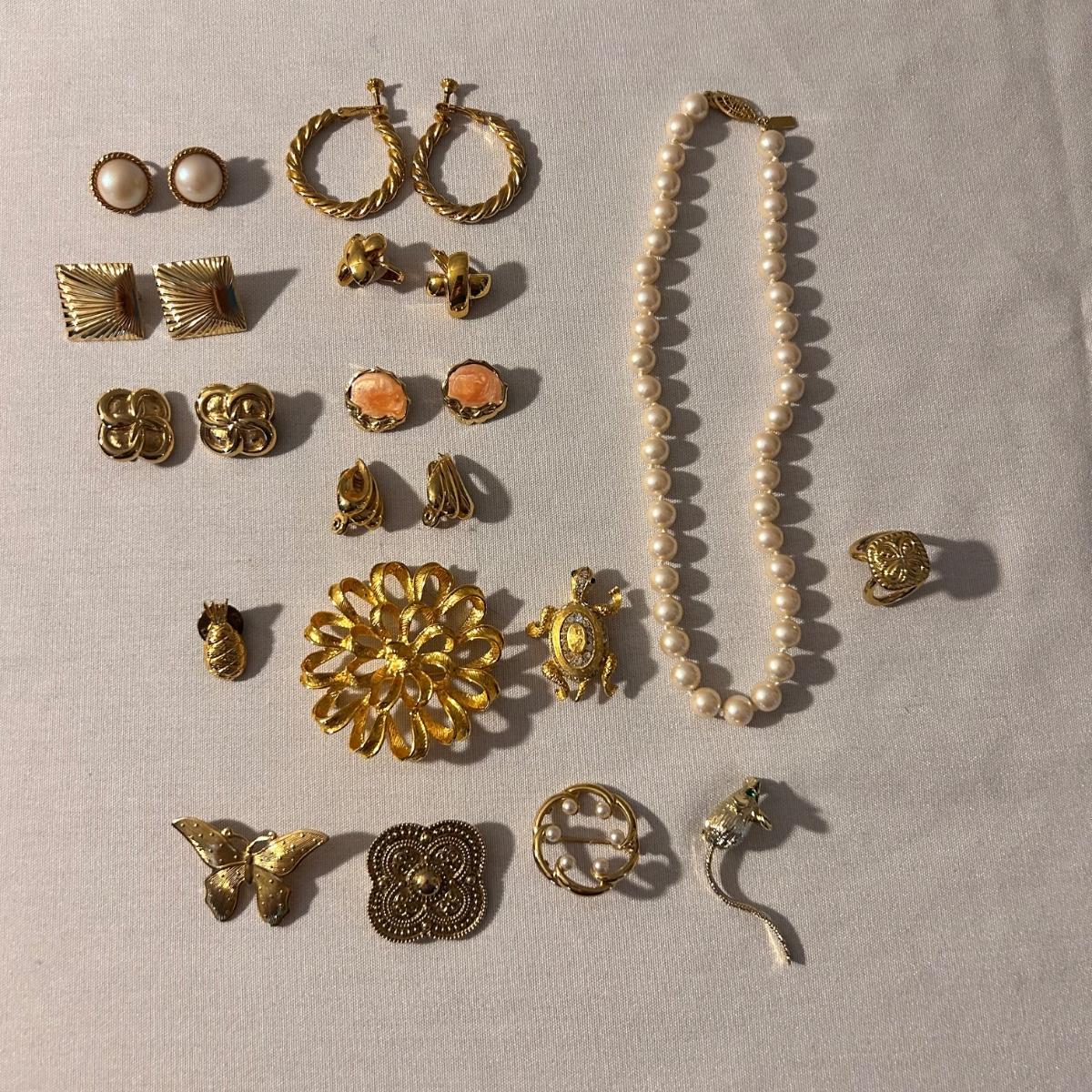 Two pearl necklaces with one being a cluster of strands. Seven, mostly gold toned pins and eight pairs of clip earrings. A few are Monet. Shipping available. All sales are final. No returns or refunds. Please bid accordingly.