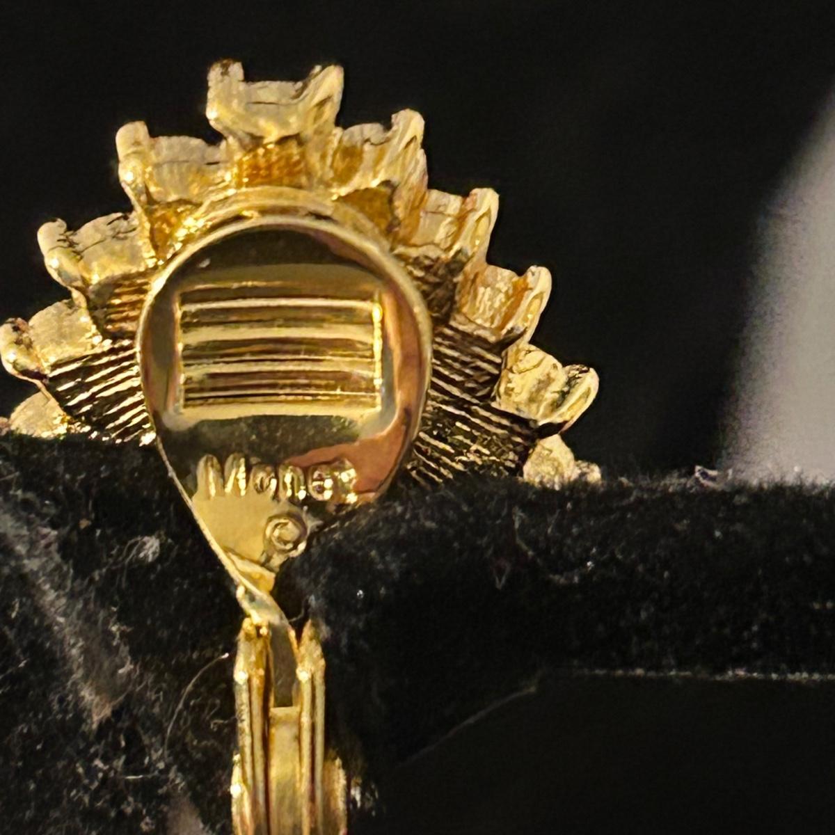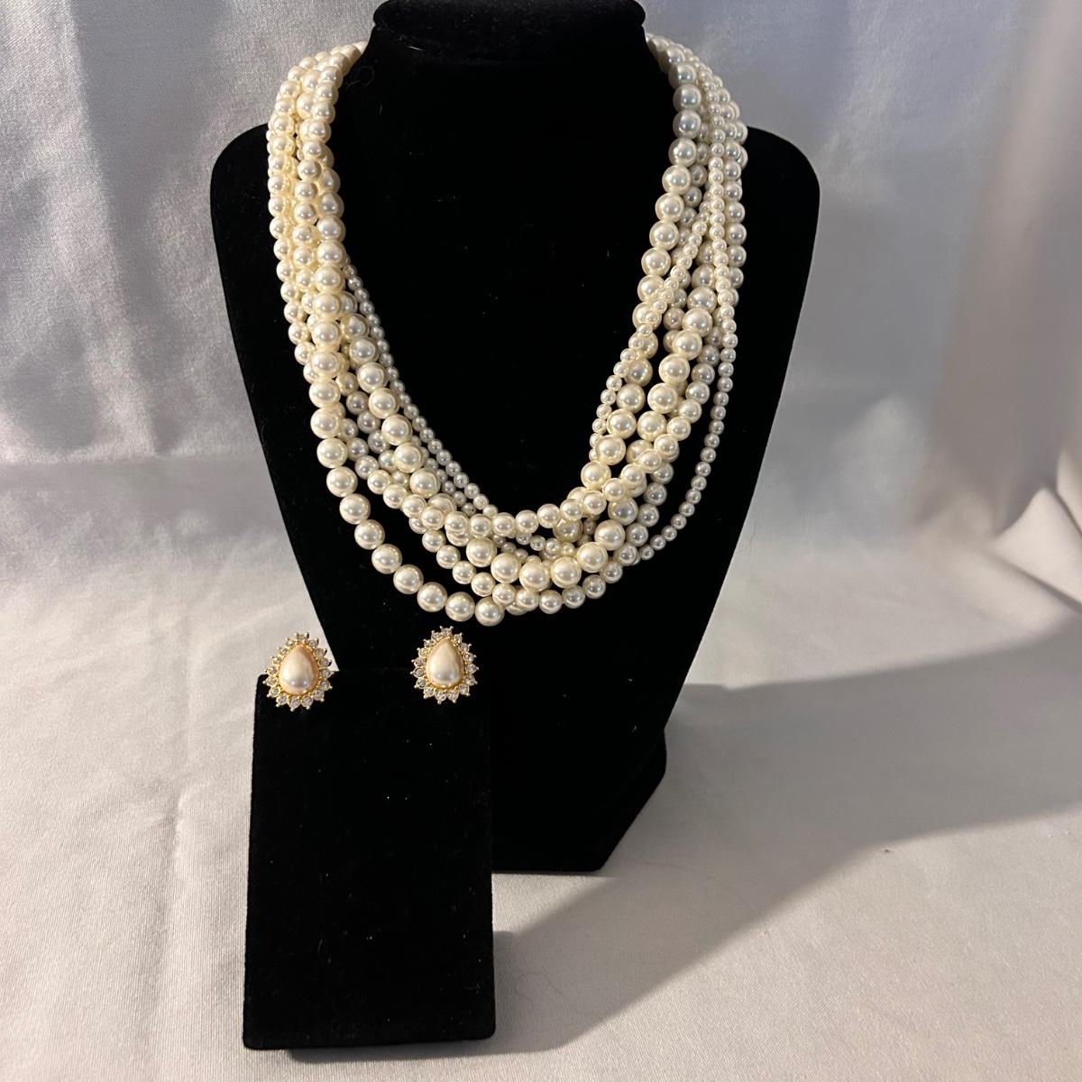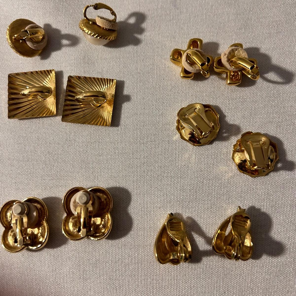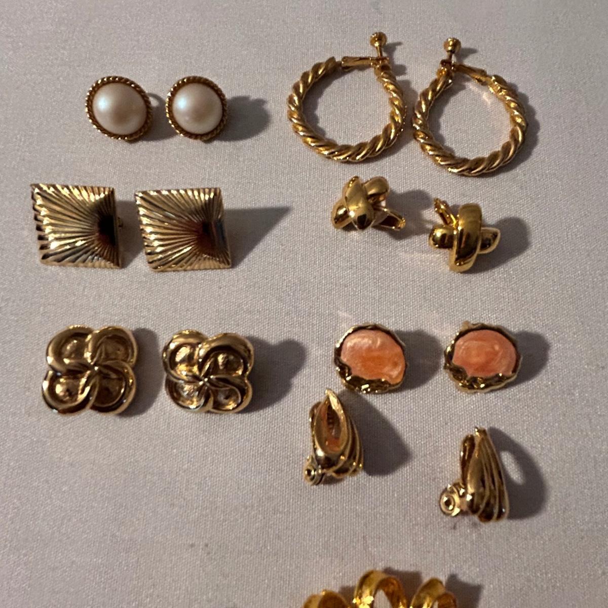 Two pearl necklaces with one being a cluster of strands. Seven, mostly gold toned pins and eight pairs of clip earrings. A few are Monet. Shipping available. All sales are final. No returns or refunds. Please bid accordingly.
