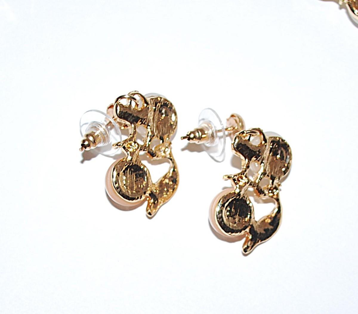 Pearl-Style Gray, Pink & White Half-Globes NECKLACE (15" L) & EARRINGS JEWELRY SET with Bejeweled Gold Tone Setting, Lobster Clasp + Matching Earrings Pair with Stud Post