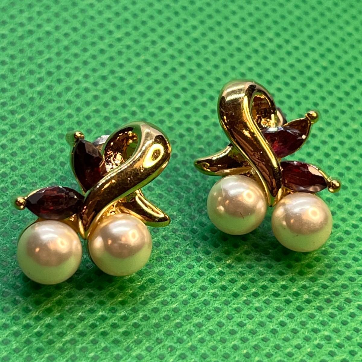 PEARLY GOLD TONE RED RHINESTONE EARRINGS