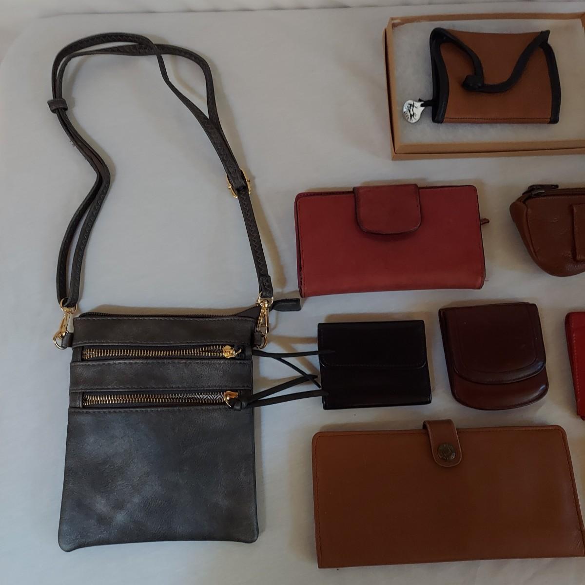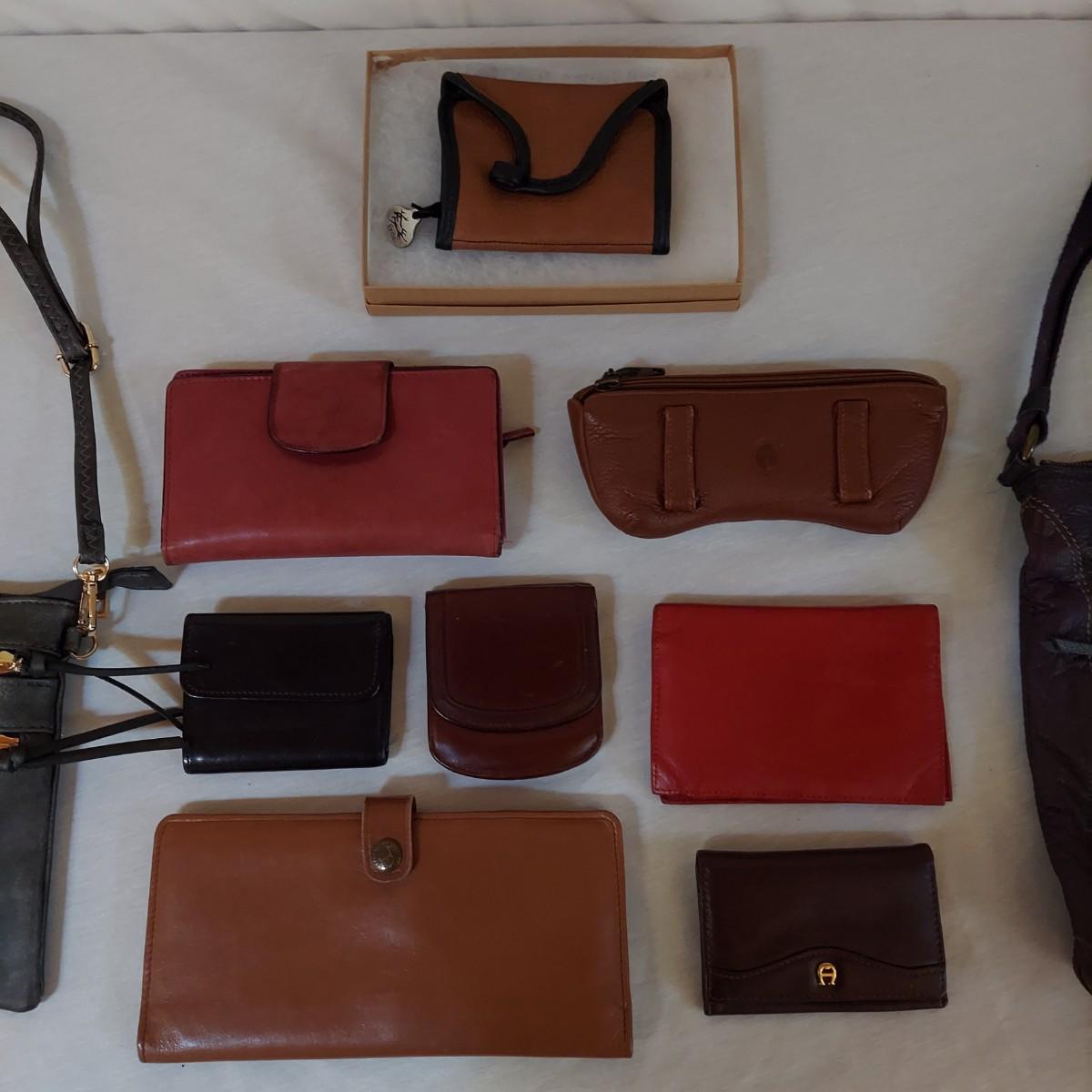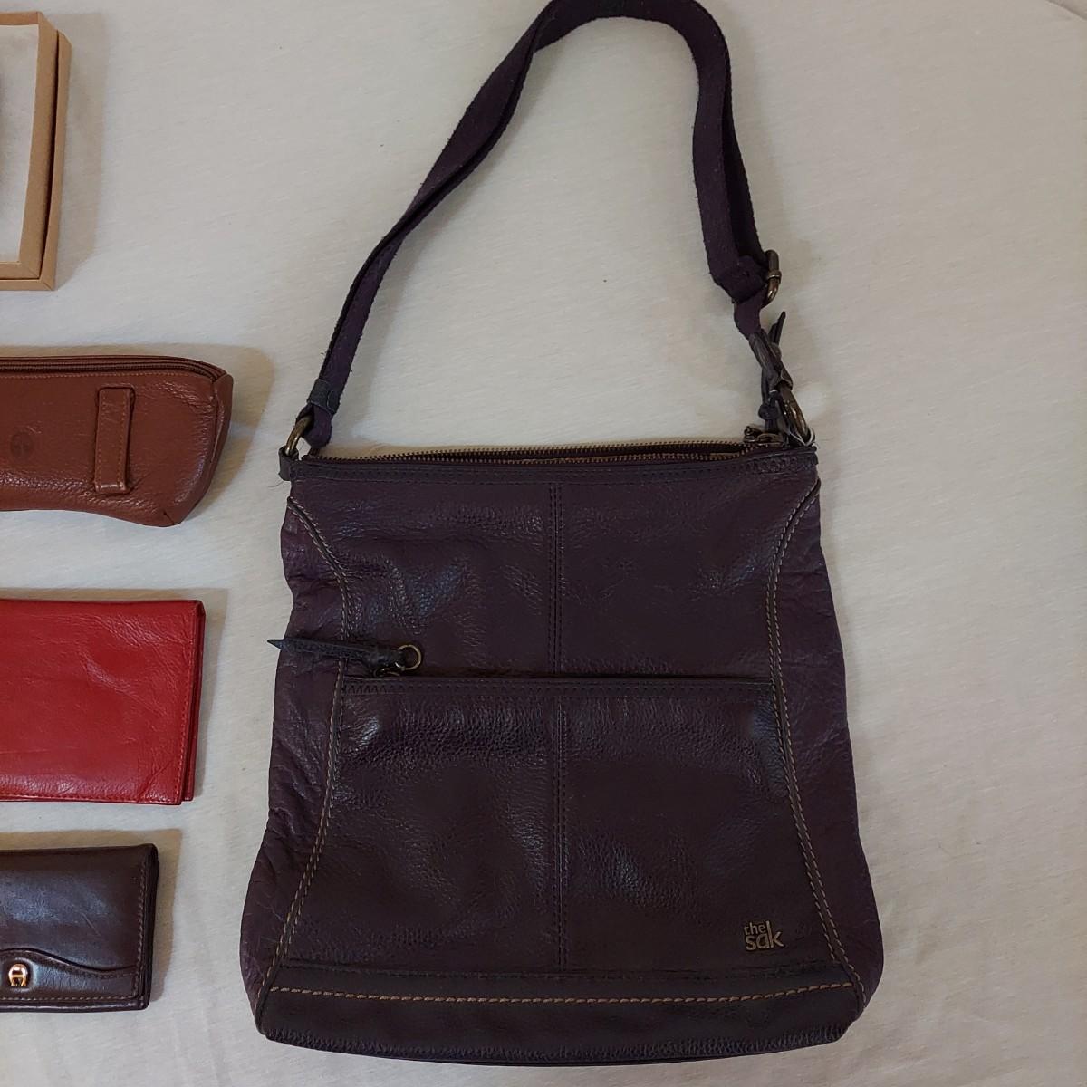 Lot of two purses and several wallets and zip pouches. Includes pebbled leather purse by The Sak. Plus, leather wallets by Coach, Erda, Etienne Aigner, Levenger and more. Please see photos for details. Shipping available