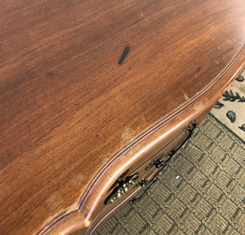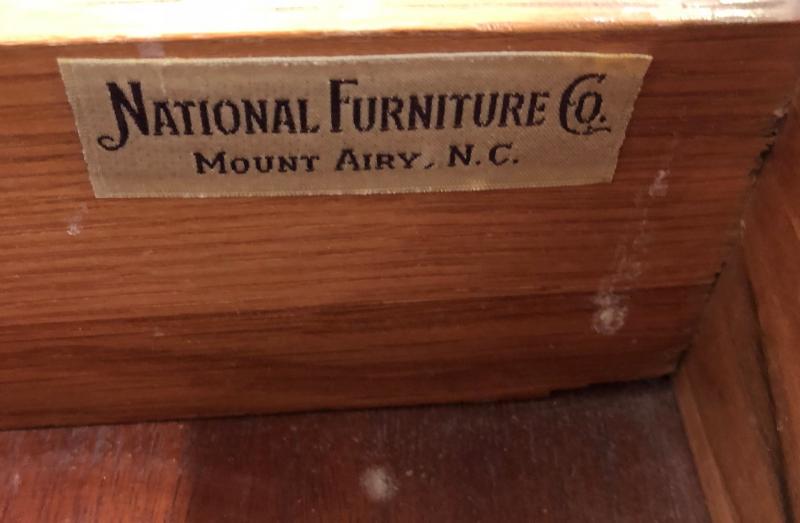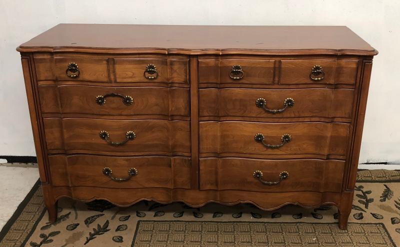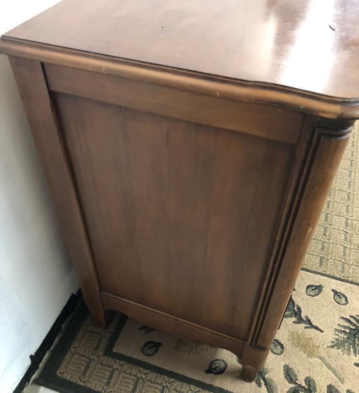 Offered as is..the top needs refinish from a cigarette burn otherwise good condition on this set of dresser drawers..French Provincial style...in Pecan wood...built by the National Furniture Company of North Carolina...59 x 21 x 35"...