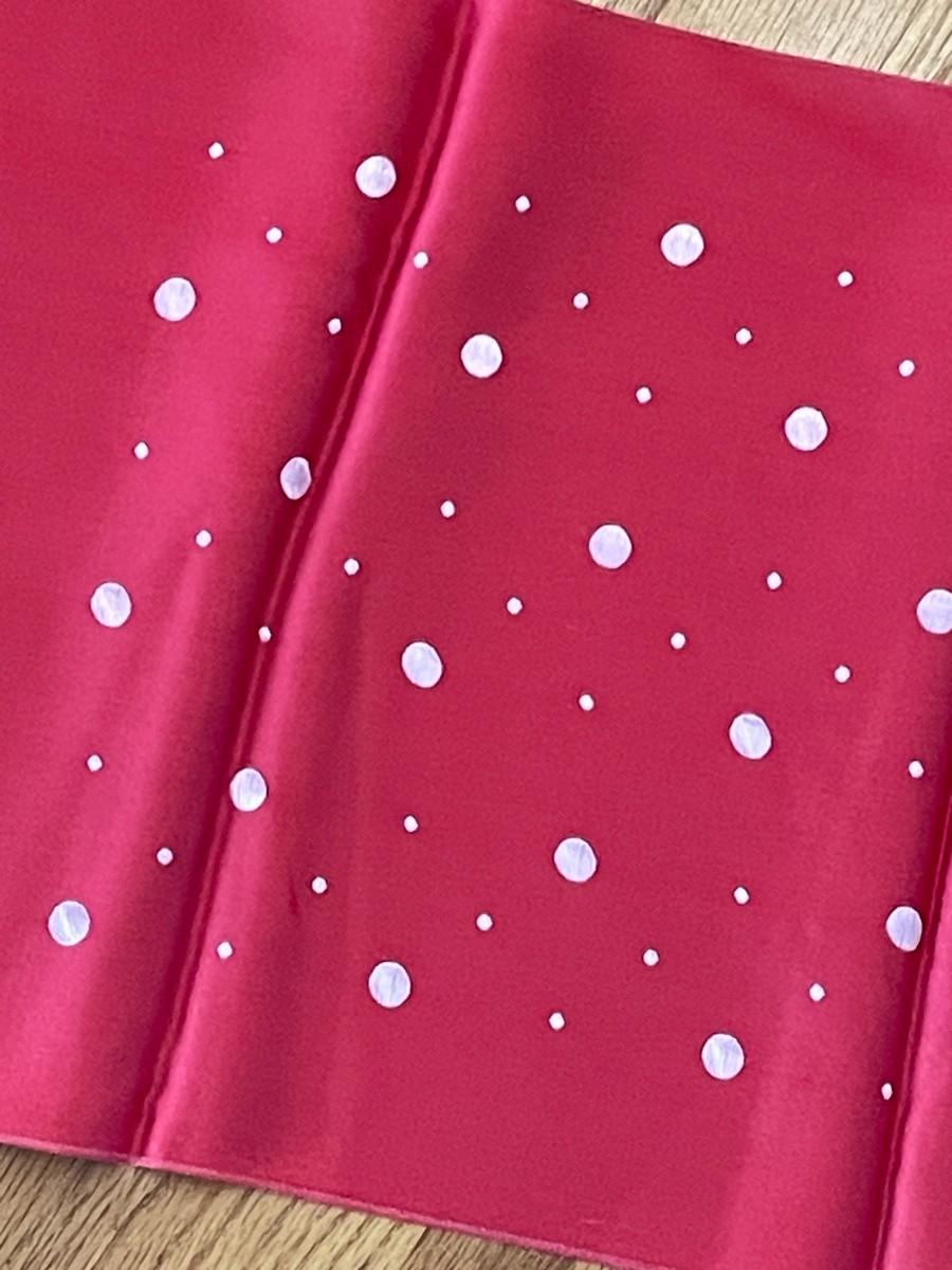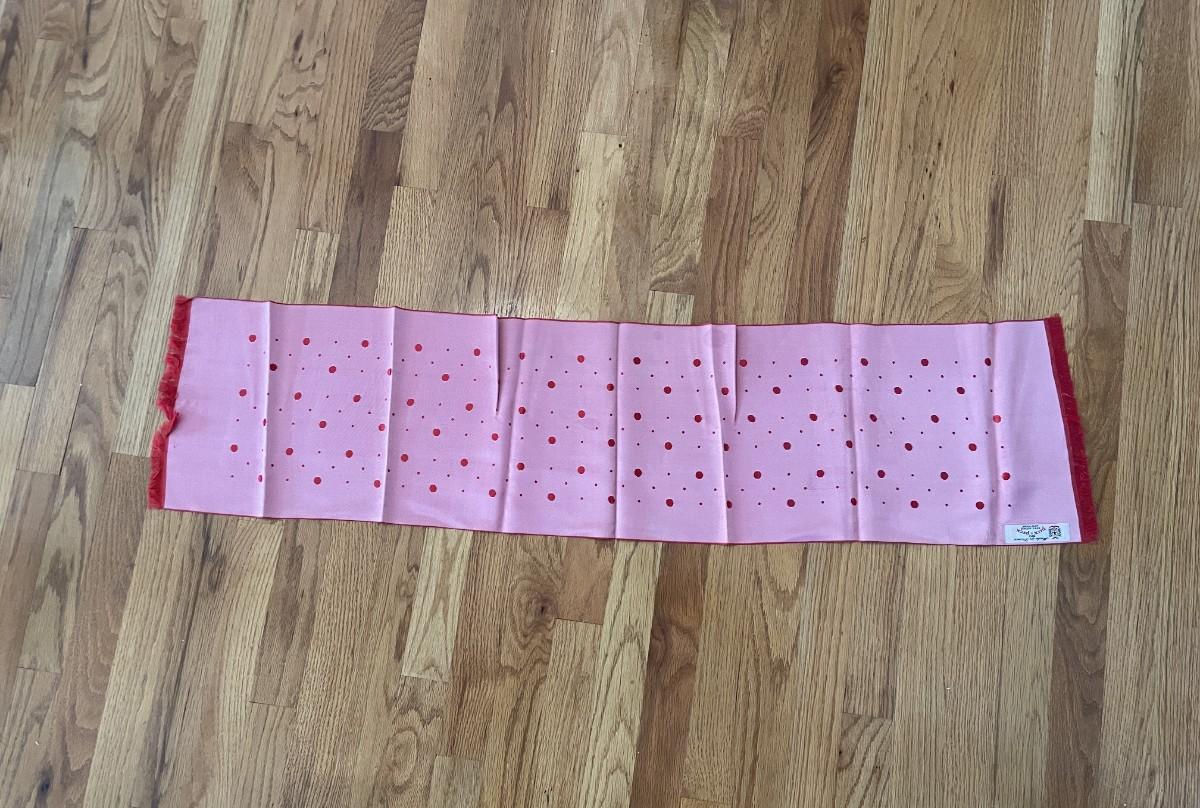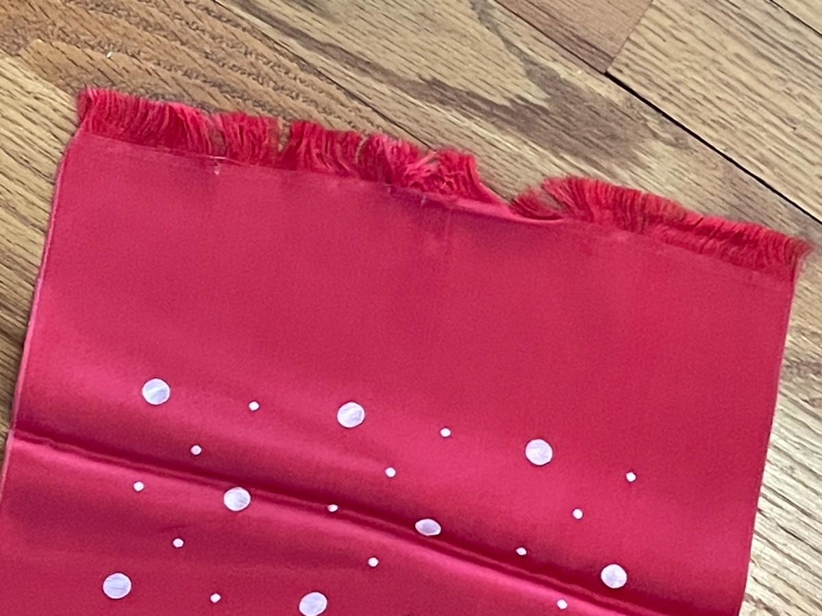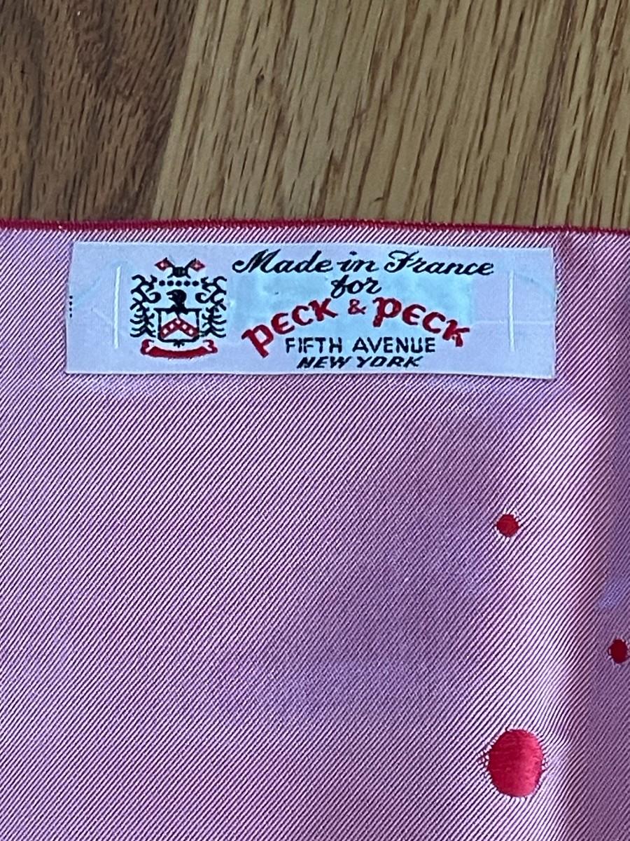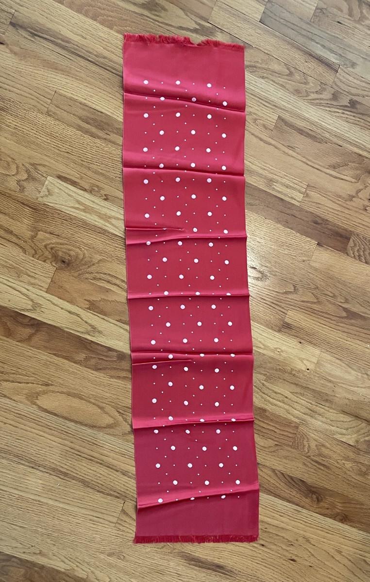 This silk scarf was never worn and is a red silk with white polka dots of various sizes. It is about 10.5 inches by 46 inches and in excellent condition. It was made in France for Peck & Peck.
