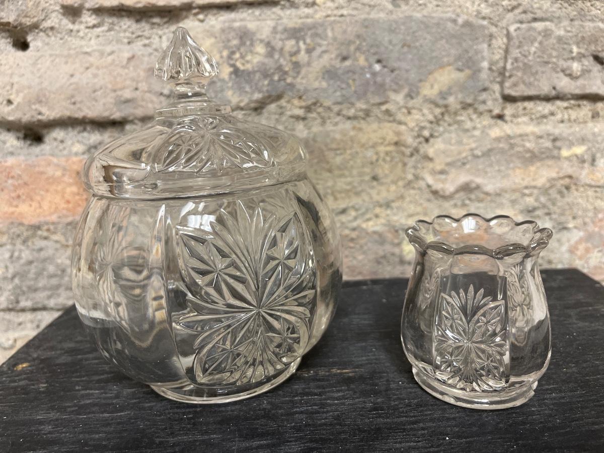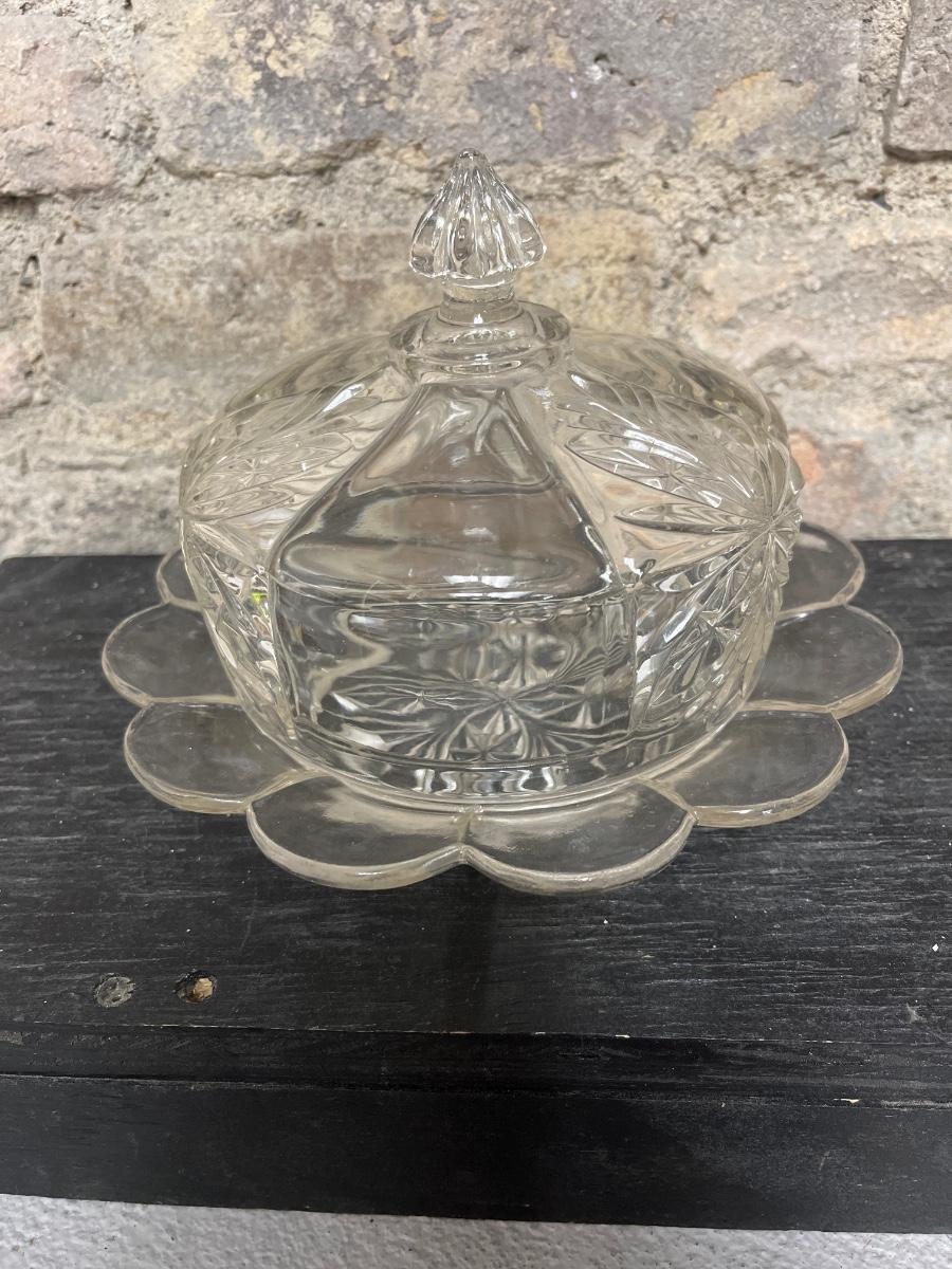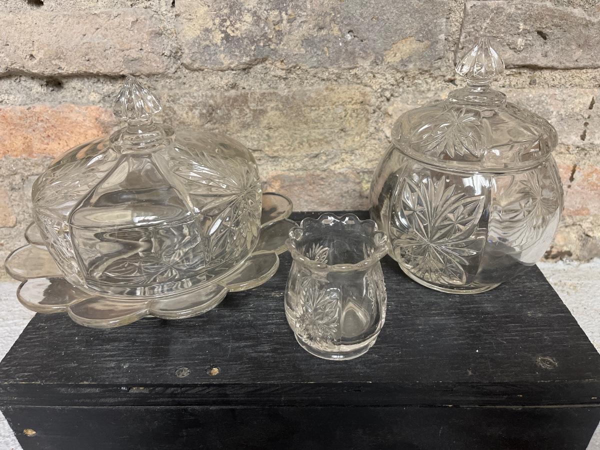 Pedaled Medallion Riverside Glass Works Toothpick, Covered Candy Dish and Covered Butter Dish