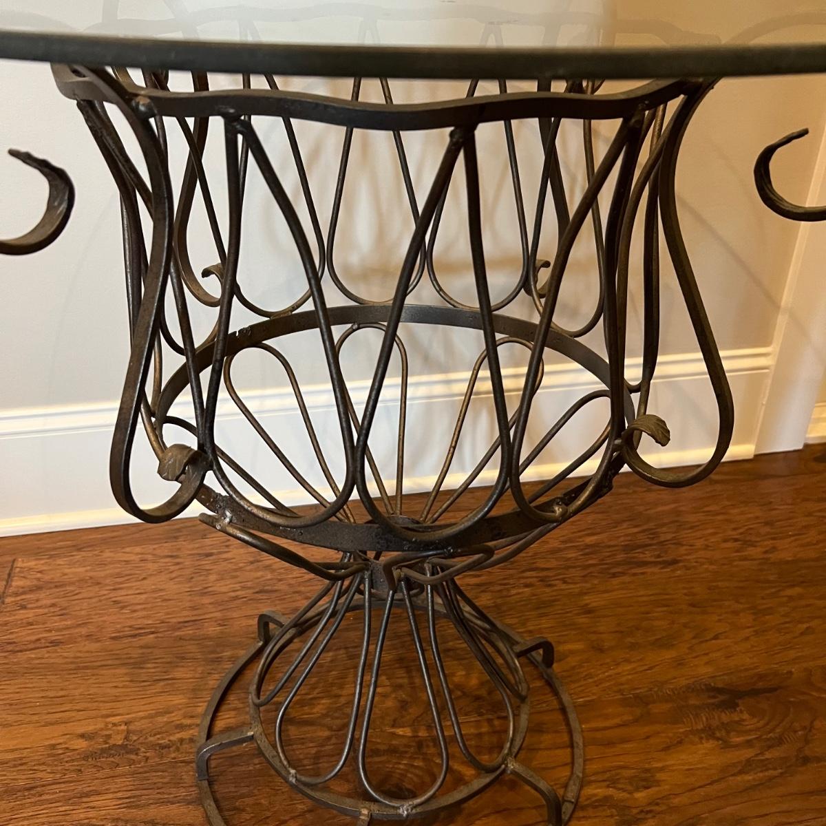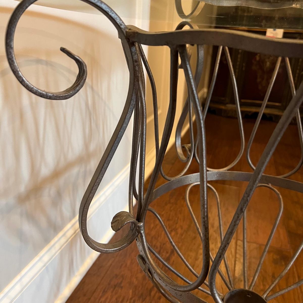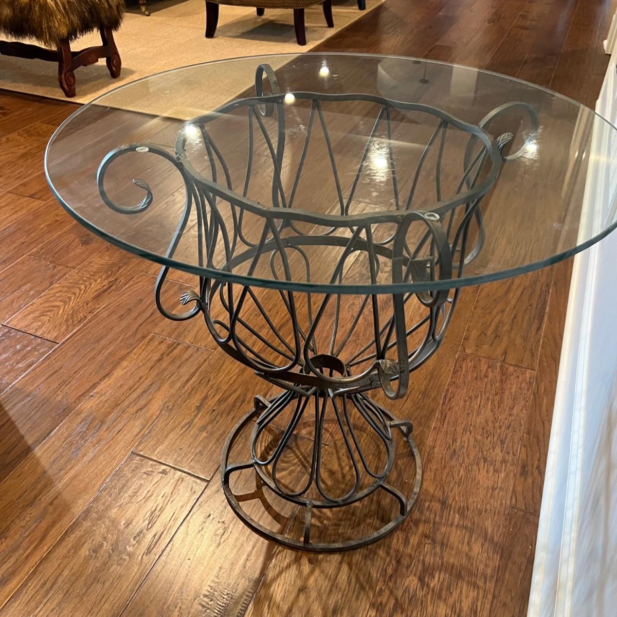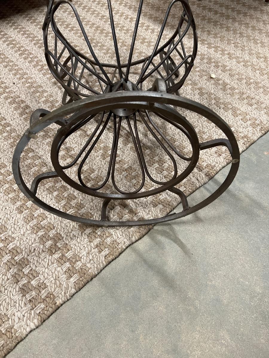 This attractive table has a decorative iron base in a basket shape. The thick 1/2” thick glass top is removable for transporting.
