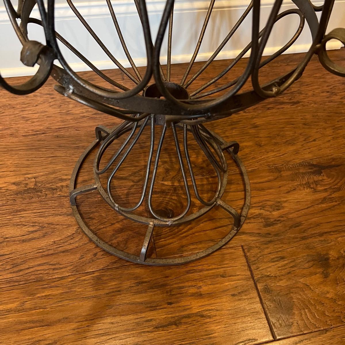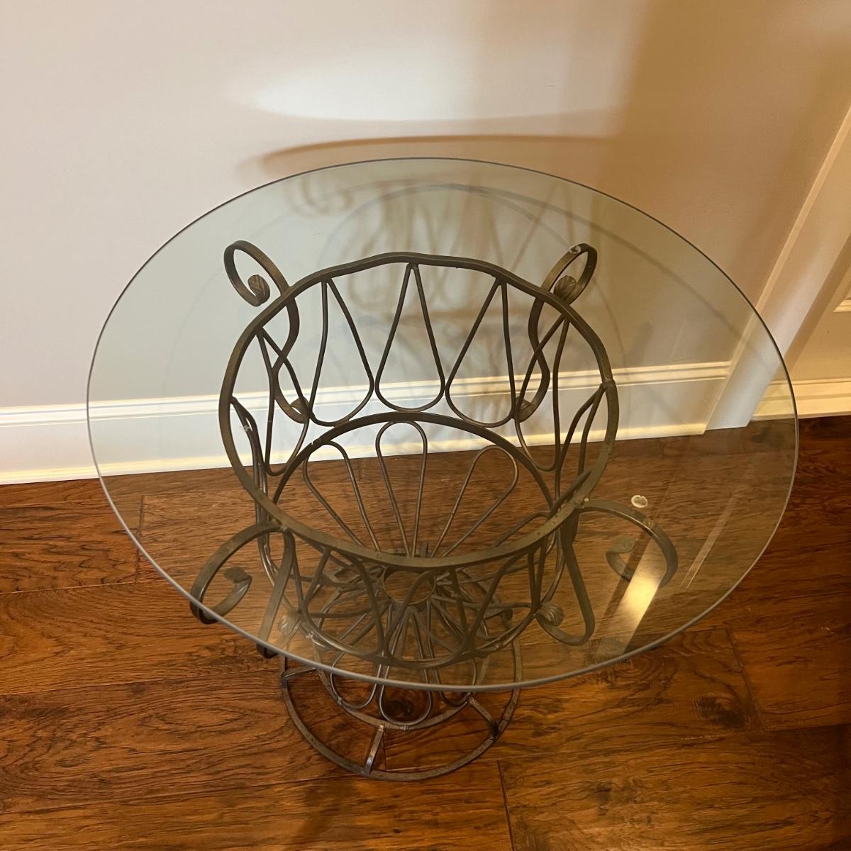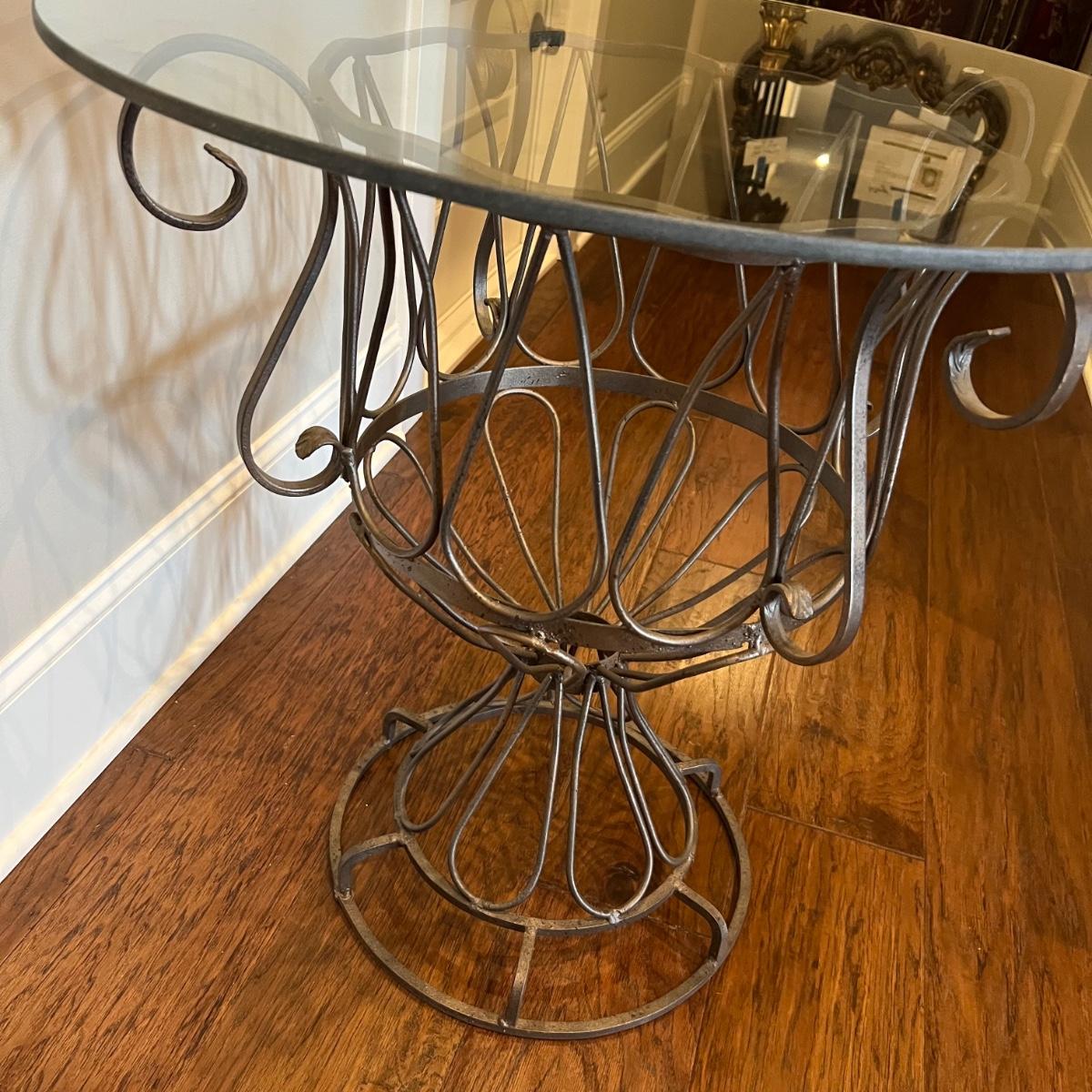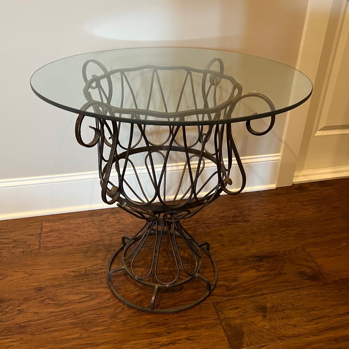 This attractive table has a decorative iron base in a basket shape. The thick 1/2” thick glass top is removable for transporting.