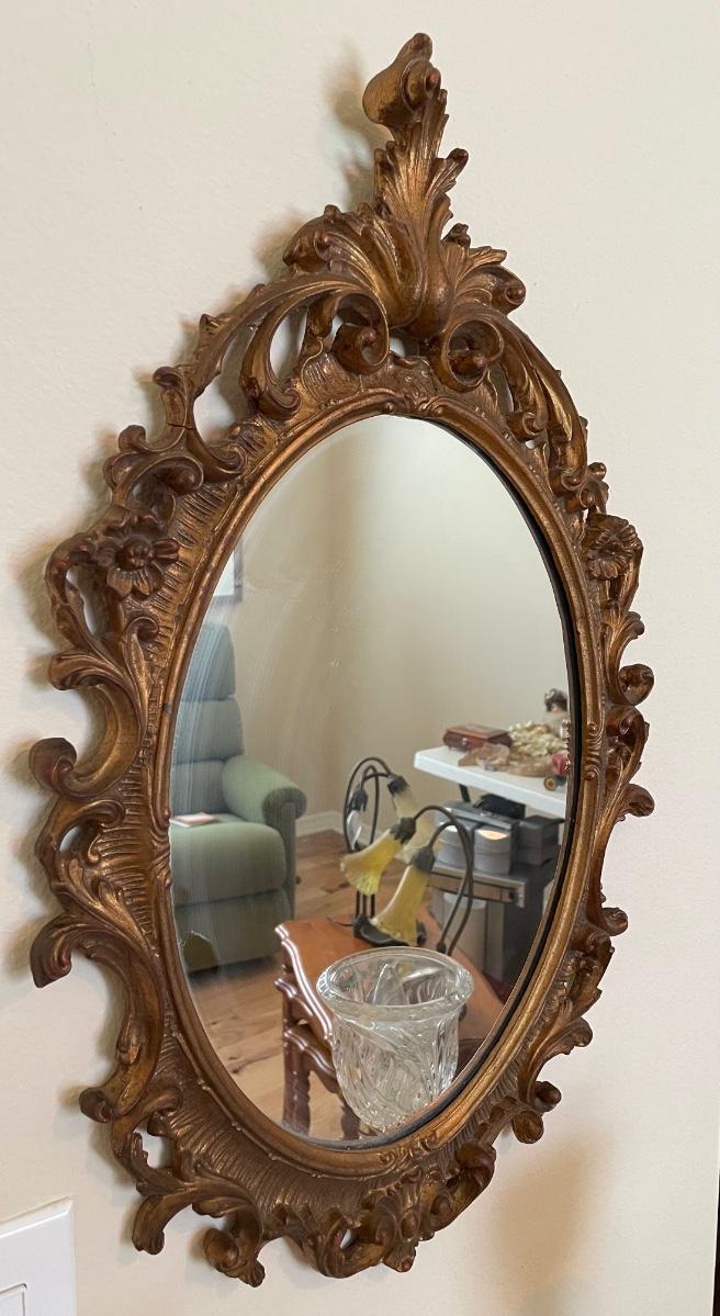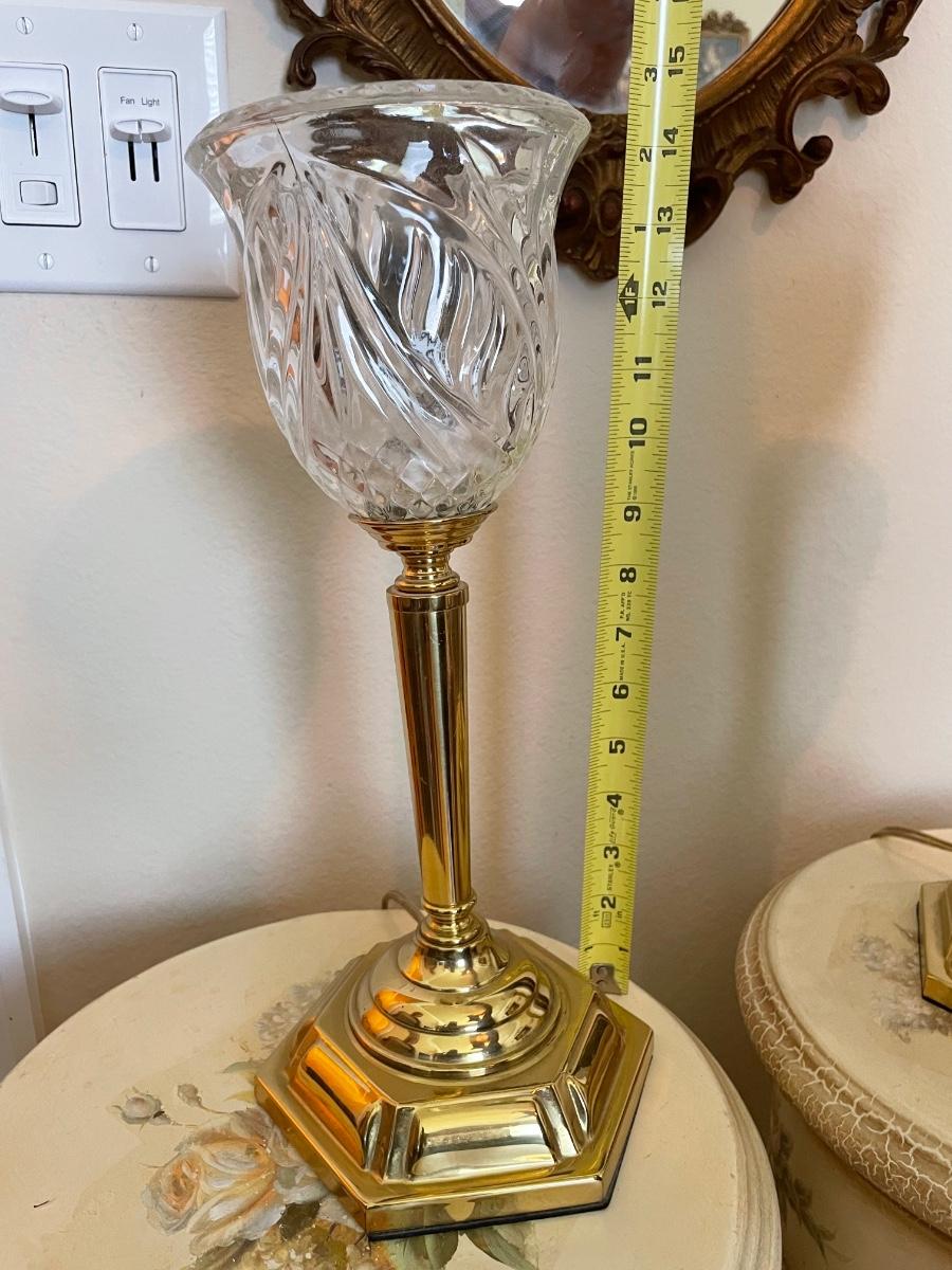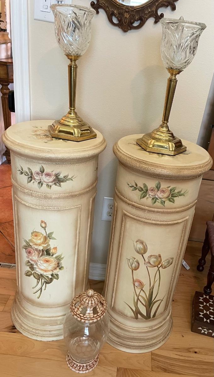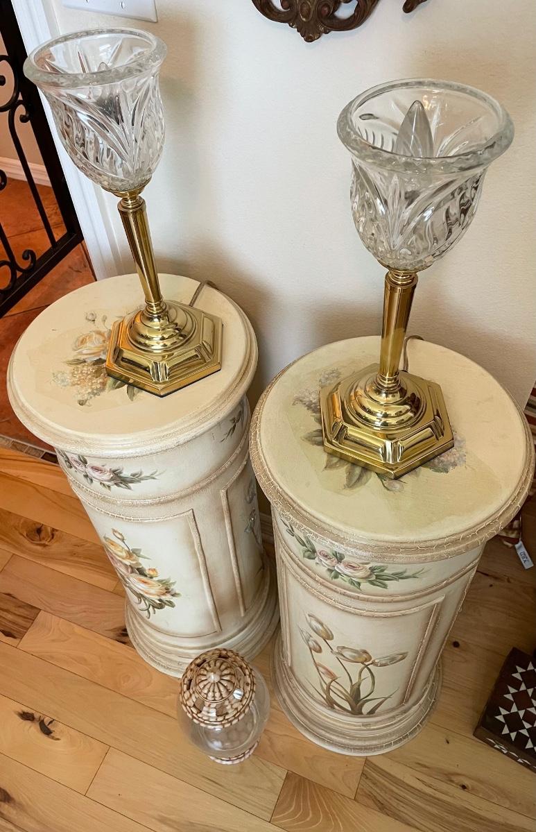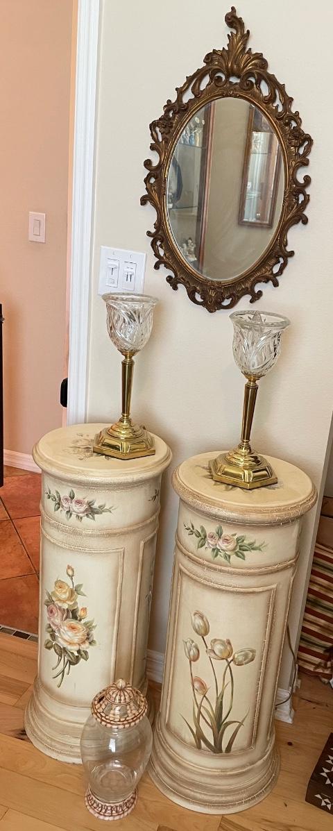 Two matching wood pedestals with 2 matching crystal lamp. Vintage wall mirror and glass jar.