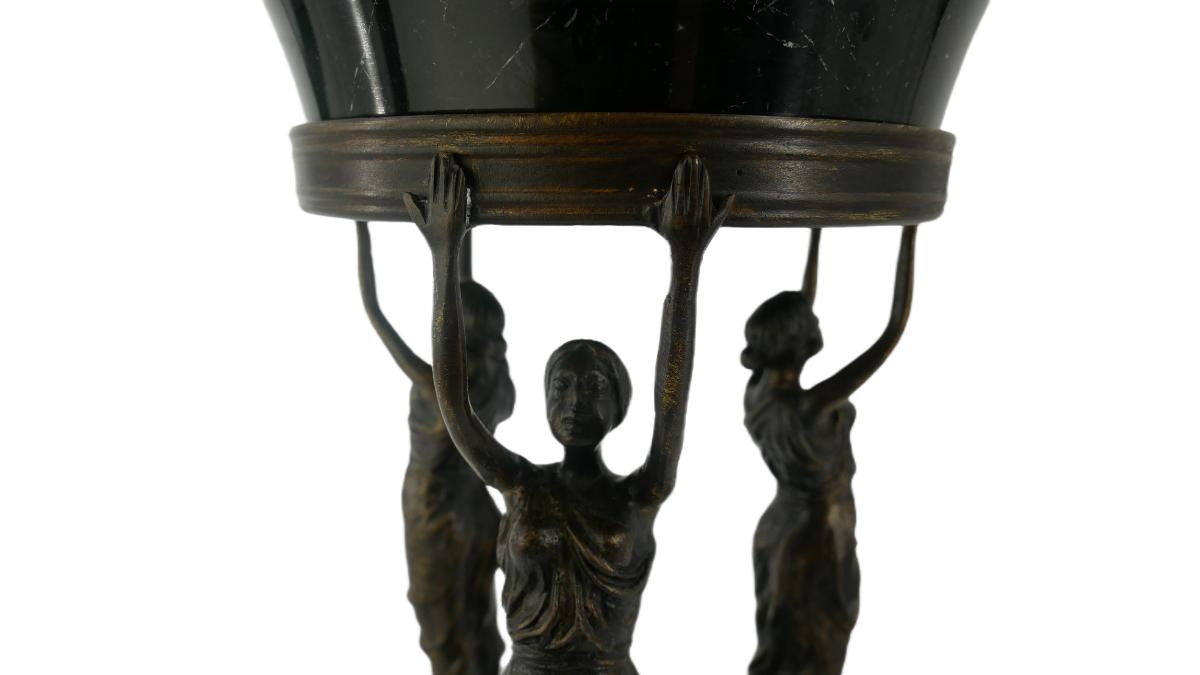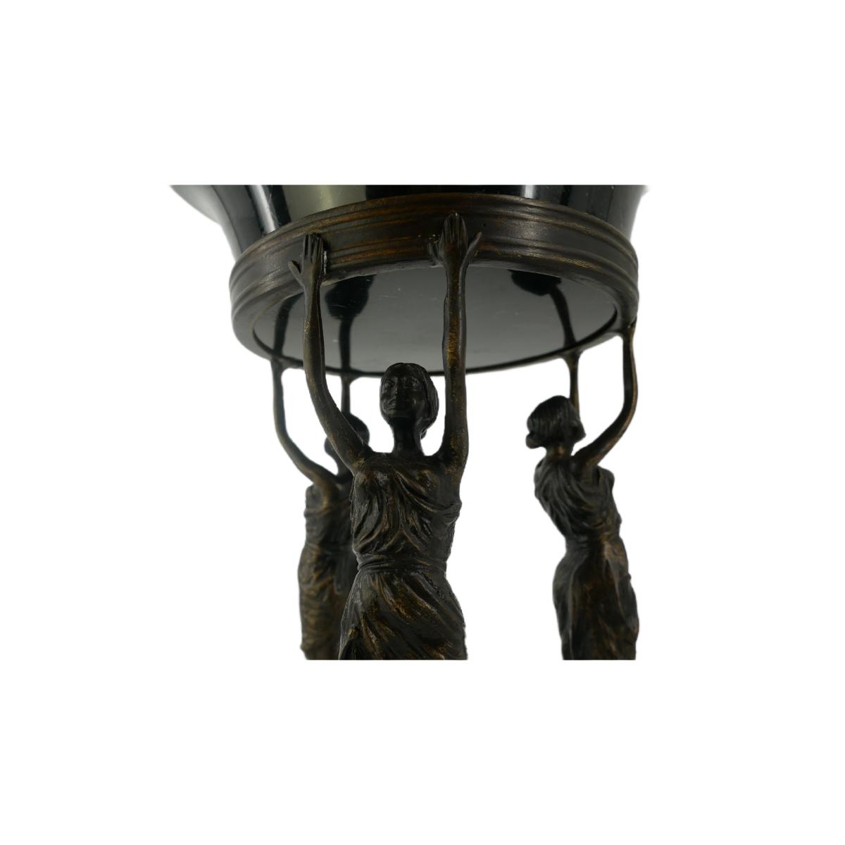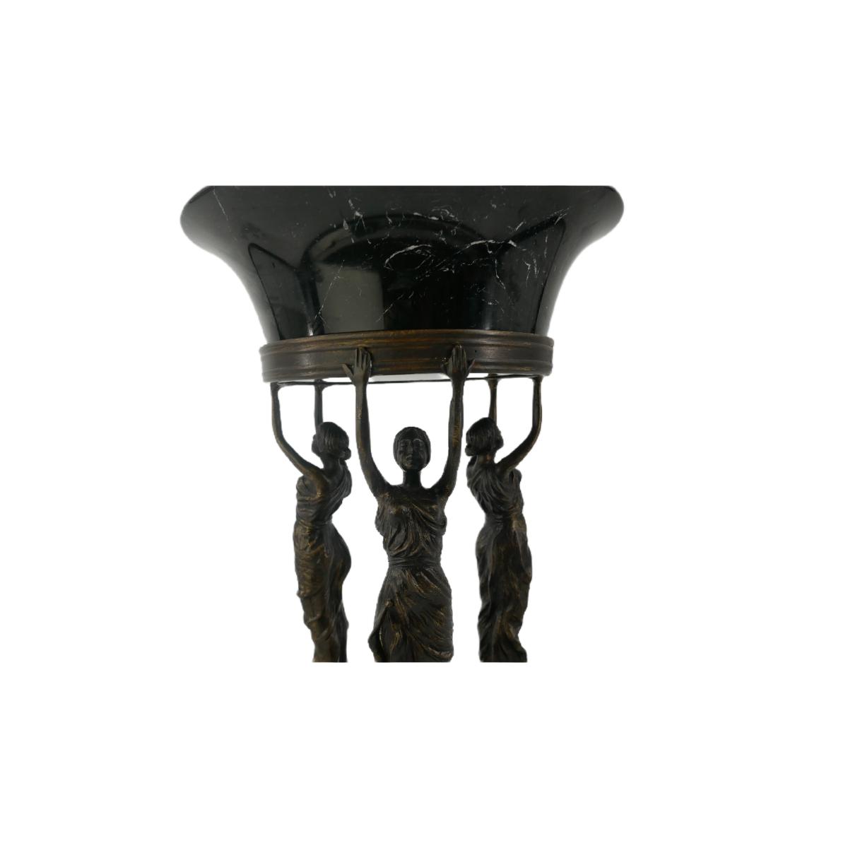 Metal pedestal of Greek/Roman style women holding a black and white striationed granite stone bowl. Marked made in Thailand. No visible issues found, excellent condition! Measures L 10" x W 13". Packaged weight is 15 lbs. (D22)
