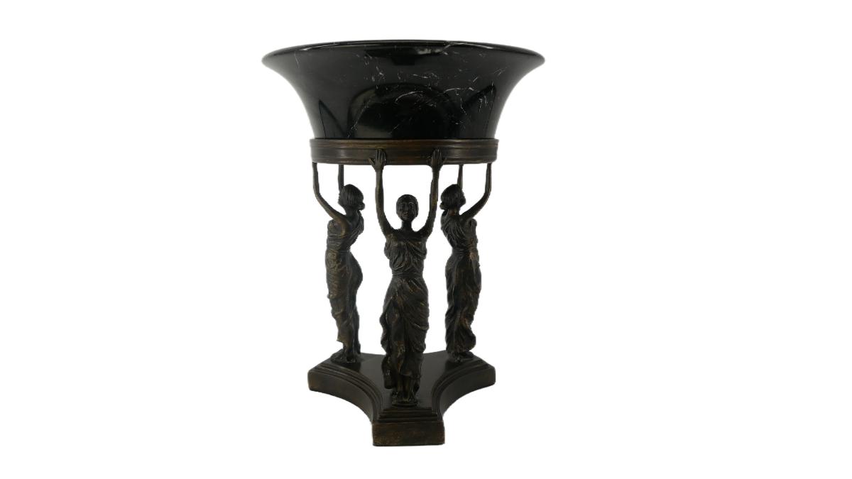 Metal pedestal of Greek/Roman style women holding a black and white striationed granite stone bowl. Marked made in Thailand. No visible issues found, excellent condition! Measures L 10" x W 13". Packaged weight is 15 lbs. (D22)