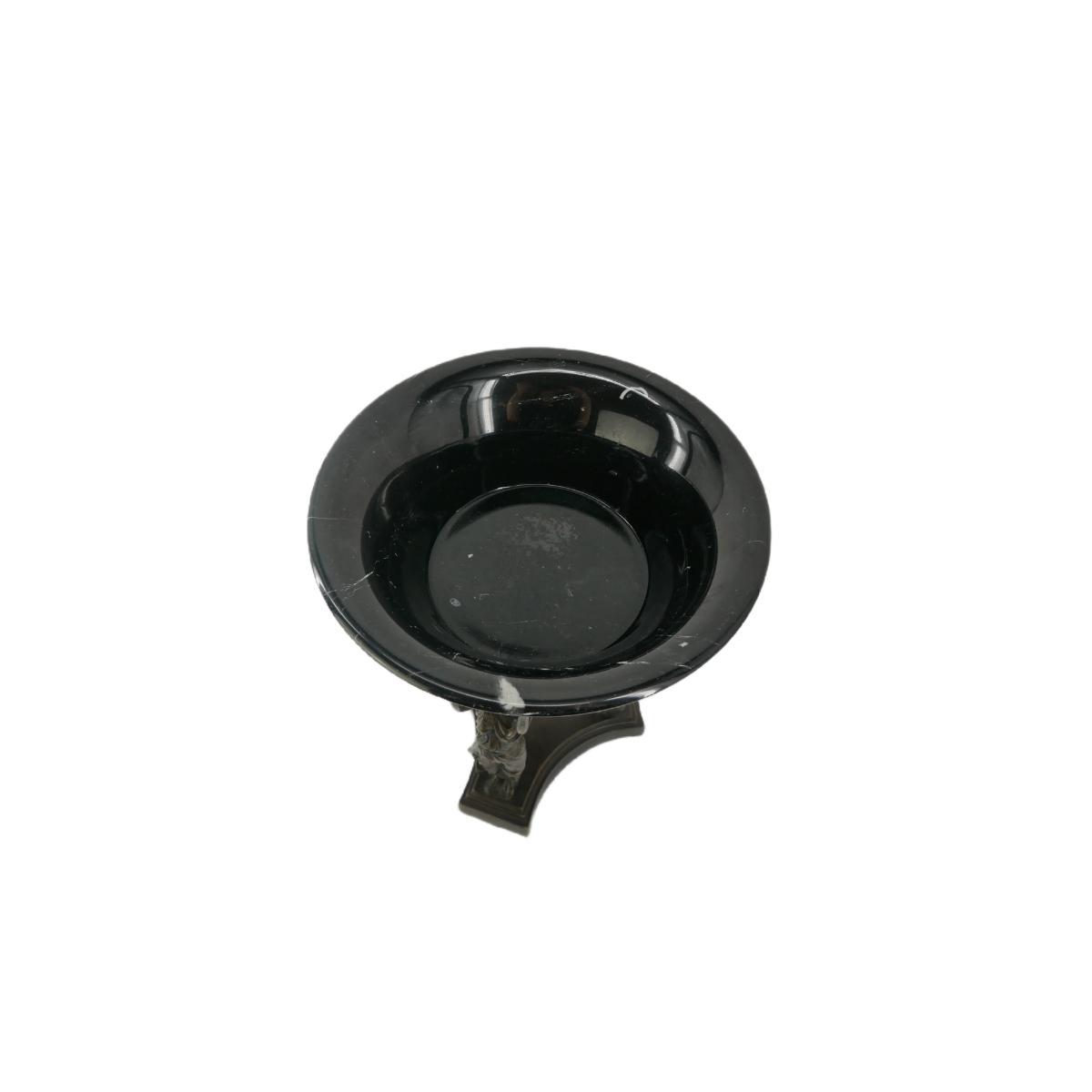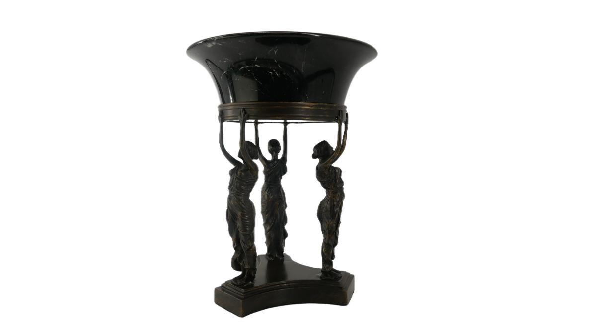 Metal pedestal of Greek/Roman style women holding a black and white striationed granite stone bowl. Marked made in Thailand. No visible issues found, excellent condition! Measures L 10" x W 13". Packaged weight is 15 lbs. (D22)