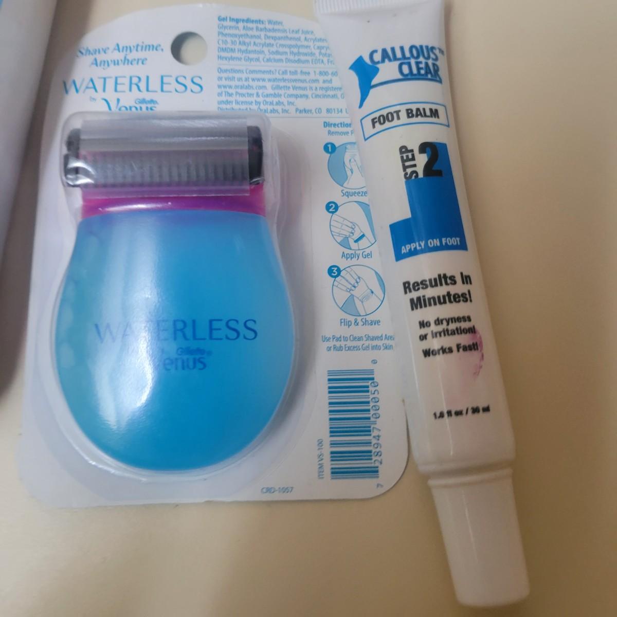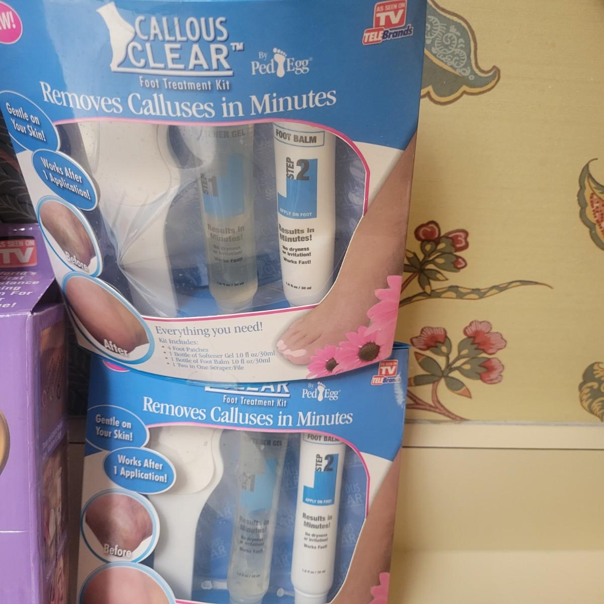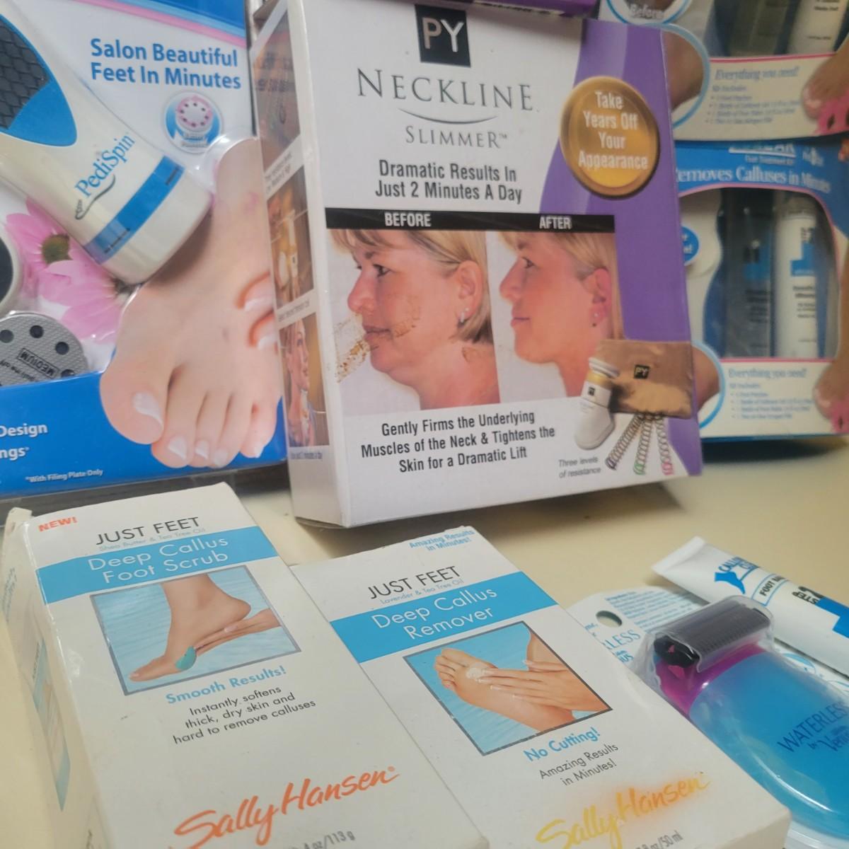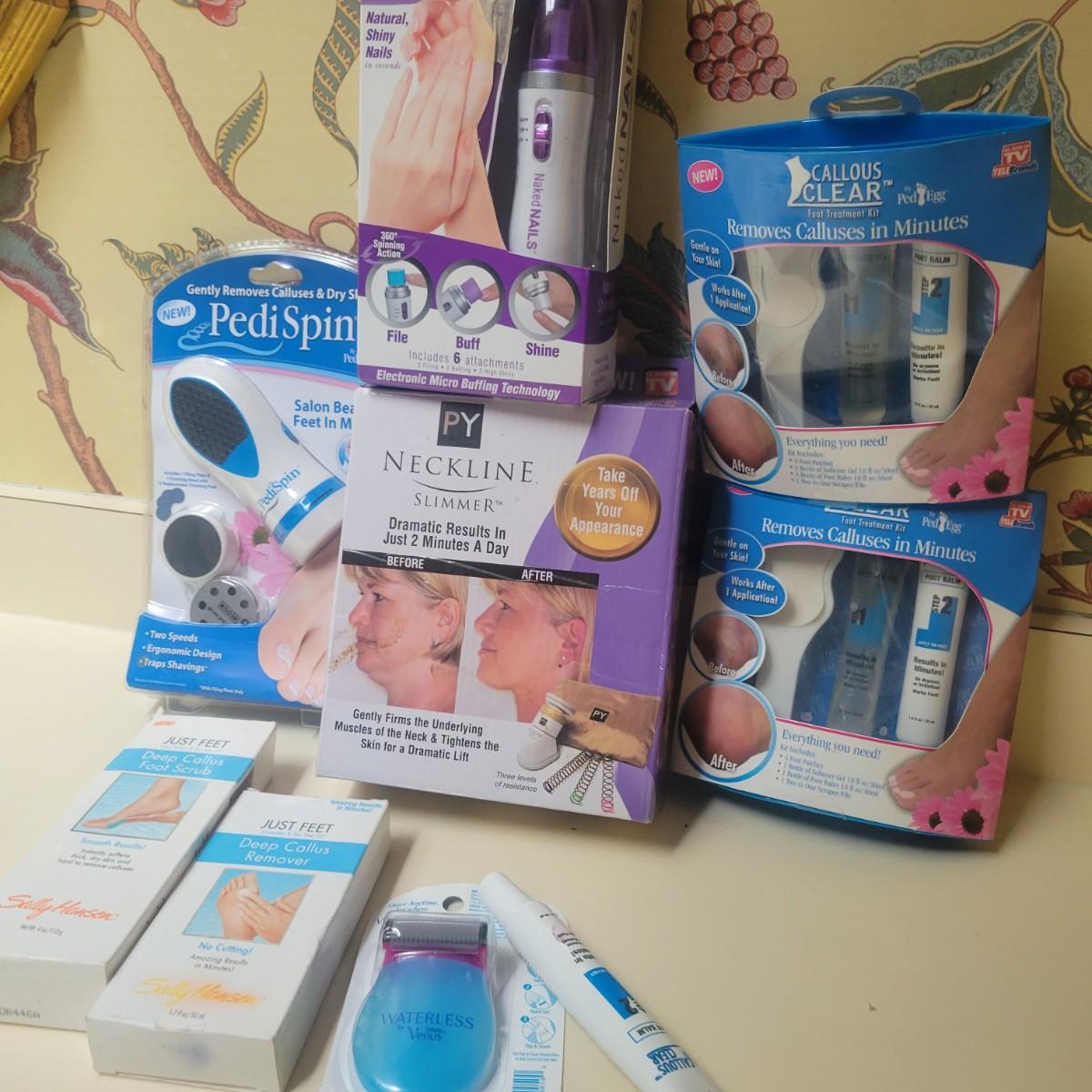 All new products in original packaging. Lot includes a PediSpin, 2 boxes of callous clear callus removers with an additional tube, deep callus foot scrub, deep callus remover, neckline slimmer, an electric manicure tool and women's razor. Shipping available