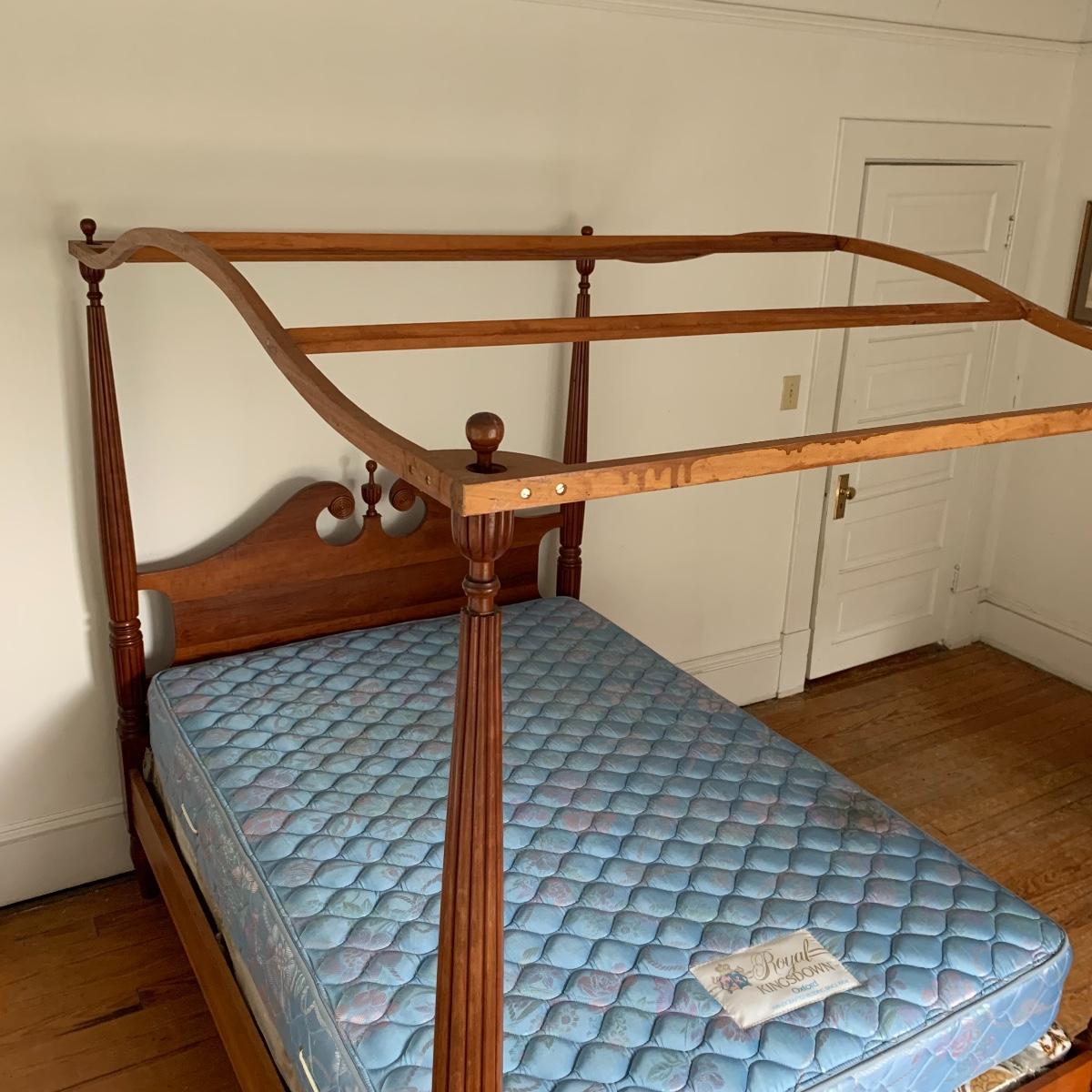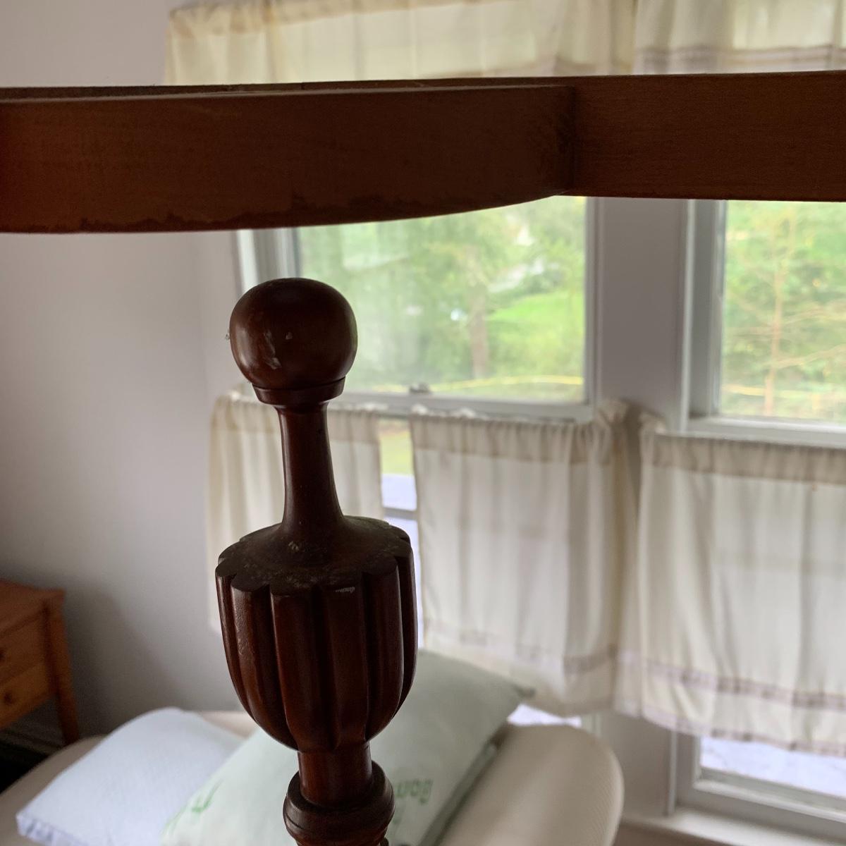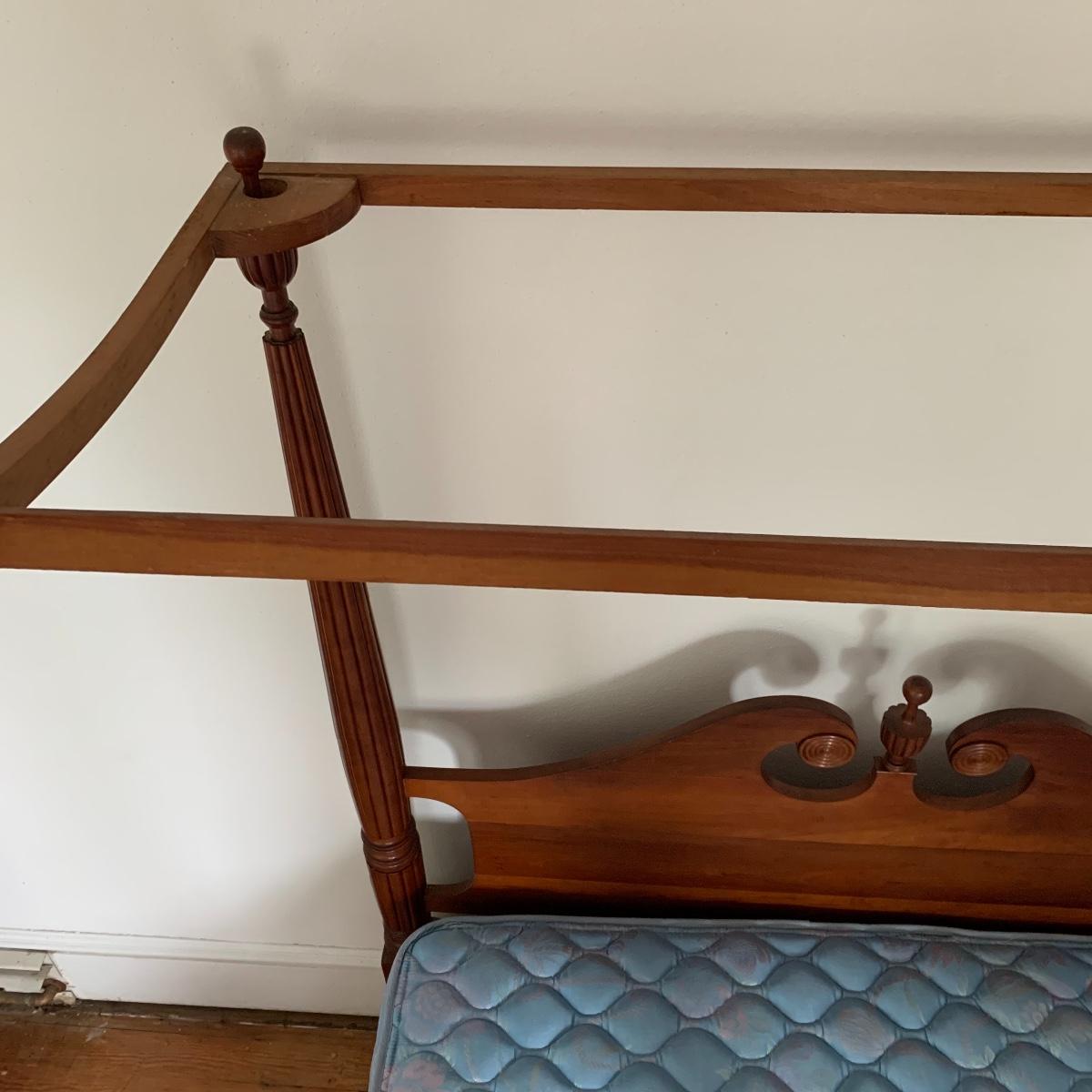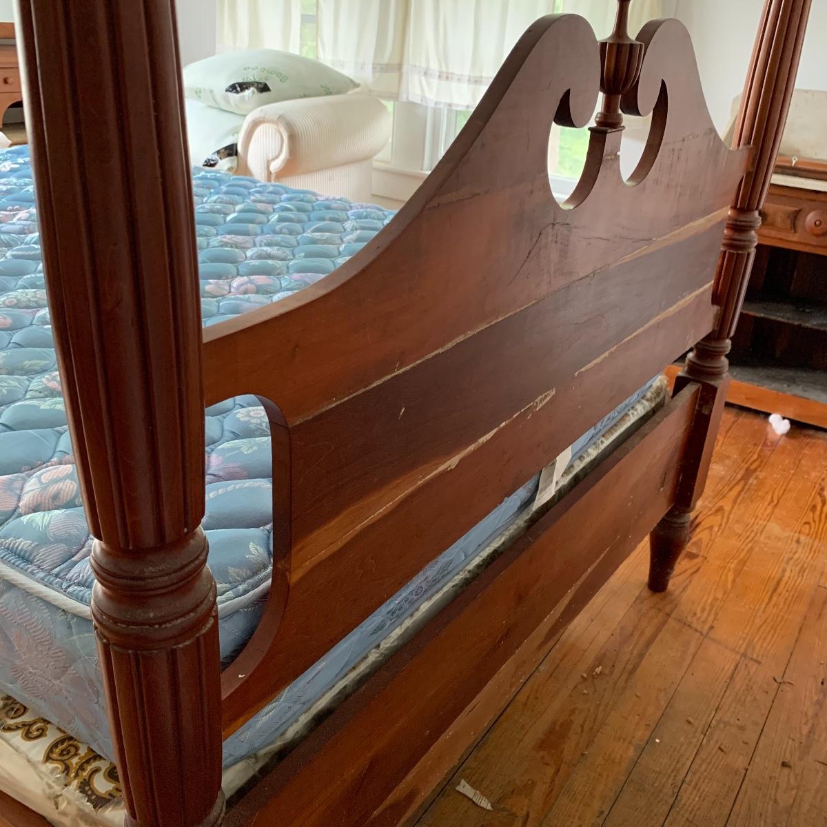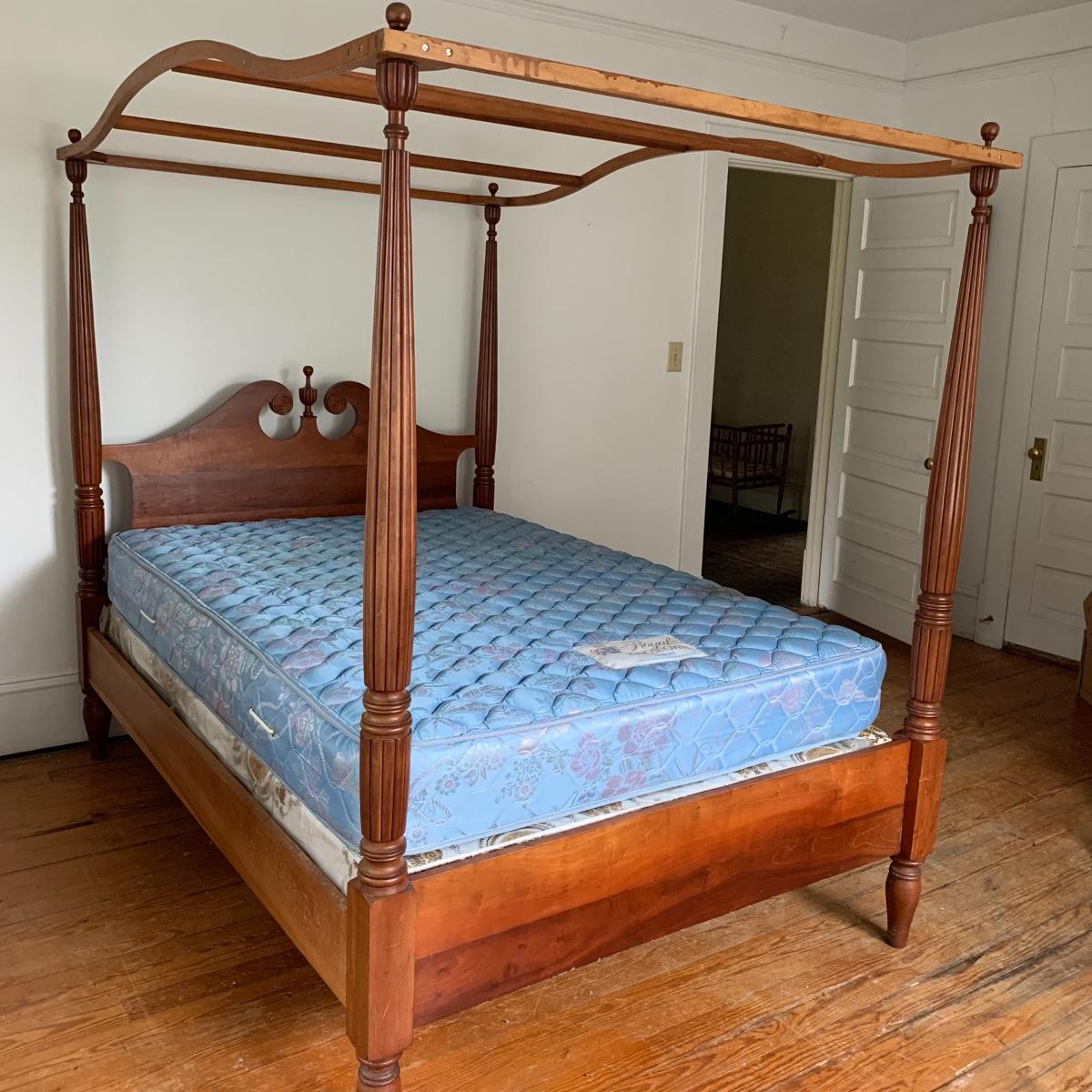 This is an ornate four poster wooden bed frame with an easily removable canopy top. It is a full/double sized frame. It has a pediment style headboard with a finial decoration. The canopy top can be removed simply by lifting it off of the top of the posts. The frame is a bit heavy. The winning bidder will need to move it from the second floor of the house and will require help. The frame measures 57” x 81” x 74”. A flathead screwdriver will be required to disassemble the frame (please see pictures of hardware). The two boards supporting the box spring are not attached. Bedding pictured is not included. The winning bidder may have the mattress and box spring if desired (please let Sterling Transitions know if you’d like these before you come for auction pickup). The height of the top of the current mattress is the frame is about 30” tall. The bed frame is in used, but sturdy condition. It shows it’s age with some wear, but is otherwise in very good condition. Local Pickup Only