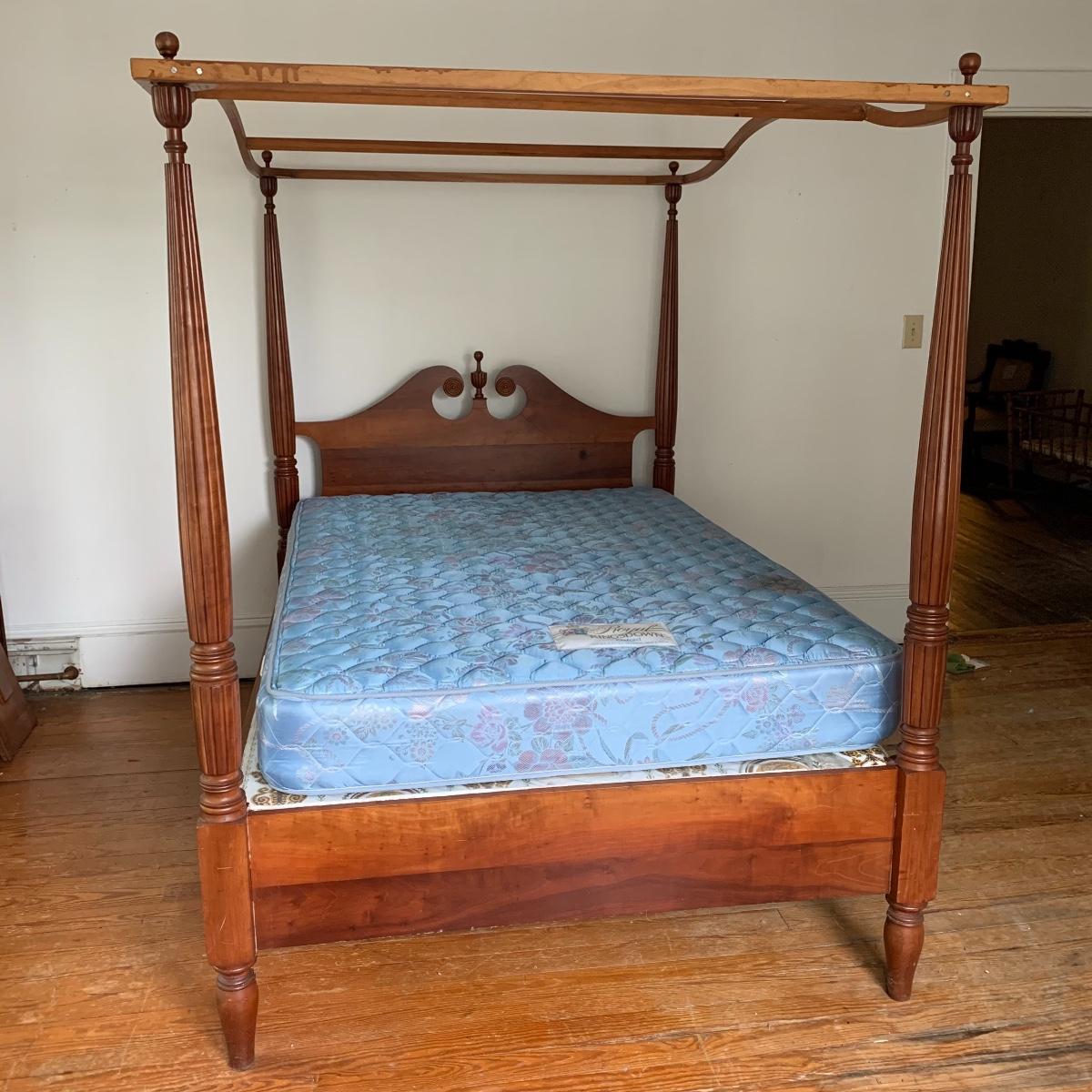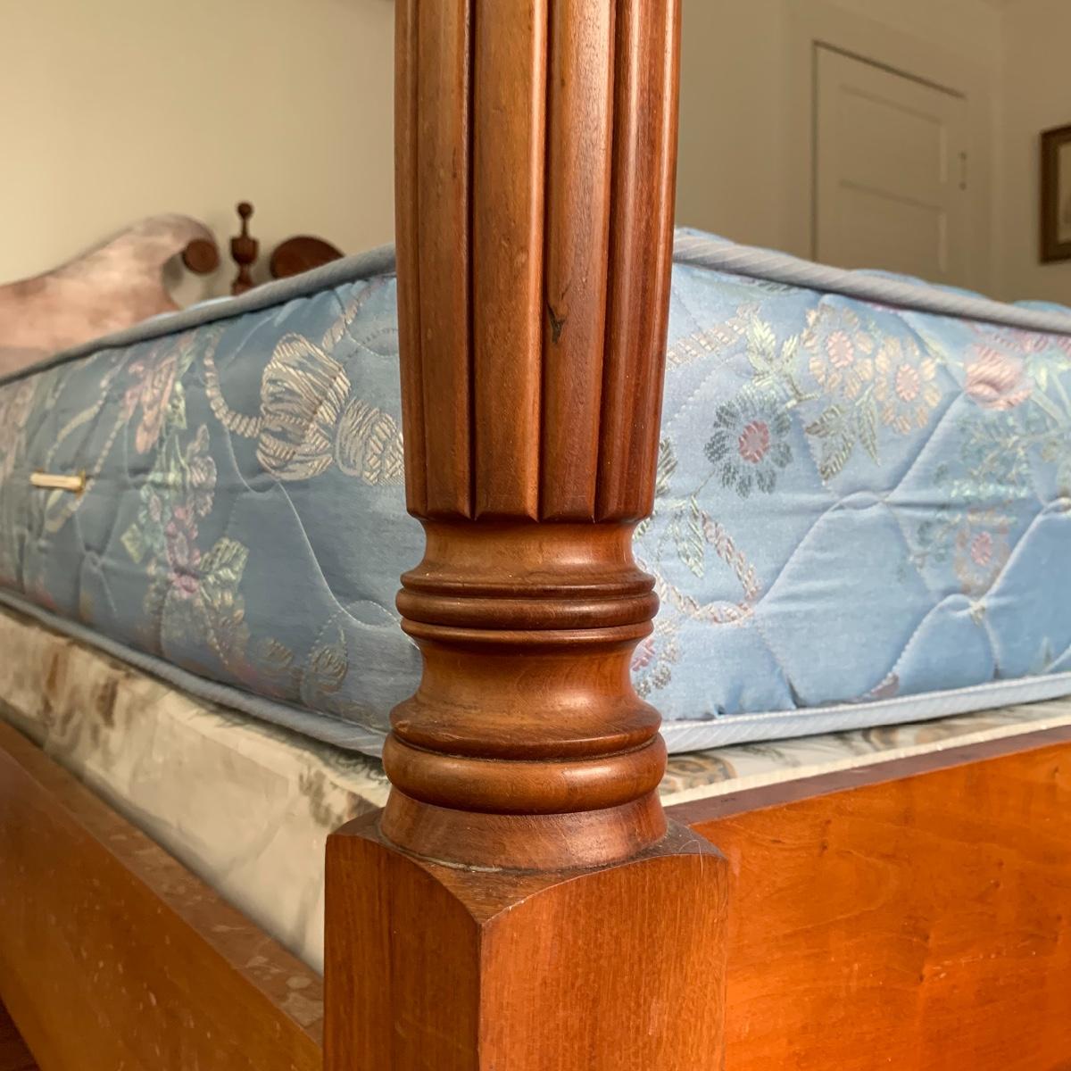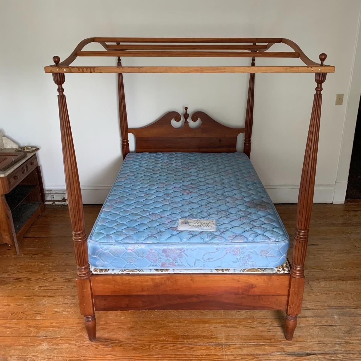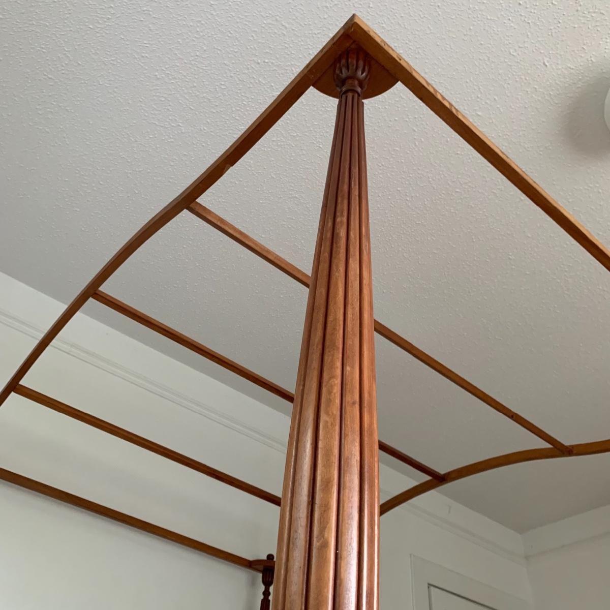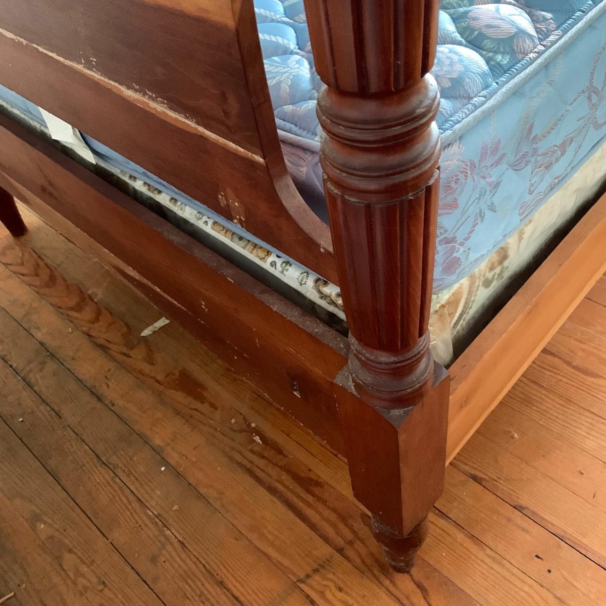 This is an ornate four poster wooden bed frame with an easily removable canopy top. It is a full/double sized frame. It has a pediment style headboard with a finial decoration. The canopy top can be removed simply by lifting it off of the top of the posts. The frame is a bit heavy. The winning bidder will need to move it from the second floor of the house and will require help. The frame measures 57” x 81” x 74”. A flathead screwdriver will be required to disassemble the frame (please see pictures of hardware). The two boards supporting the box spring are not attached. Bedding pictured is not included. The winning bidder may have the mattress and box spring if desired (please let Sterling Transitions know if you’d like these before you come for auction pickup). The height of the top of the current mattress is the frame is about 30” tall. The bed frame is in used, but sturdy condition. It shows it’s age with some wear, but is otherwise in very good condition. Local Pickup Only