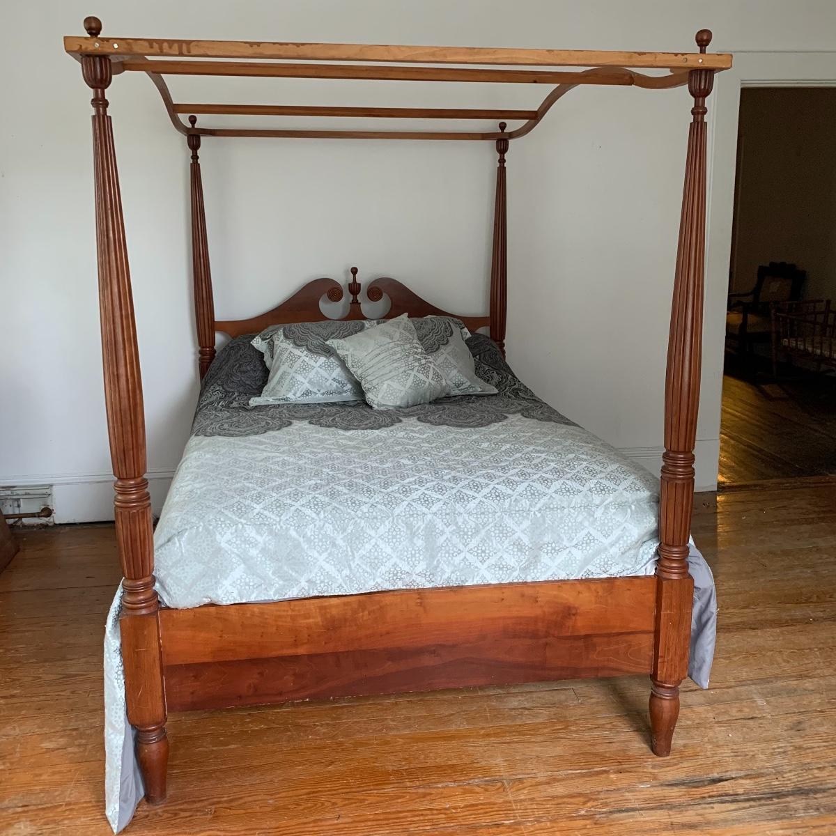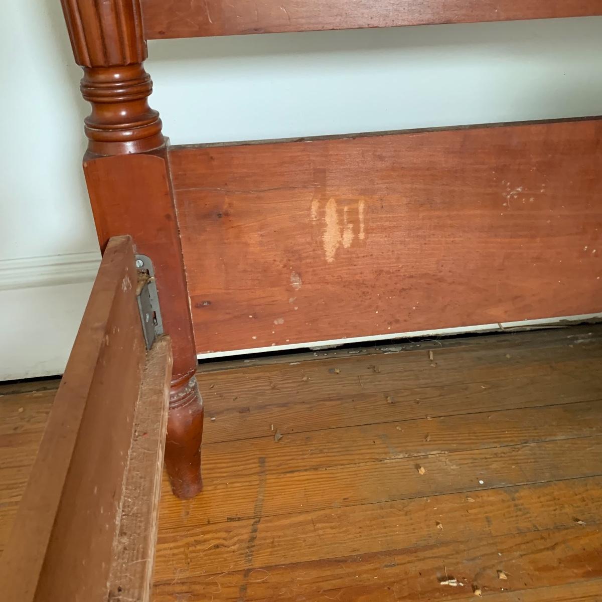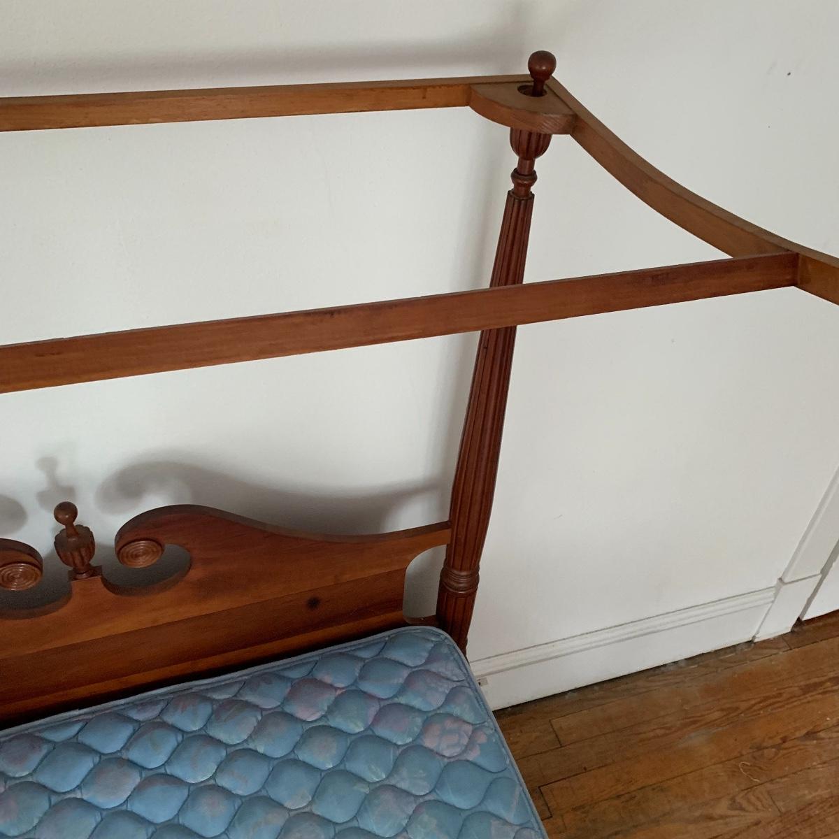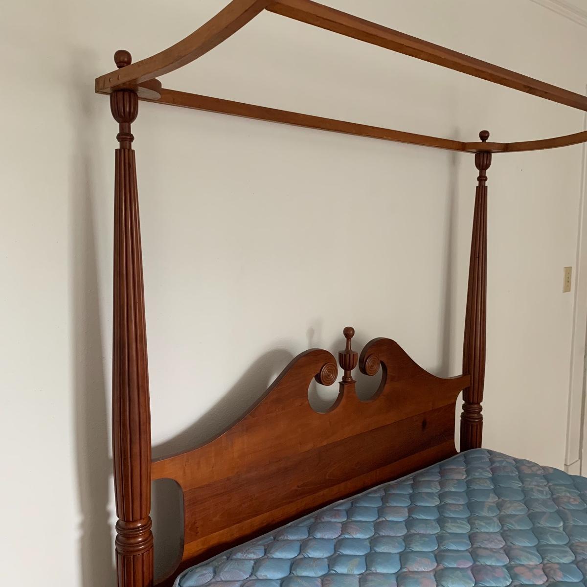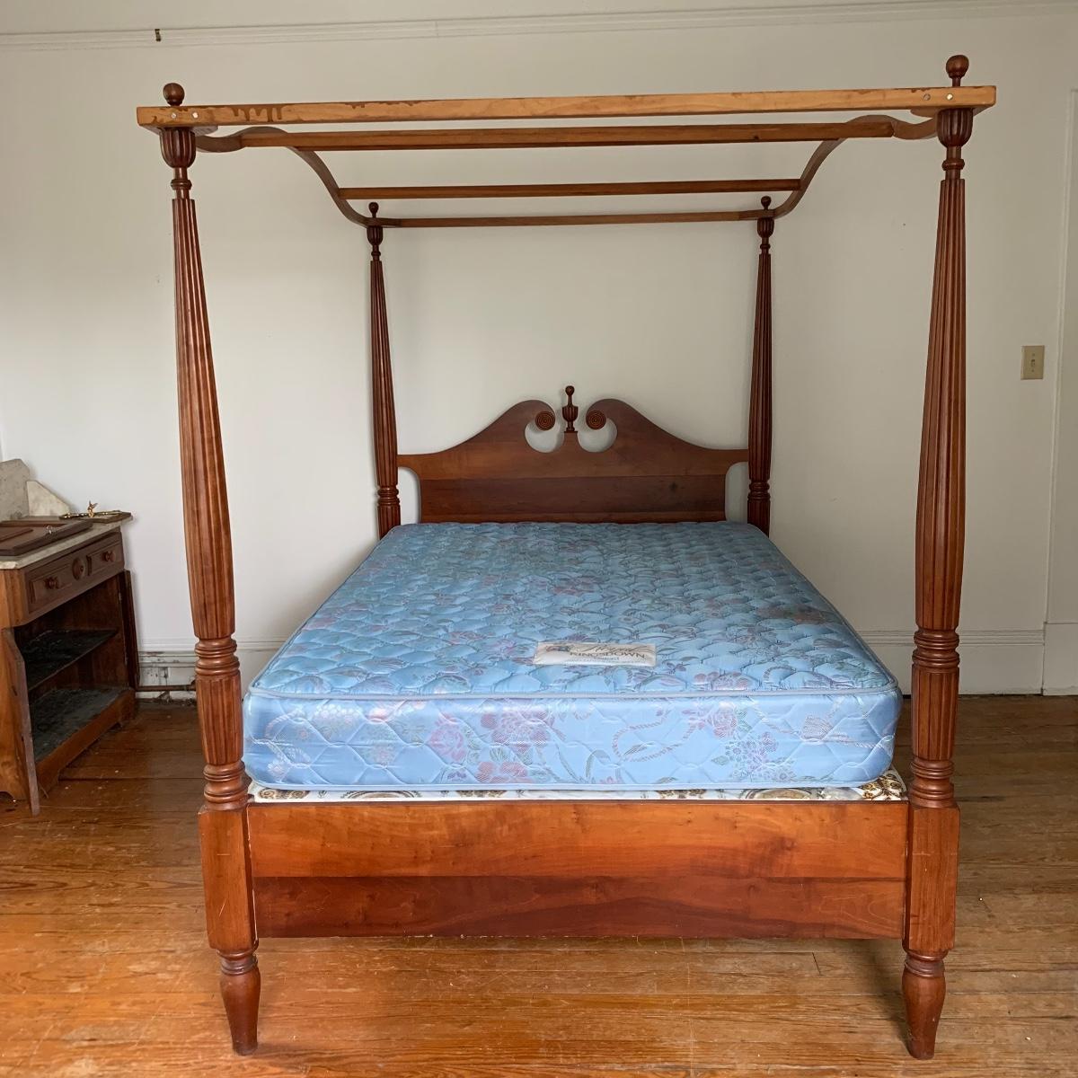 This is an ornate four poster wooden bed frame with an easily removable canopy top. It is a full/double sized frame. It has a pediment style headboard with a finial decoration. The canopy top can be removed simply by lifting it off of the top of the posts. The frame is a bit heavy. The winning bidder will need to move it from the second floor of the house and will require help. The frame measures 57” x 81” x 74”. A flathead screwdriver will be required to disassemble the frame (please see pictures of hardware). The two boards supporting the box spring are not attached. Bedding pictured is not included. The winning bidder may have the mattress and box spring if desired (please let Sterling Transitions know if you’d like these before you come for auction pickup). The height of the top of the current mattress is the frame is about 30” tall. The bed frame is in used, but sturdy condition. It shows it’s age with some wear, but is otherwise in very good condition. Local Pickup Only